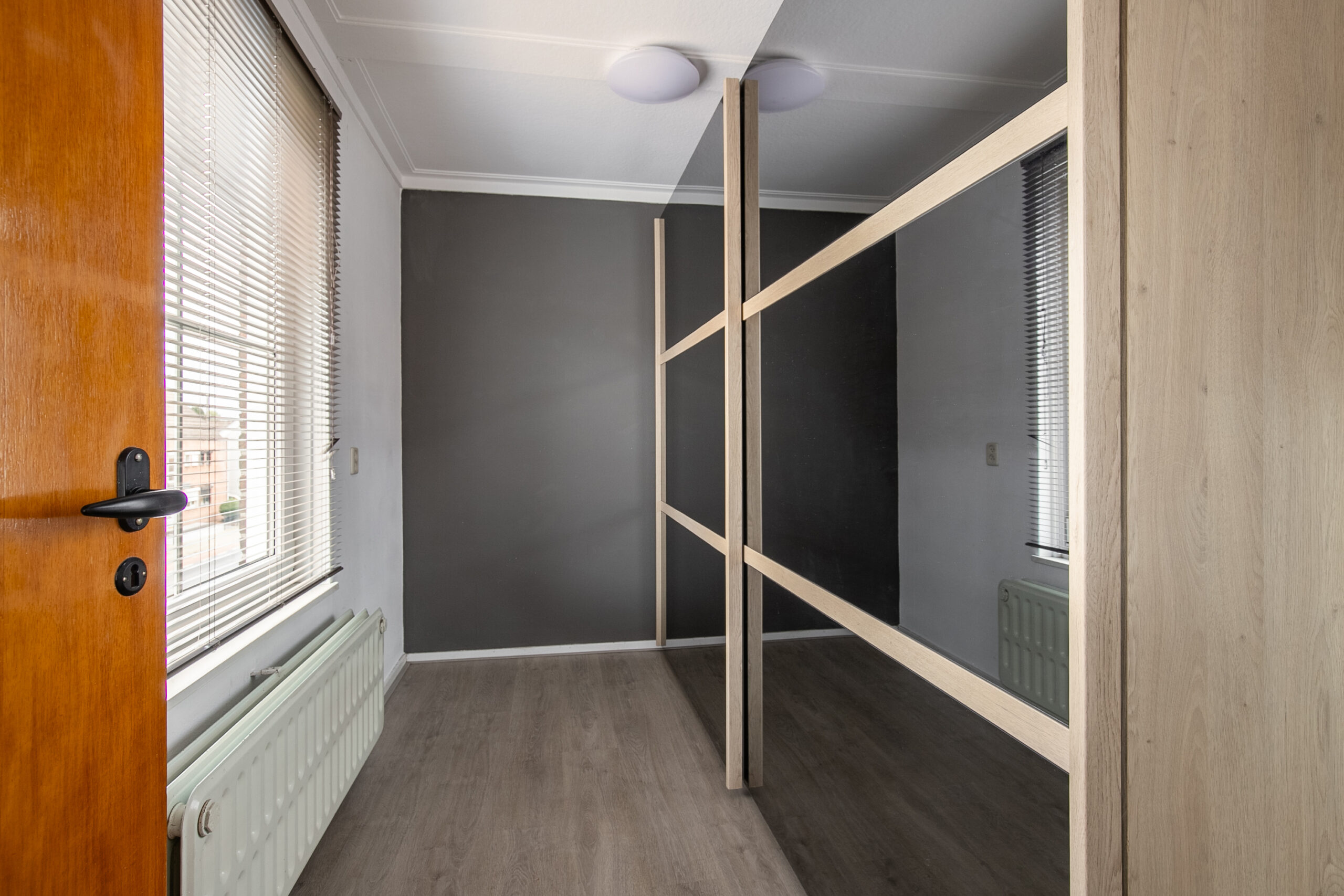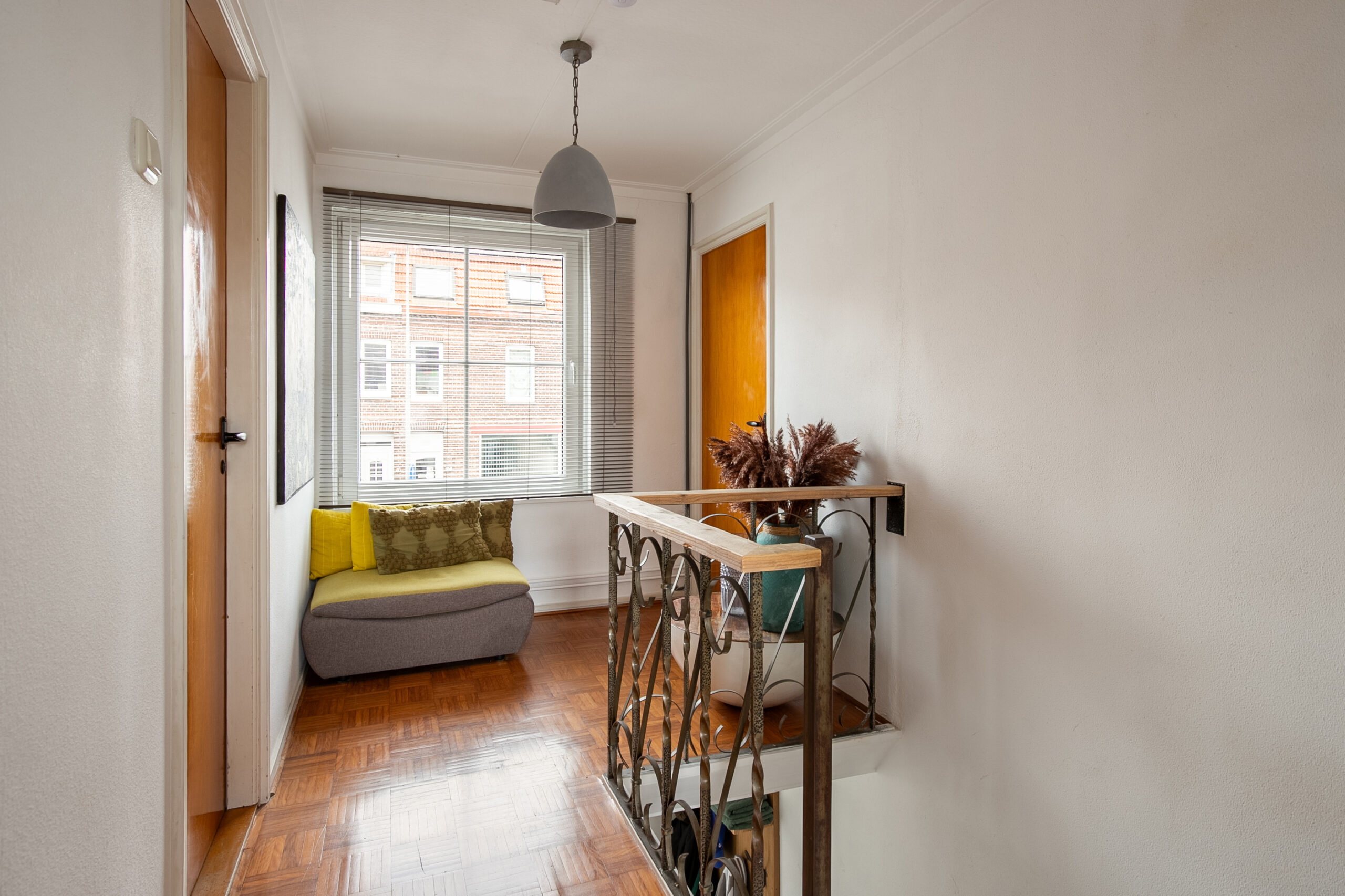 Ruime/lichte overloop, voorzien van een eiken parketvloer met directe toegang tot twee slaapkamers, welke respectievelijk groot zijn: