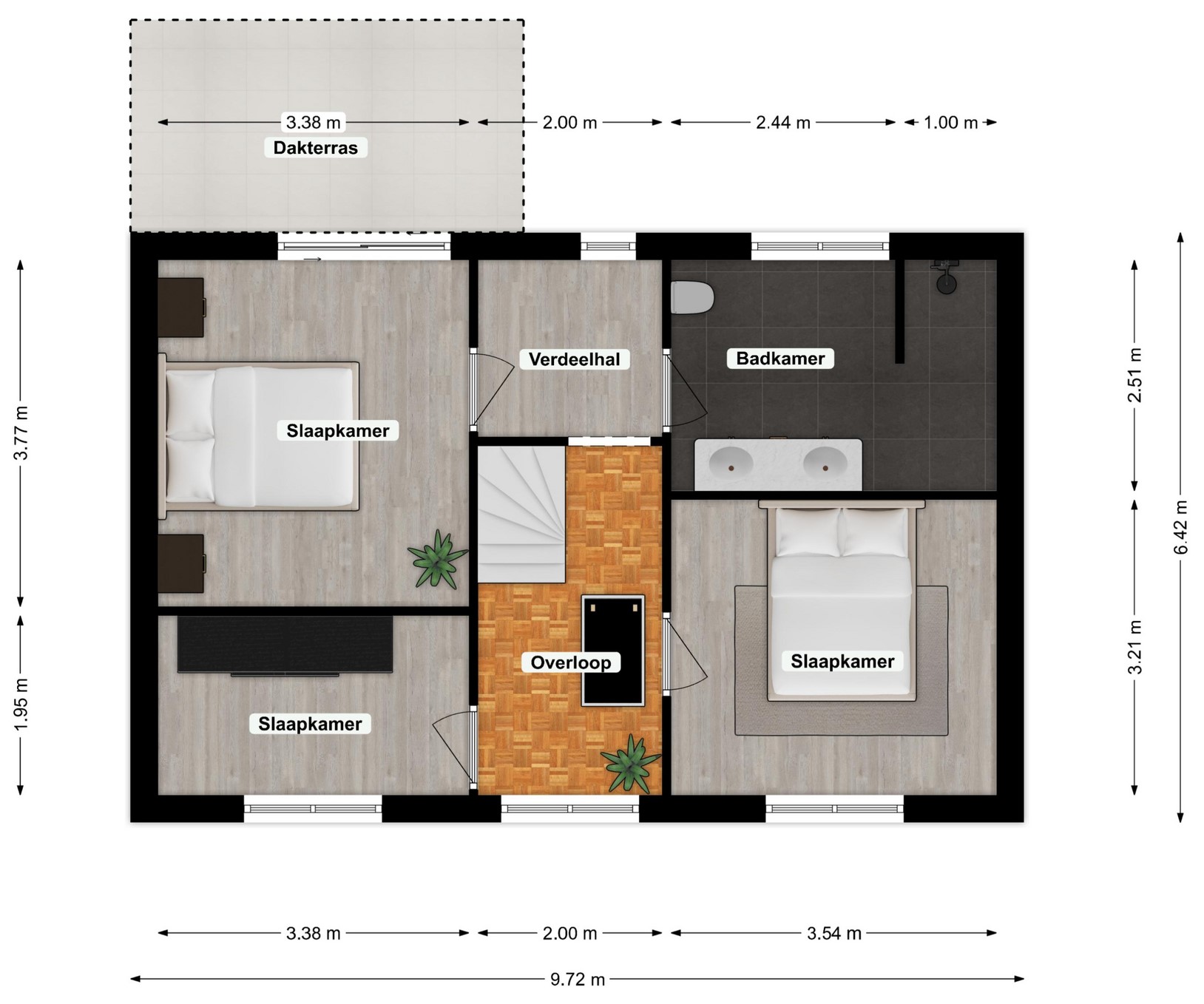 1) 3.77m x 3.38 m, met toegang tot dakterras.
