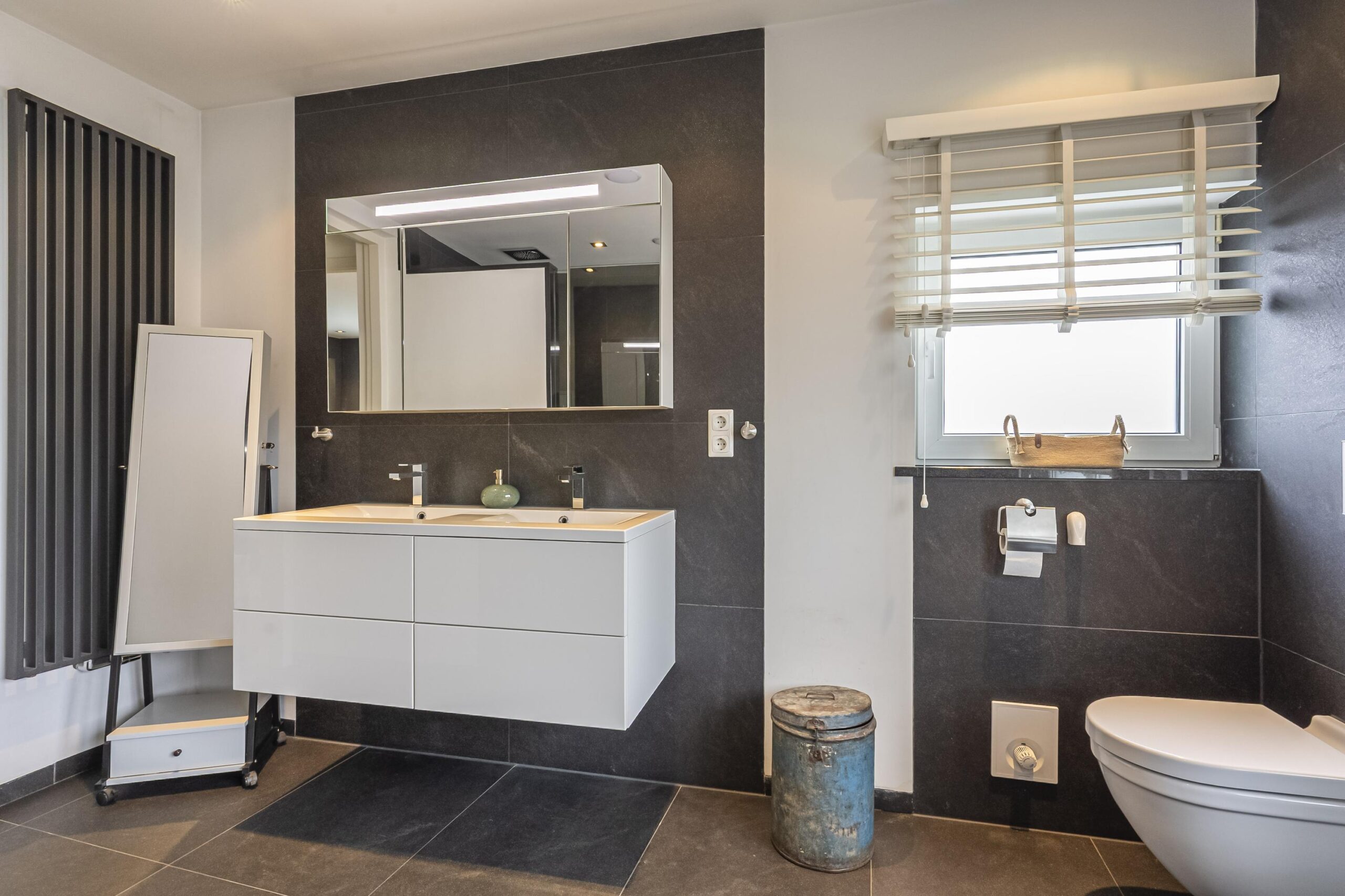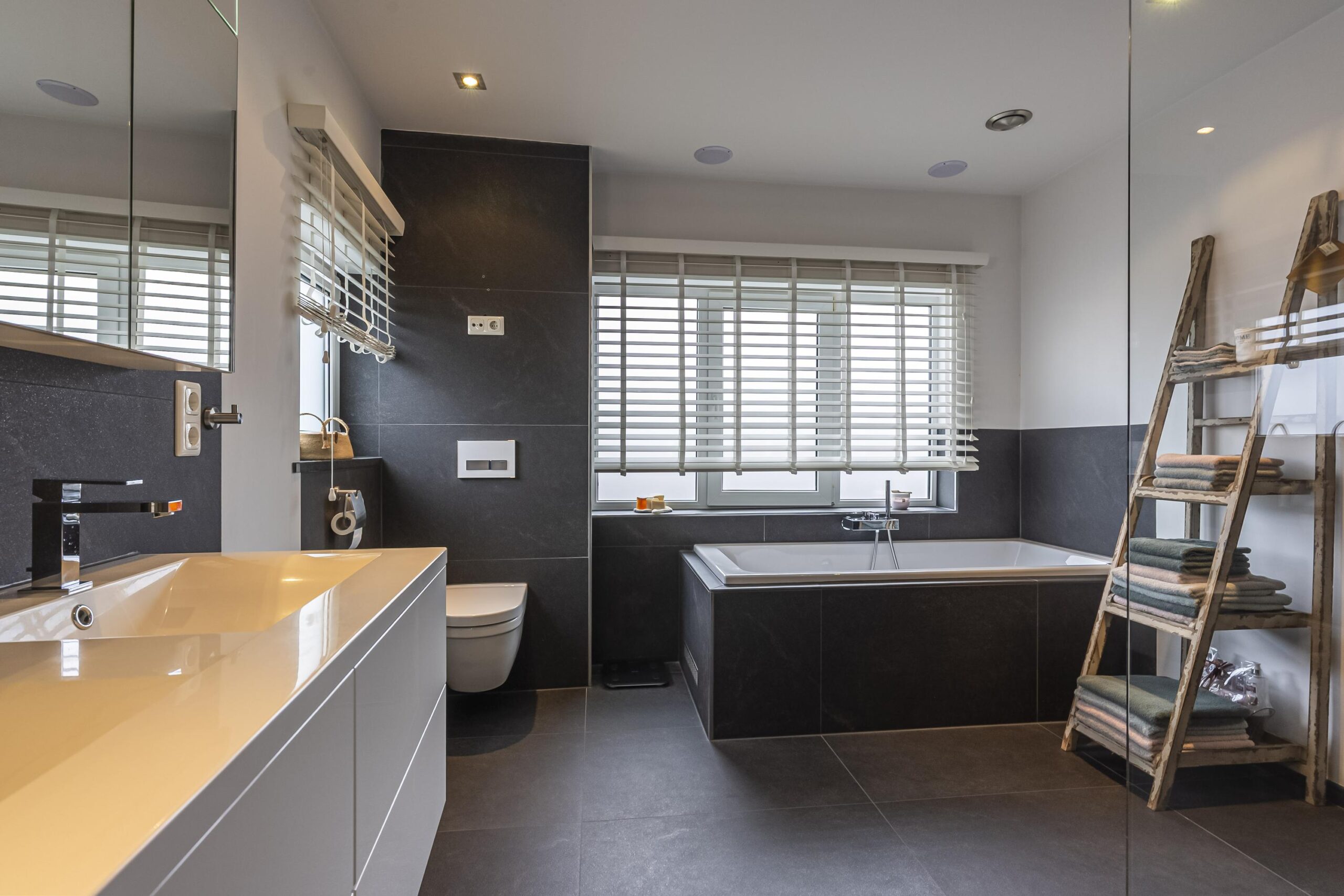 - Badkamervoorzieningen Ligbad, toilet, dubbele wastafel, inloopdouche, vloerverwarming