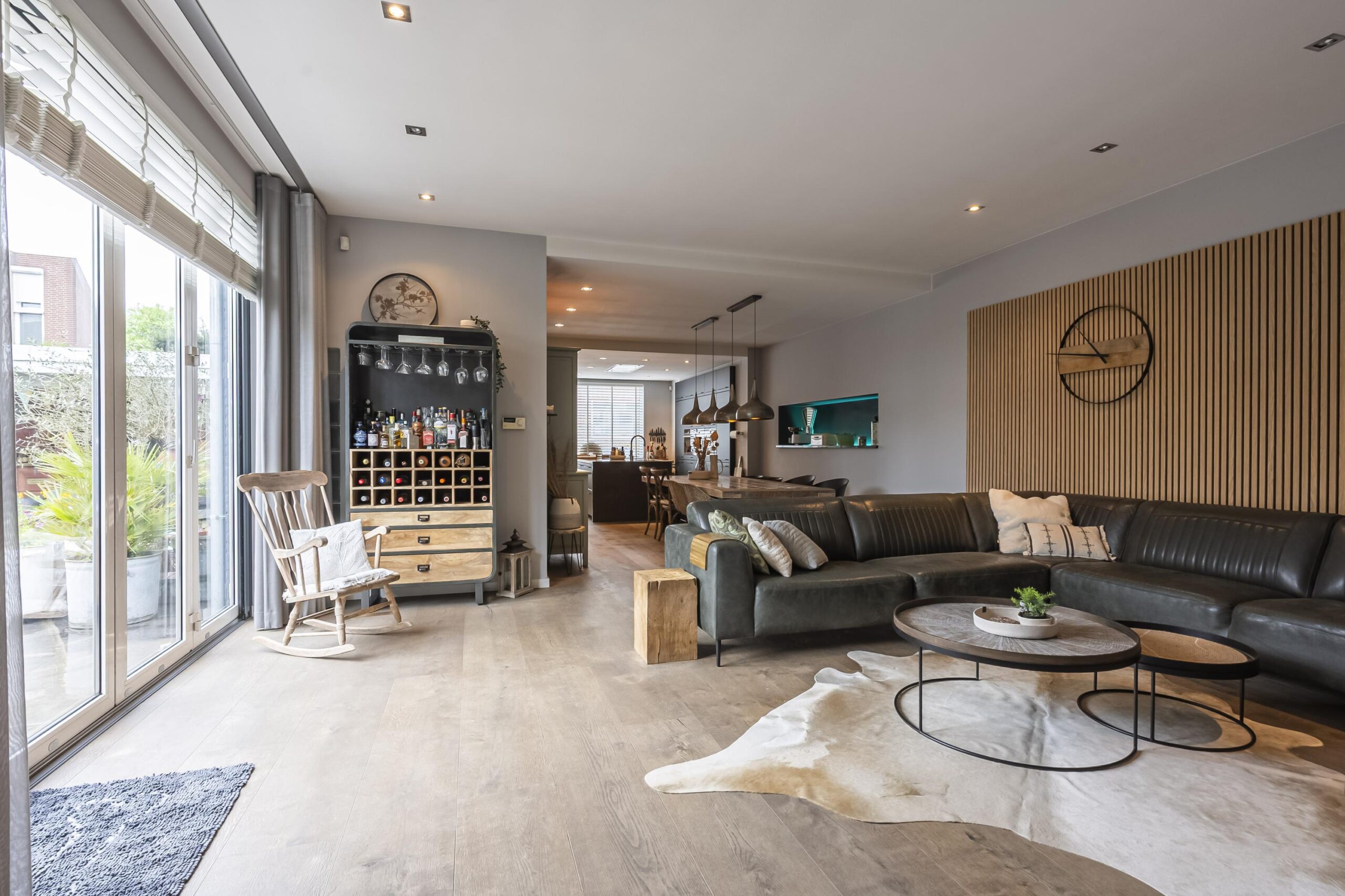 Vanuit de hal bereikt u de riante, open leefruimte waar sfeer en functionaliteit hand in hand gaan. Dankzij de hoge plafonds en grote harmonica pui aan de tuinzijde geniet de woonkamer van een royale lichtinval en optimaal tuincontact.