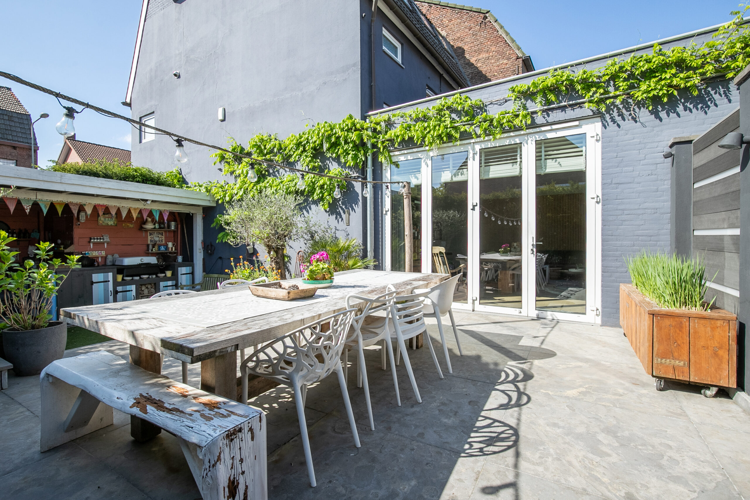 De fraai aangelegde, onderhoudsvriendelijke zijtuin is bereikbaar via de harmonica pui in de woonkamer en biedt veel privacy. De tuin is gesitueerd op het noordoosten, voorzien van een achterom en een robuuste buitenkeuken onder een overkapping – ideaal voor lange zomeravonden en gezellig buiten koken.