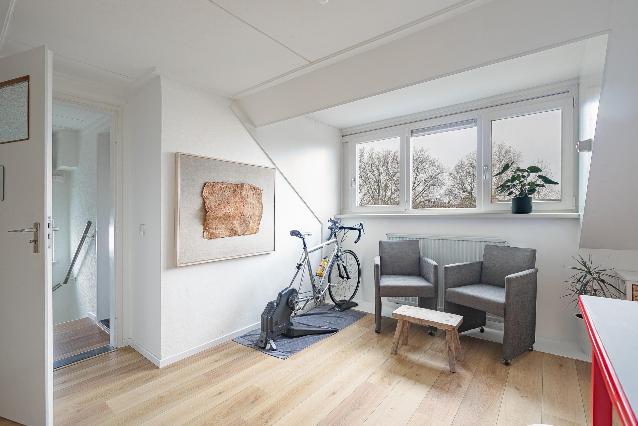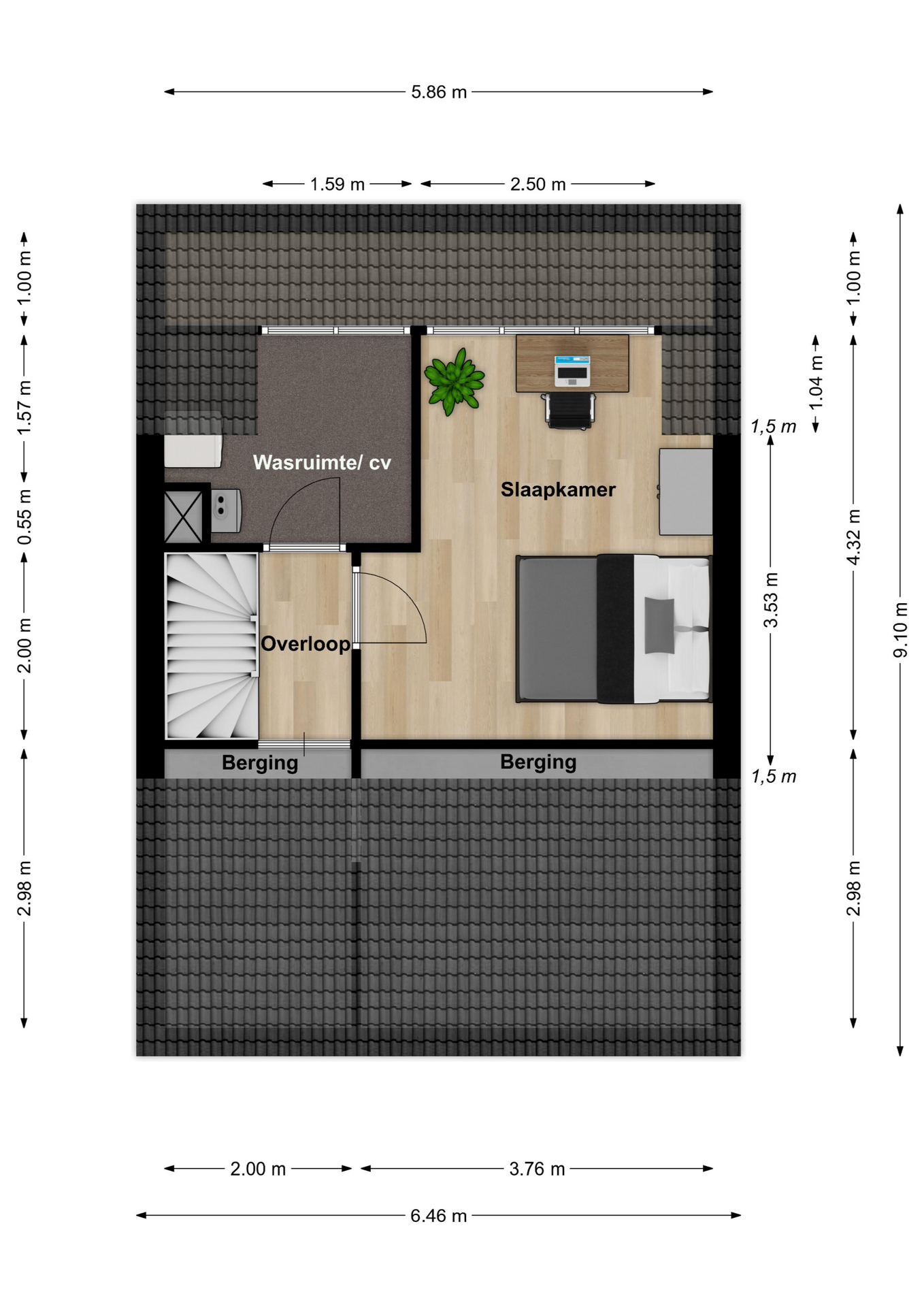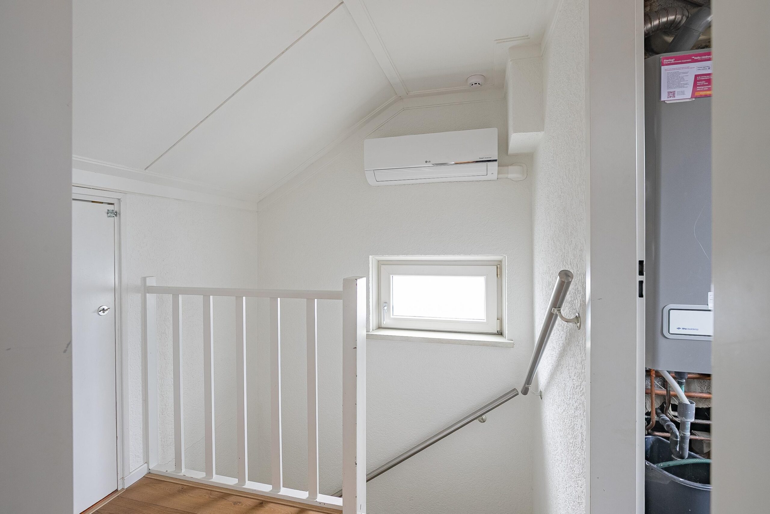 Middels vaste trap bereikbare overloop met laminaatvloer en airco-unit. Berging onder schuine kap. CV-/wasruimte (ca. 4 m2) met witgoedaansluitingen en Intergas combiketel (2026, huur met optie tot afkoop). Tot slot slaapkamer 4 (ca. 13 m2 met stahoogte > 1,50 meter) met laminaatvloer en dakkapel aan de achterzijde.