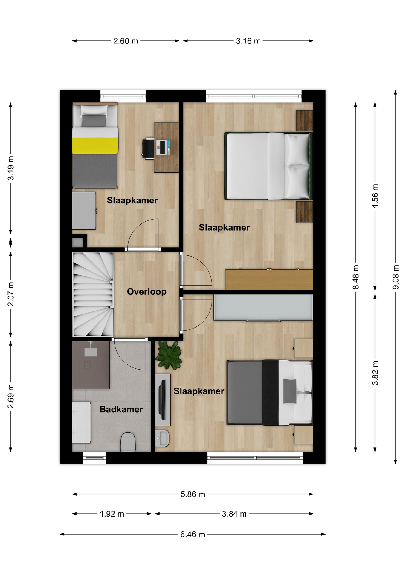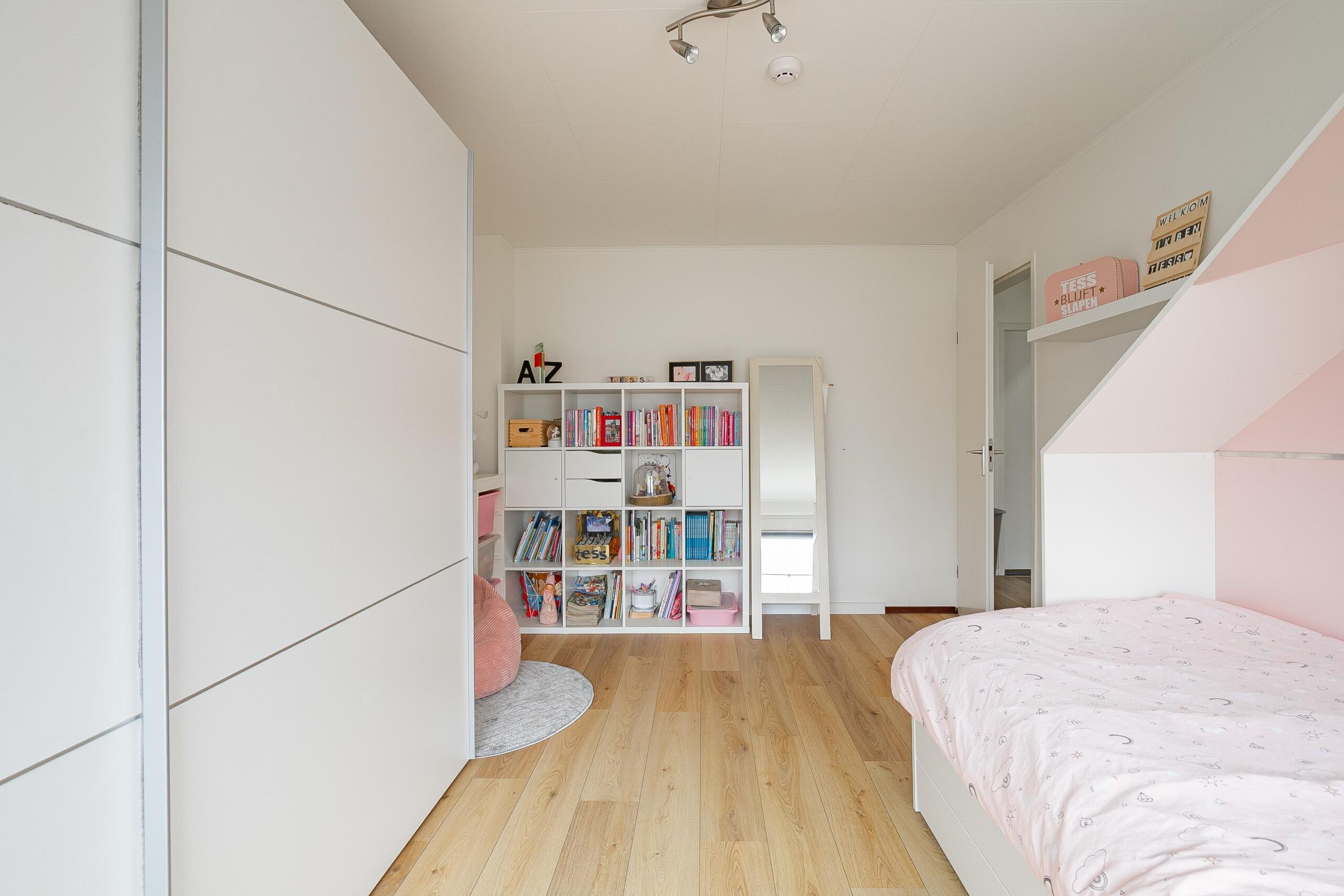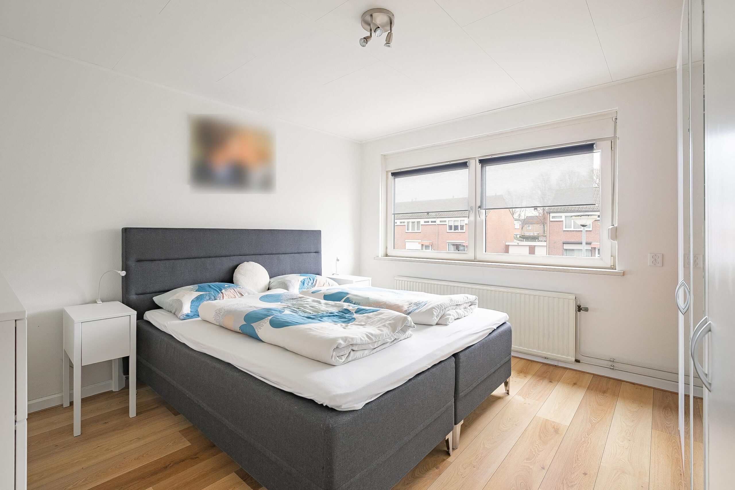 Ruime overloop met nette laminaatvloer en stucwerk. Drie slaapkamers, resp. groot ca. 14.5/14/9 m2 met laminaatvloer, glad stucwerk, verlaagde plafonds met strakke agnes platen. De voorste kamer beschikt tevens over een handige wastafel. Verder de volledig betegelde luxe badkamer (ca. 5 m2) uit 2020 met inloopdouche, hangcloset, breed wastafelmeubel met lades en twee kommen, elektrische vloerverwarming en inbouwspots.