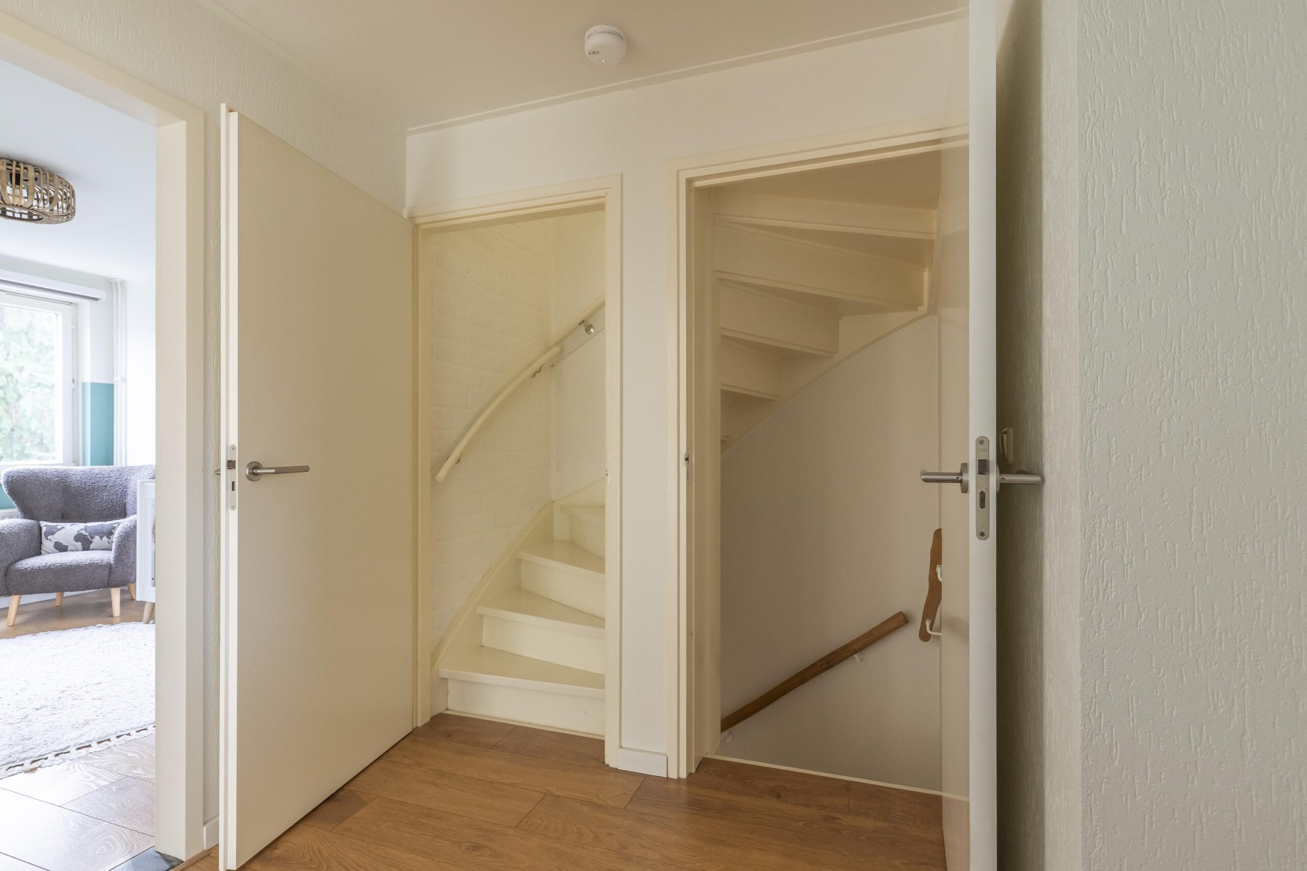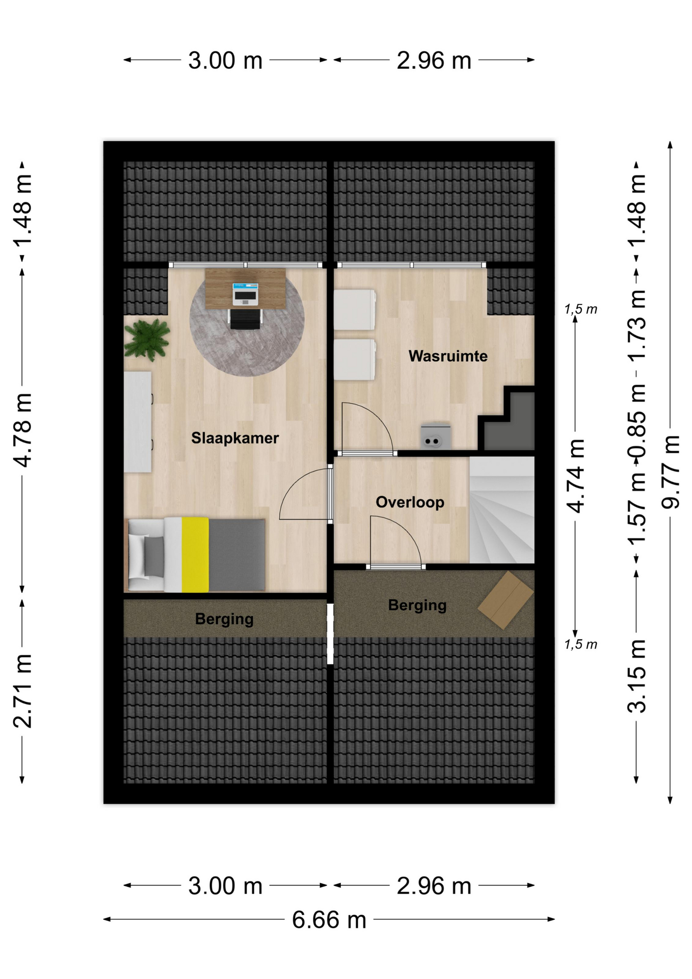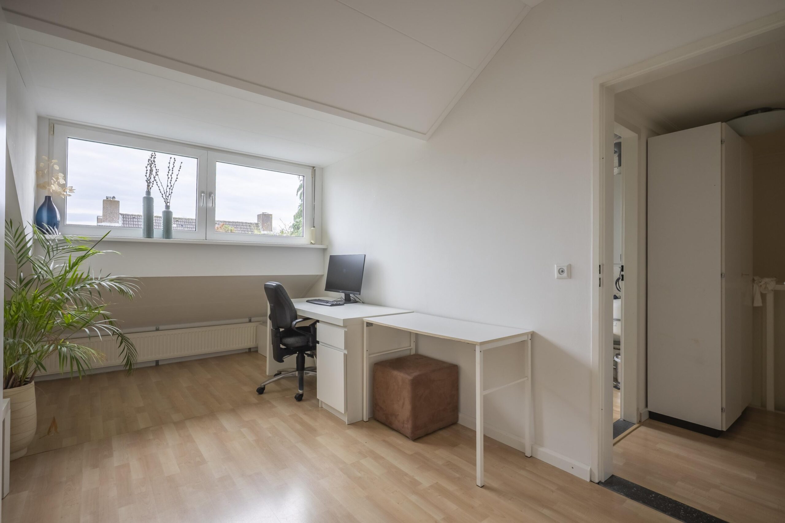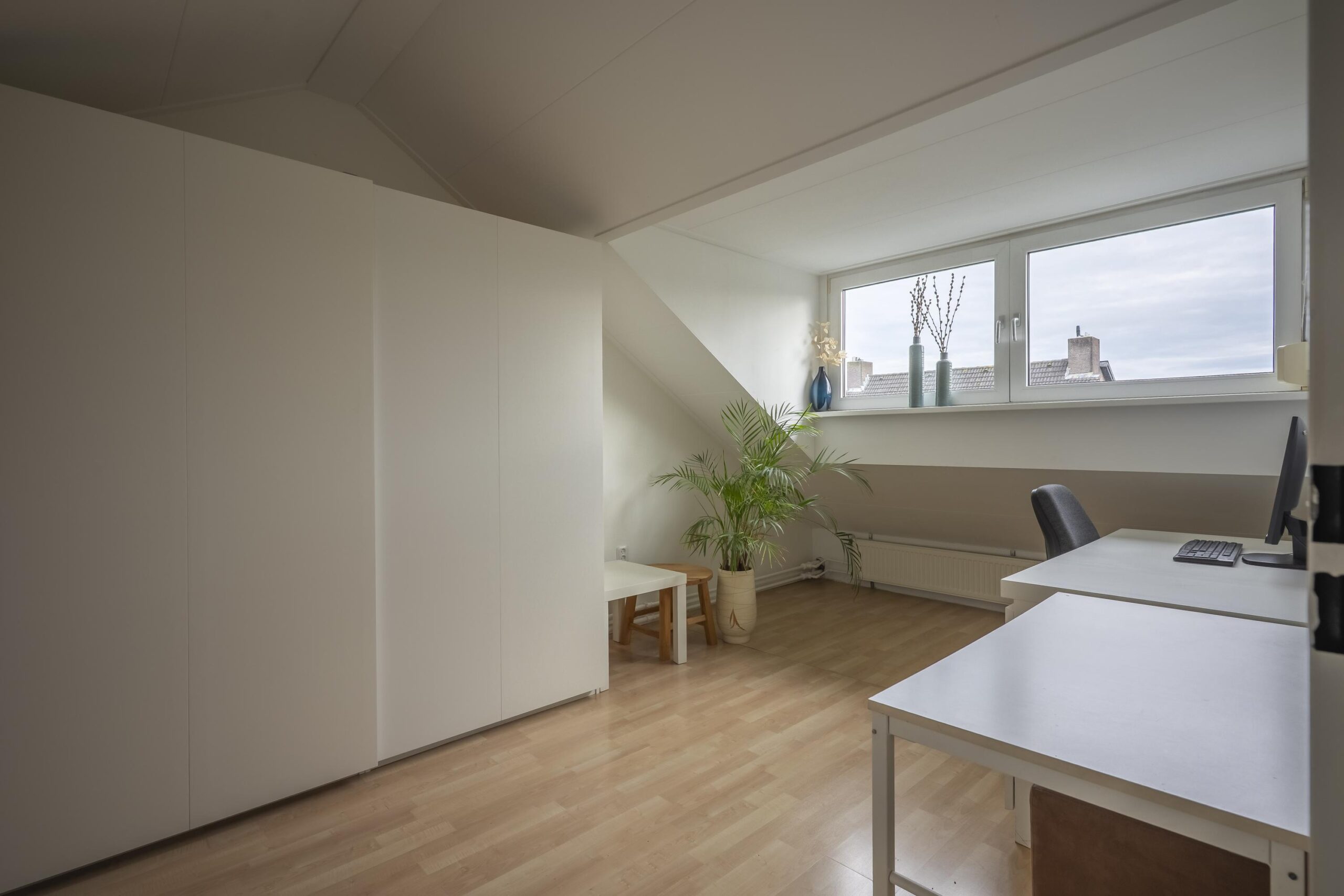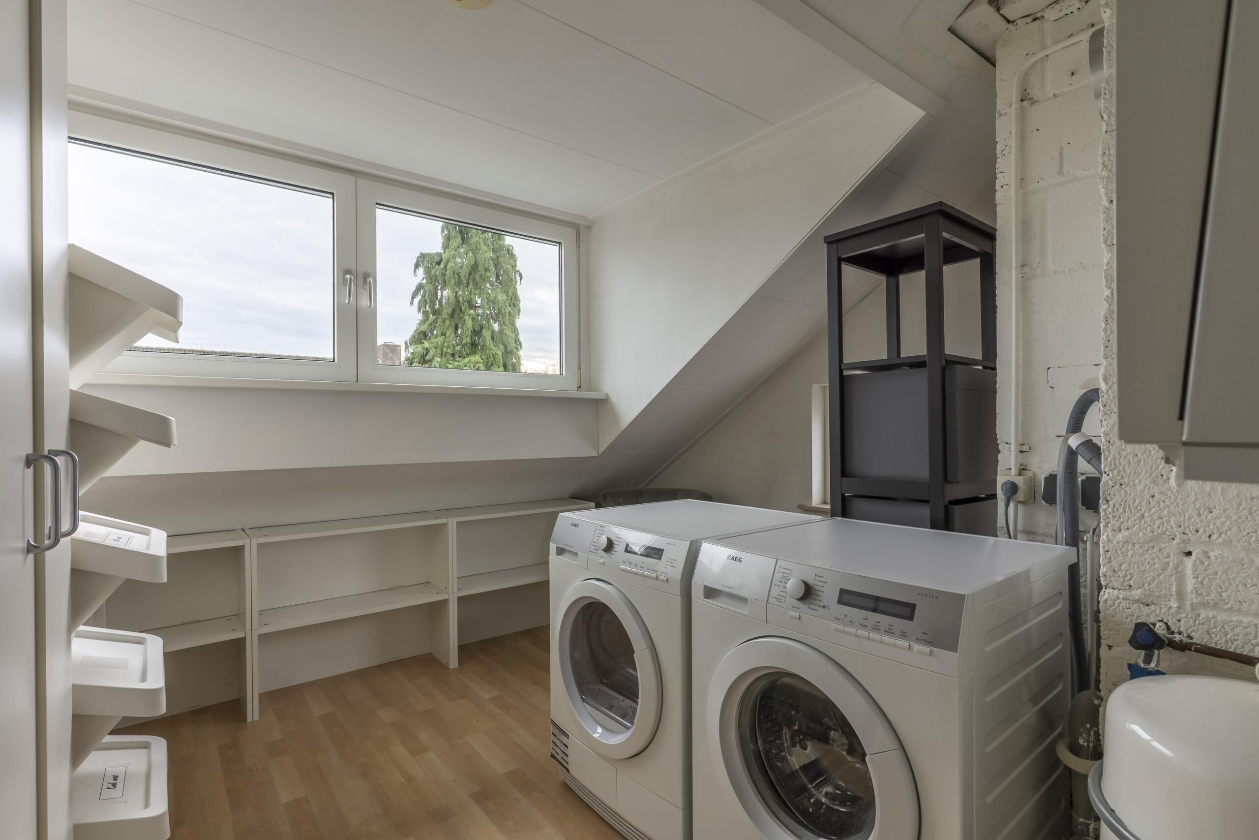 Middels vaste trap bereikbare overloop met toegang tot ruime berging over de volle breedte aan de voorzijde van het pand. Wasruimte/berging (ca. 7 m2) met laminaatvloer, witgoedaansluitingen, dakkapel en opstelling Nefit combiketel (2017, eigendom). Tot slot slaapkamer 4 (ca. 13 m2 met stahoogte > 1,50 meter) met laminaatvloer, fijn spuitwerk en dakkapel.