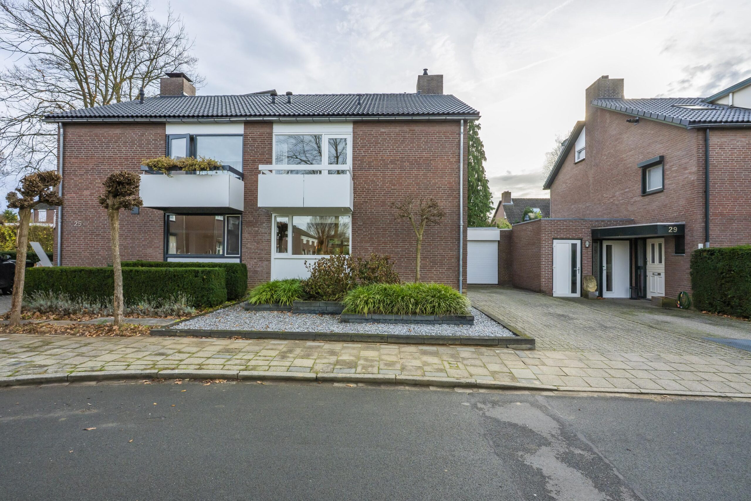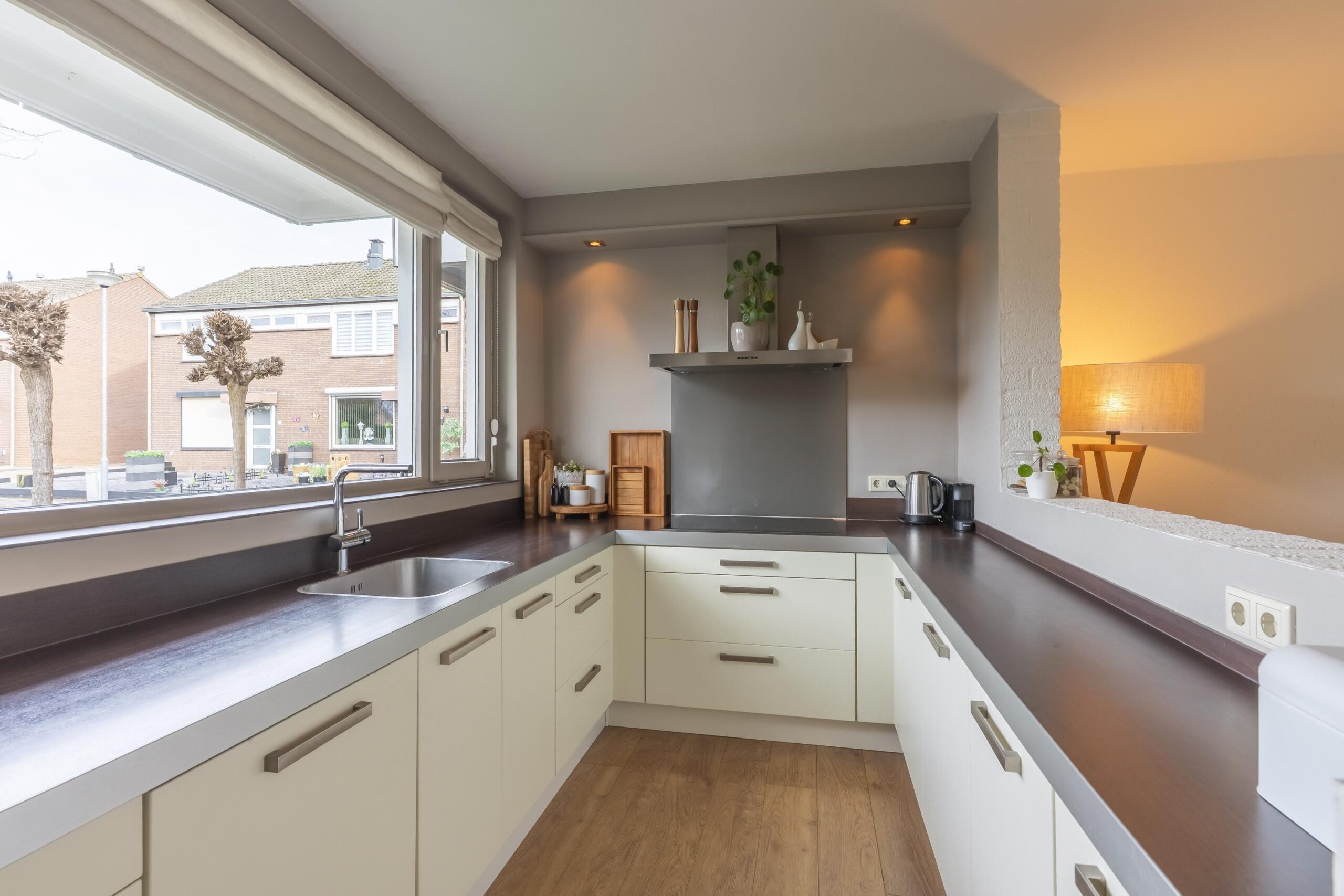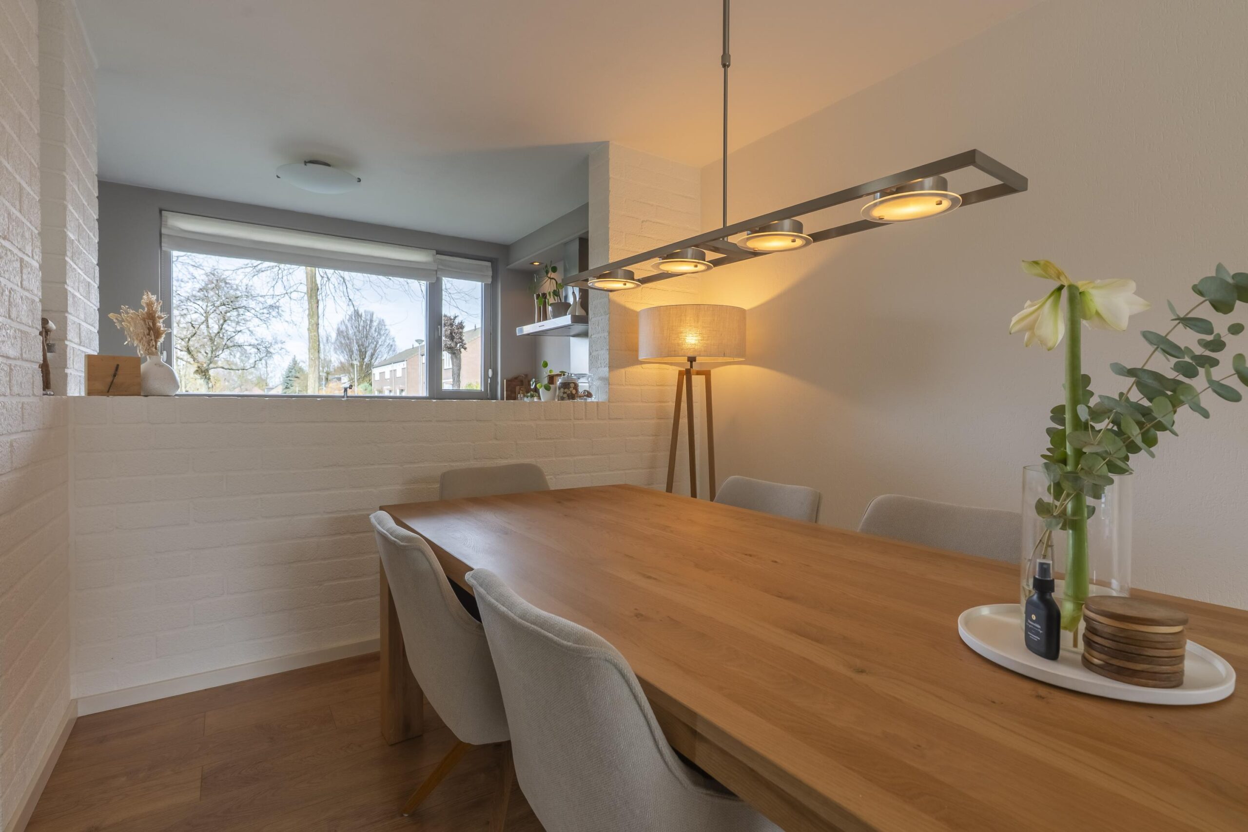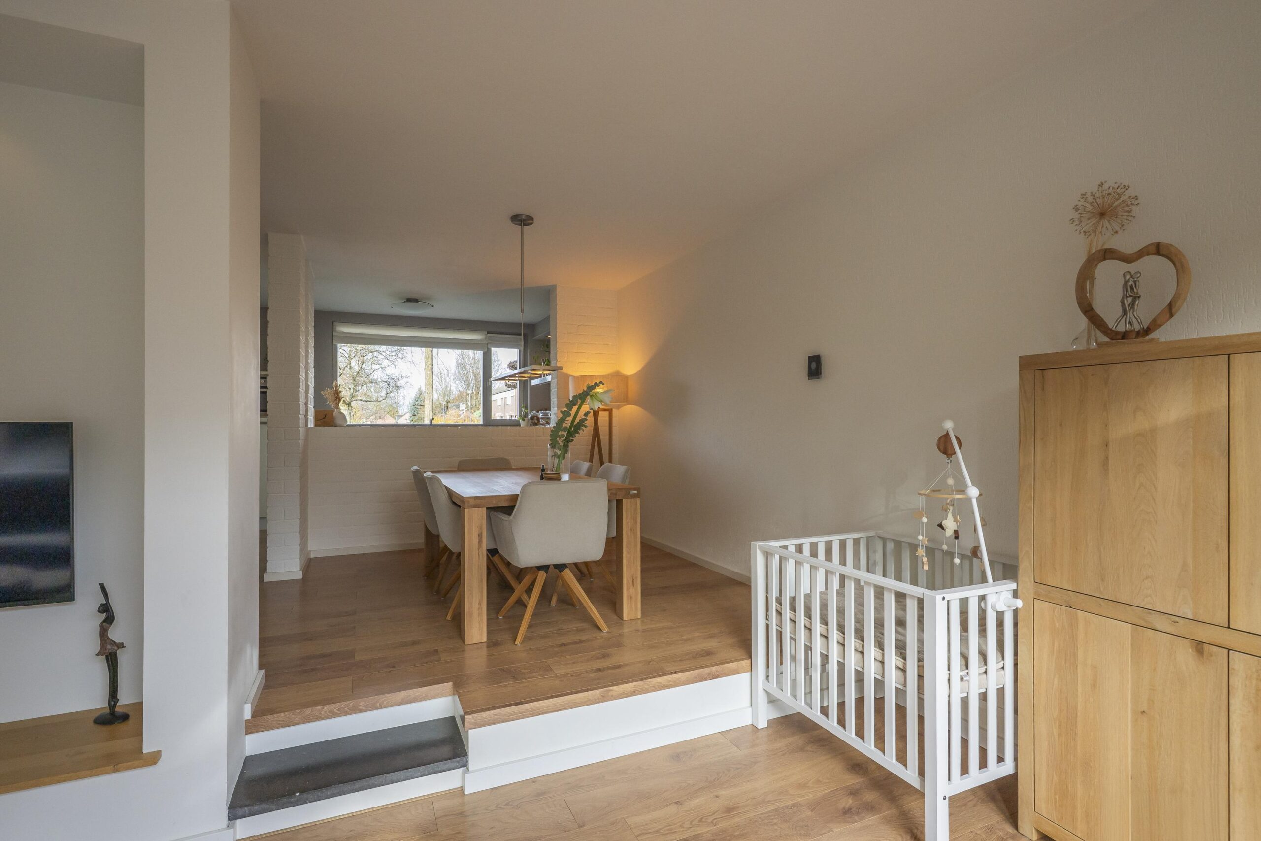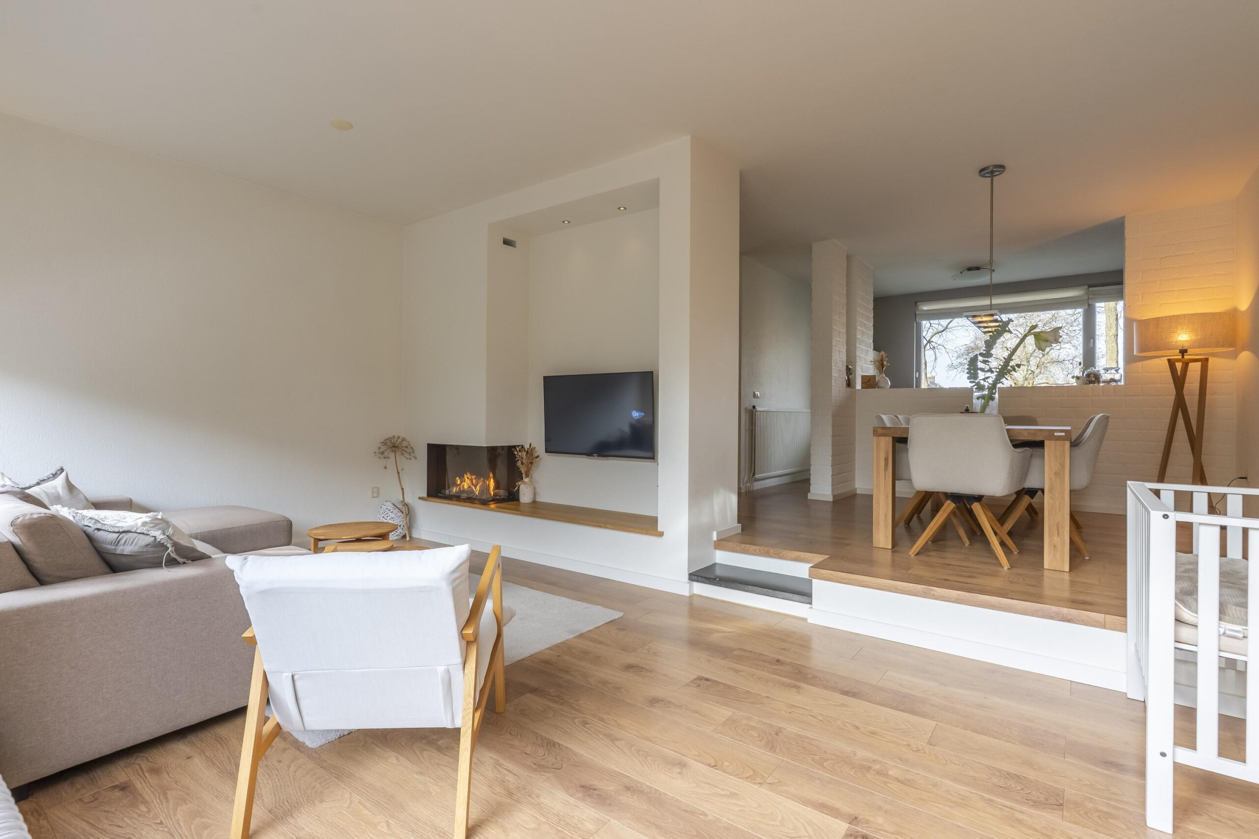 Oprit voor het stallen van meerdere voertuigen en verzorgd aangelegde voortuin. Entree/hal met nette laminaatvloer en vernieuwde meterkast. Moderne en volledig betegelde toiletruimte met hangcloset en fonteintje. Keuken aan de voorzijde met U-vormige opstelling v.v. combi-oven, koelkast, vaatwasser, 4-pits keramische kookplaat en afzuigkap. Woonkamer in L-vorm v.v. laminaatvloer verdeeld over twee niveaus met centraal gelegen de eetkamer, trapkast en trap naar verdieping. In de verdiepte zitkuil is het zit-/tv-gedeelte gesitueerd met grote glaspartijen naar de tuin en sfeervolle gashaard. In totaliteit is de living ca. 47 m2 groot! De privacyvolle en zonnig op het zuiden gelegen tuin beschikt over een fijn terras met zonnescherm en verder een fijn grasveld, tweede zitje achterin en fraaie en gevarieerde aanplant rondom. Tot slot de garage (ca. 20 m2) met elektrische sectionaalpoort en aanrechtblokje met wateraansluiting.