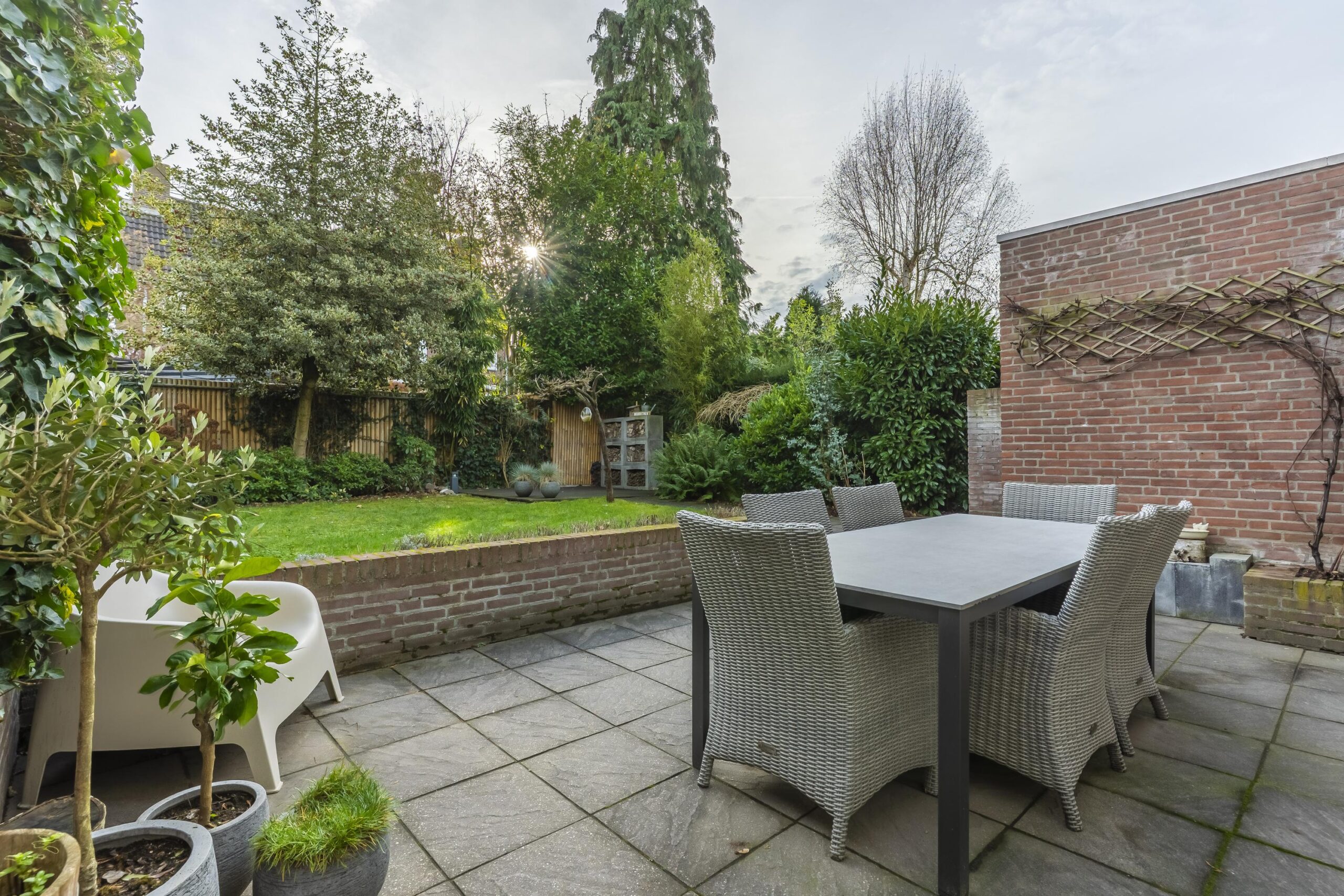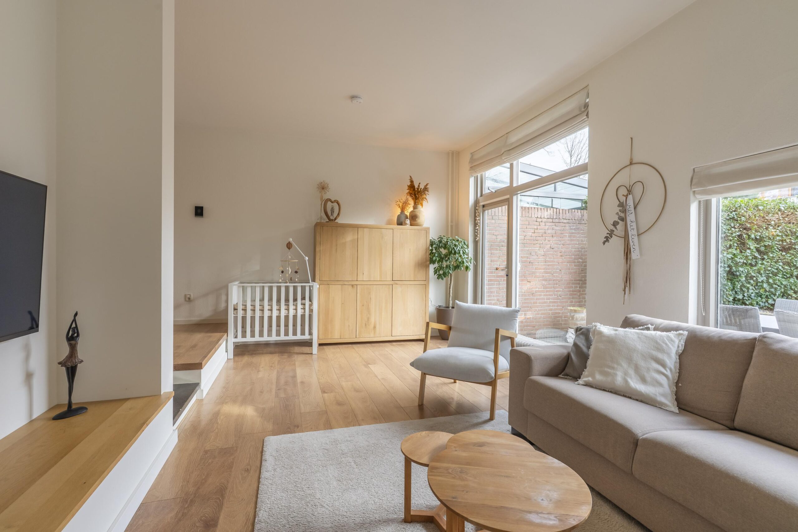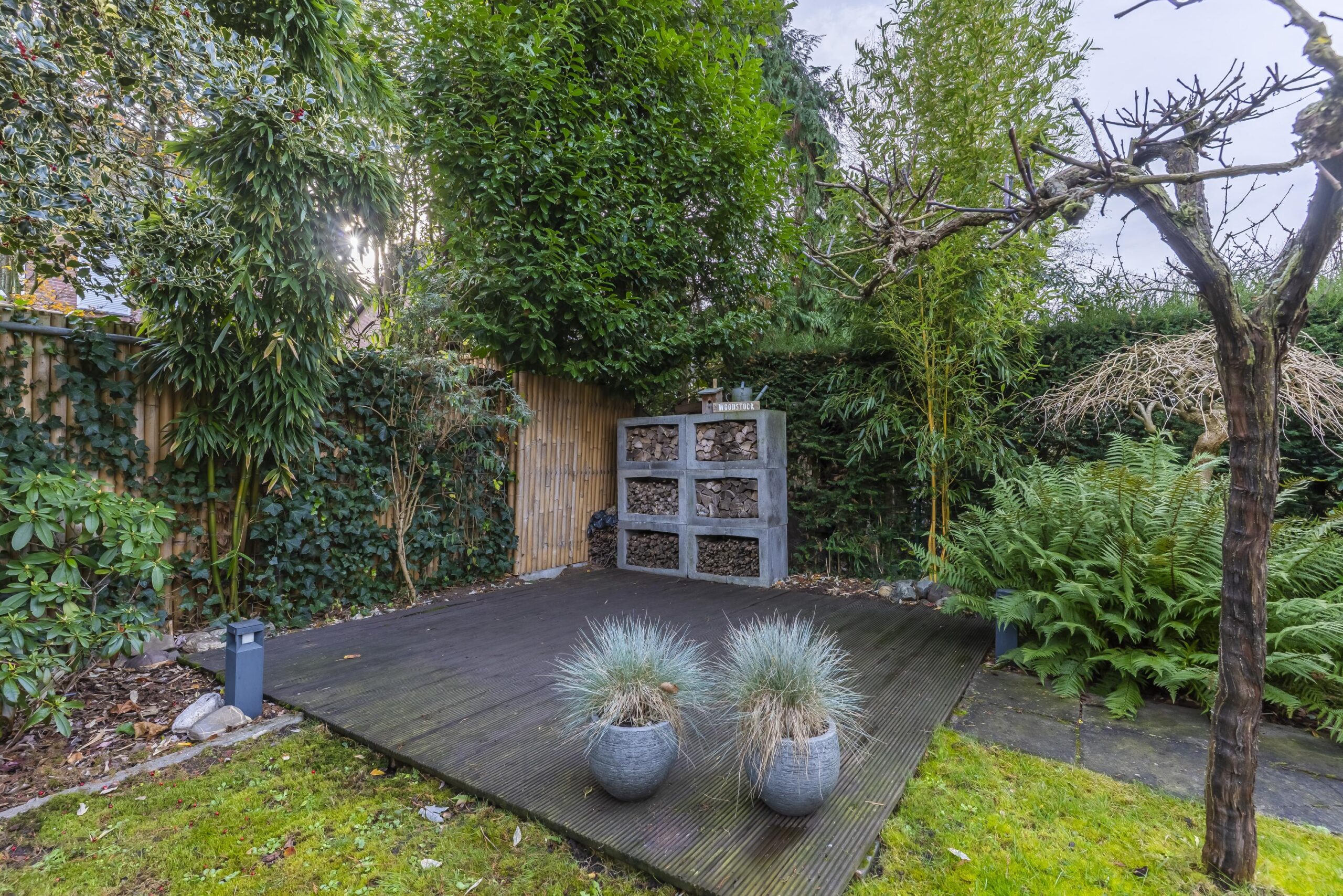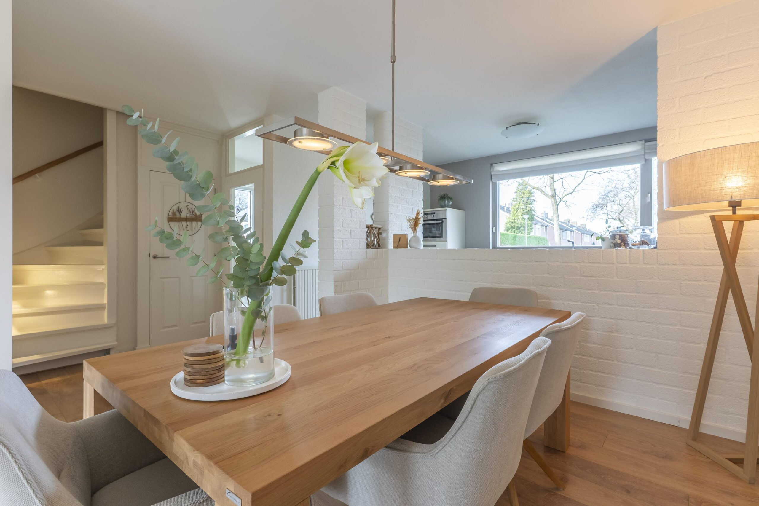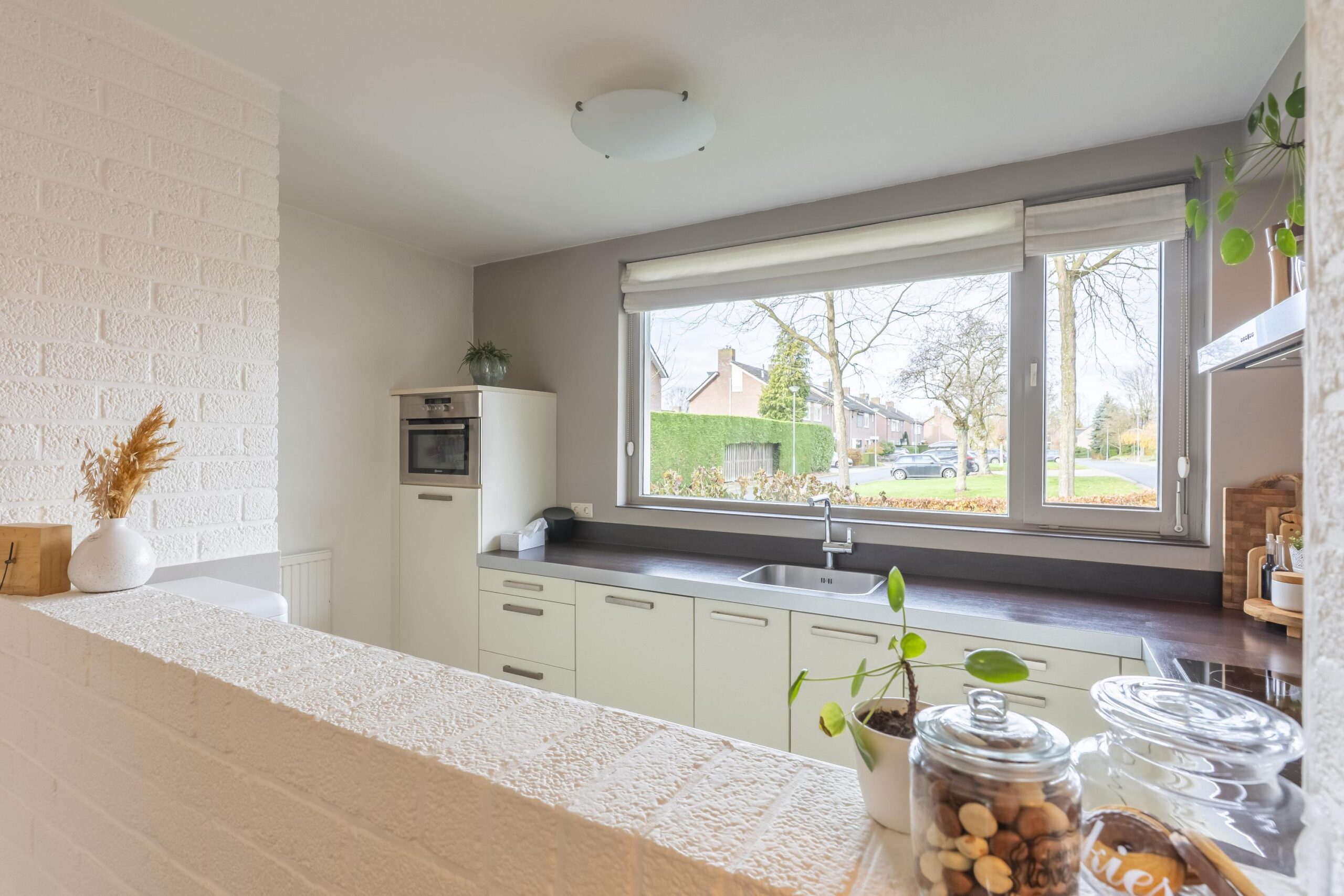 Oprit voor het stallen van meerdere voertuigen en verzorgd aangelegde voortuin. Entree/hal met nette laminaatvloer en vernieuwde meterkast. Moderne en volledig betegelde toiletruimte met hangcloset en fonteintje. Keuken aan de voorzijde met U-vormige opstelling v.v. combi-oven, koelkast, vaatwasser, 4-pits keramische kookplaat en afzuigkap. Woonkamer in L-vorm v.v. laminaatvloer verdeeld over twee niveaus met centraal gelegen de eetkamer, trapkast en trap naar verdieping. In de verdiepte zitkuil is het zit-/tv-gedeelte gesitueerd met grote glaspartijen naar de tuin en sfeervolle gashaard. In totaliteit is de living ca. 47 m2 groot! De privacyvolle en zonnig op het zuiden gelegen tuin beschikt over een fijn terras met zonnescherm en verder een fijn grasveld, tweede zitje achterin en fraaie en gevarieerde aanplant rondom. Tot slot de garage (ca. 20 m2) met elektrische sectionaalpoort en aanrechtblokje met wateraansluiting.