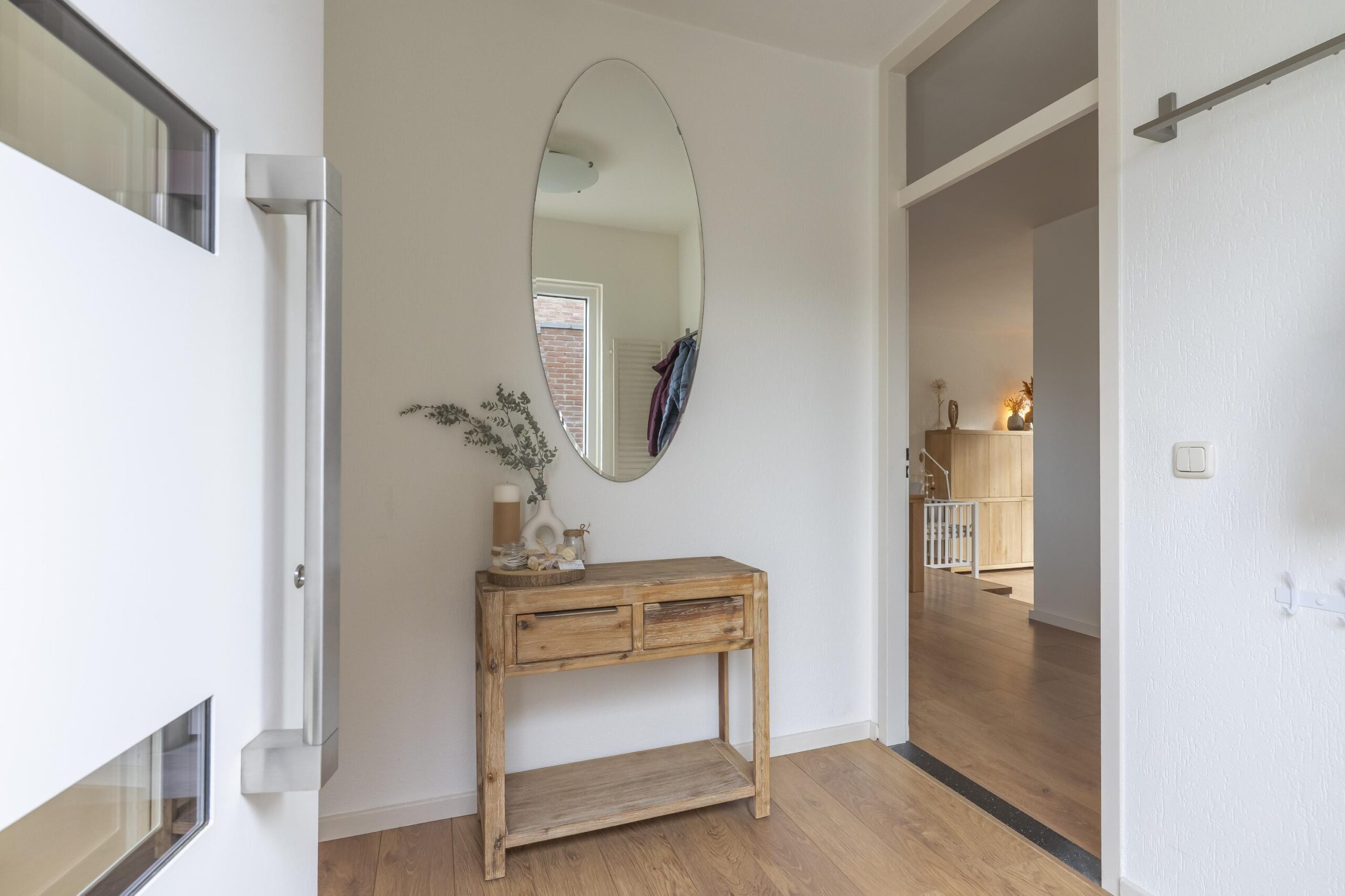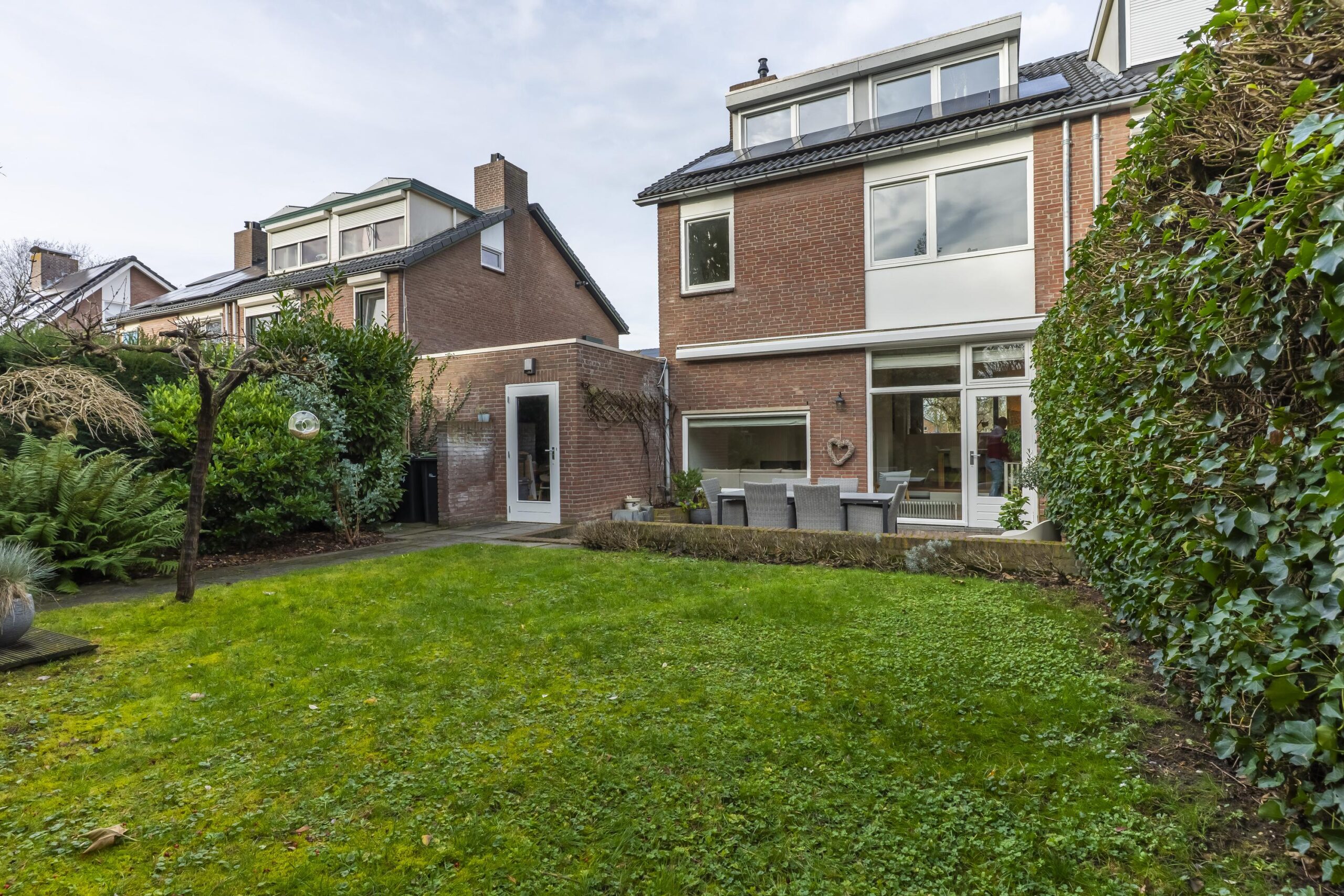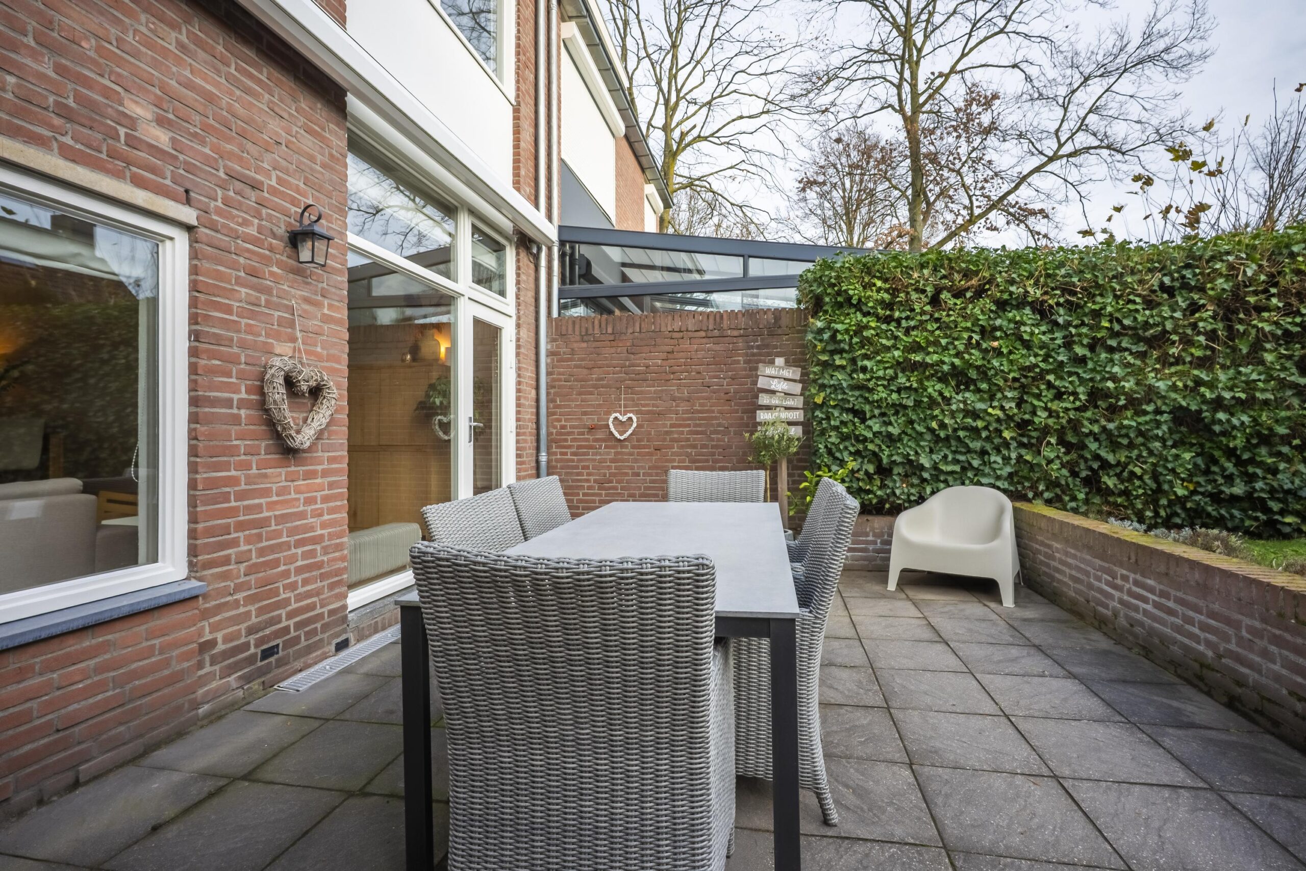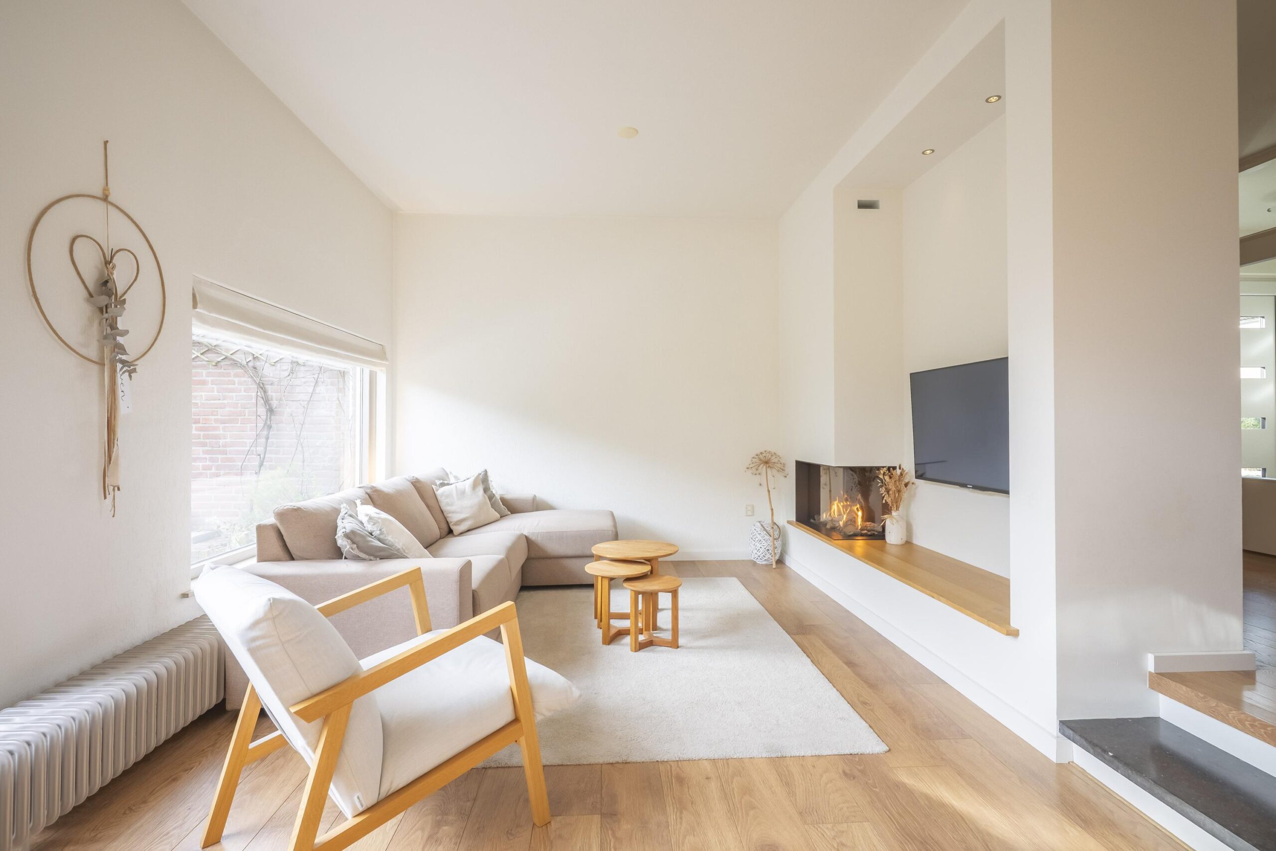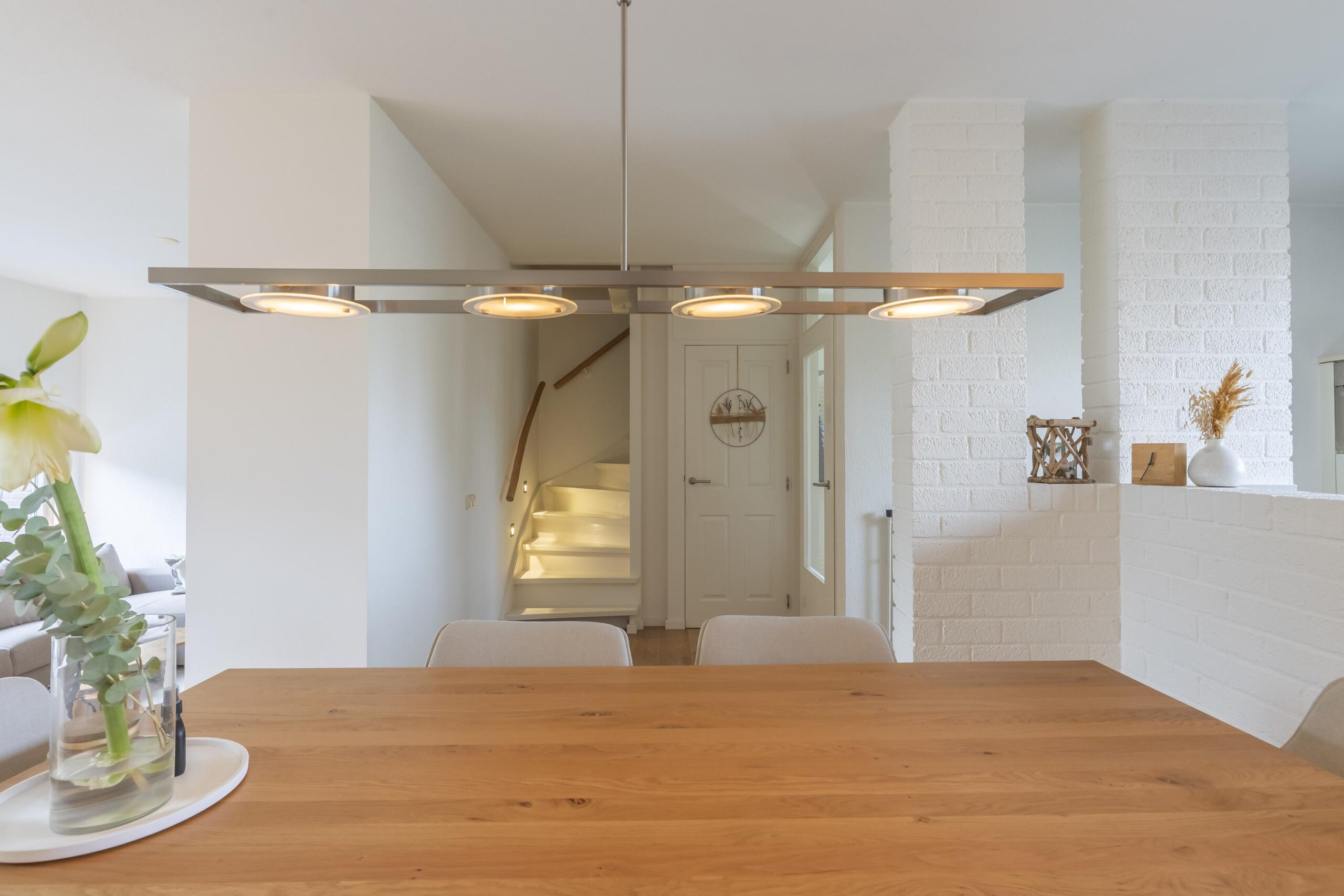 Oprit voor het stallen van meerdere voertuigen en verzorgd aangelegde voortuin. Entree/hal met nette laminaatvloer en vernieuwde meterkast. Moderne en volledig betegelde toiletruimte met hangcloset en fonteintje. Keuken aan de voorzijde met U-vormige opstelling v.v. combi-oven, koelkast, vaatwasser, 4-pits keramische kookplaat en afzuigkap. Woonkamer in L-vorm v.v. laminaatvloer verdeeld over twee niveaus met centraal gelegen de eetkamer, trapkast en trap naar verdieping. In de verdiepte zitkuil is het zit-/tv-gedeelte gesitueerd met grote glaspartijen naar de tuin en sfeervolle gashaard. In totaliteit is de living ca. 47 m2 groot! De privacyvolle en zonnig op het zuiden gelegen tuin beschikt over een fijn terras met zonnescherm en verder een fijn grasveld, tweede zitje achterin en fraaie en gevarieerde aanplant rondom. Tot slot de garage (ca. 20 m2) met elektrische sectionaalpoort en aanrechtblokje met wateraansluiting.