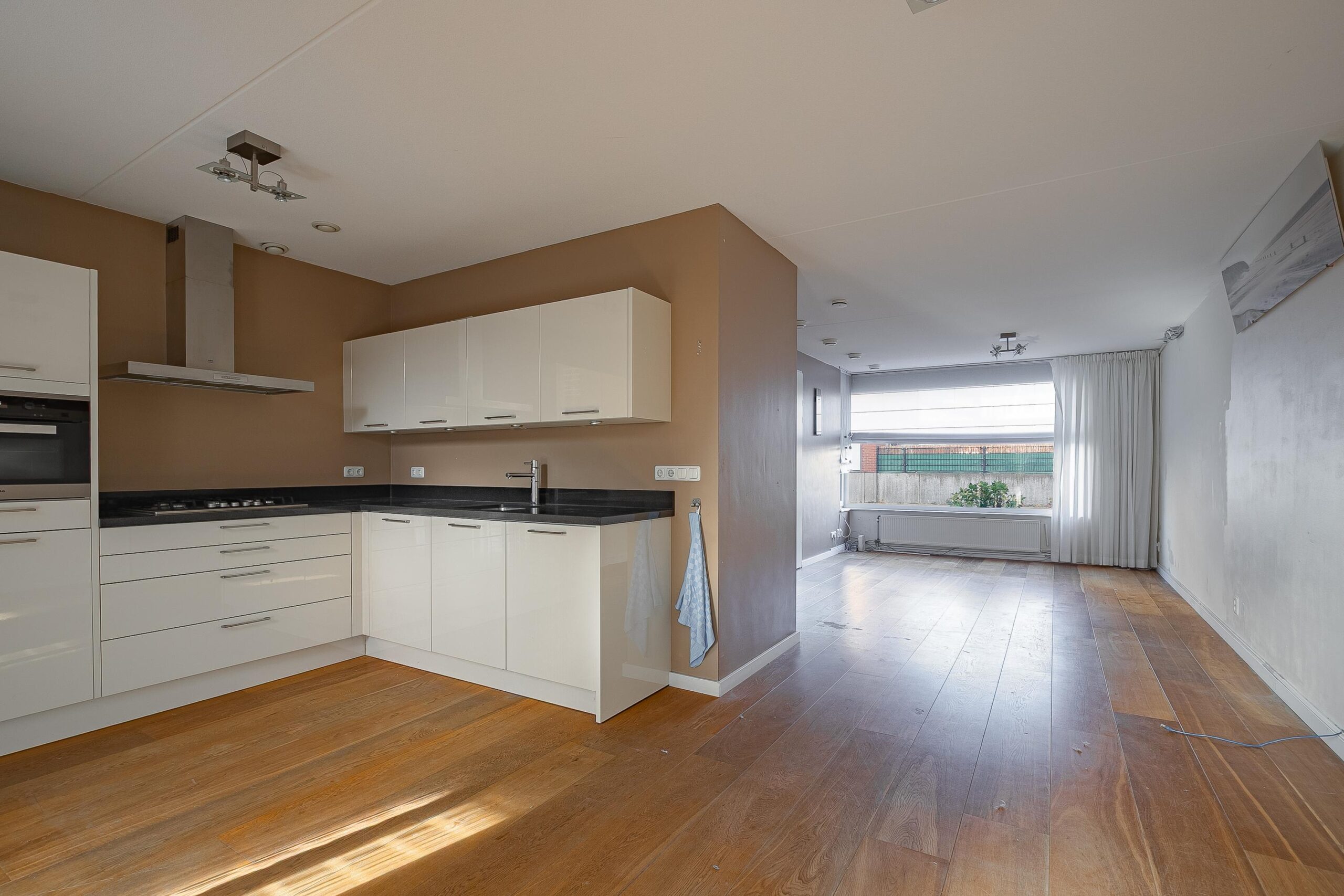 Vanuit de hal is de woonkamer met open keuken bereikbaar, deze zijn samen ca. 39 m² groot. In de woonkamer bevindt zich een praktische trapkast. De keuken in hoekopstelling bevindt zich aan de achterzijde/tuinzijde van de woning. De keuken is voorzien van de volgende apparatuur: inductiekookplaat, afzuigkap, koelkast, oven en vaatwasser. Via de keuken is de overkapping met elektrische rolluiken en de onderhoudsvrije achtertuin met de vrijstaande garage bereikbaar.