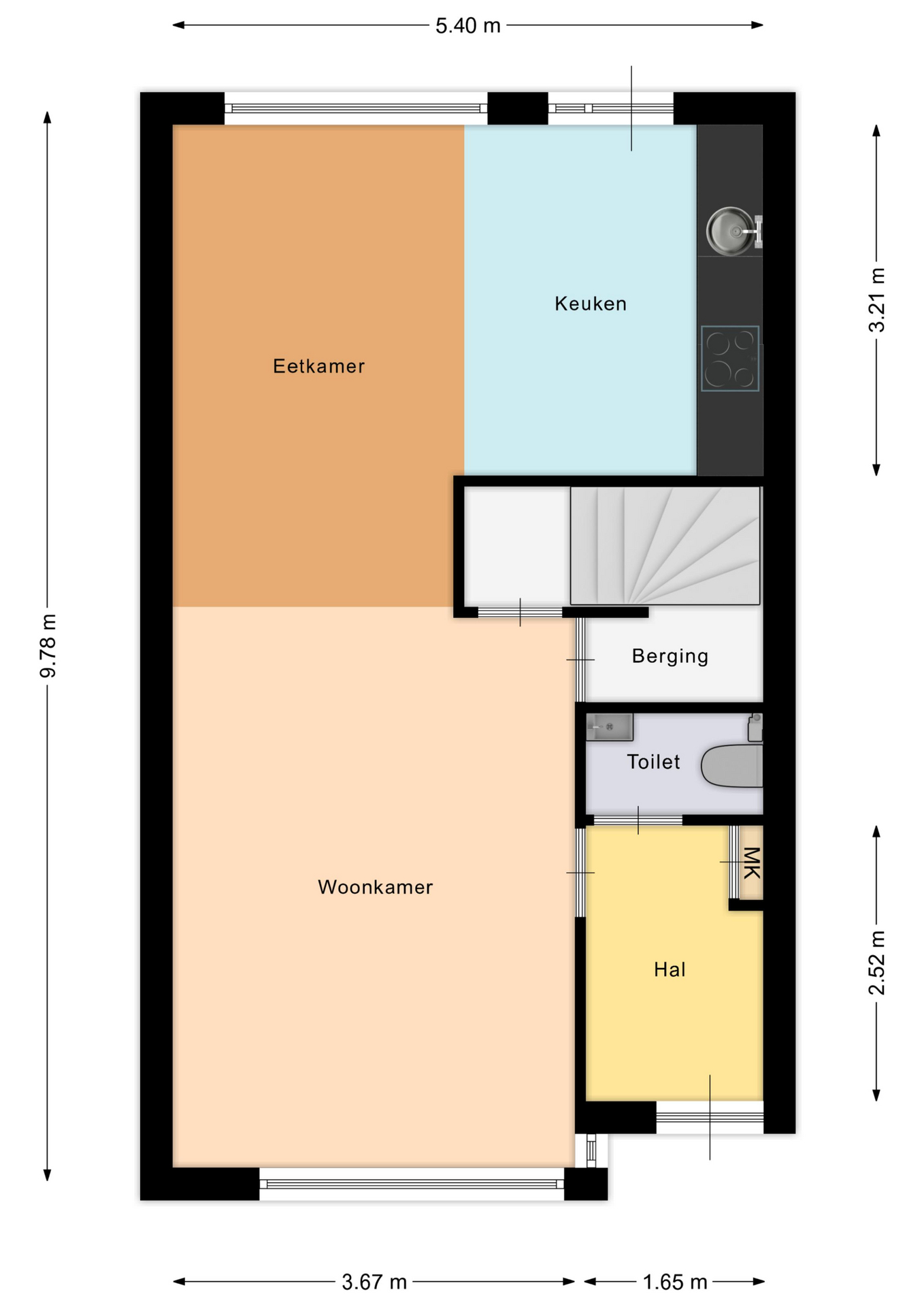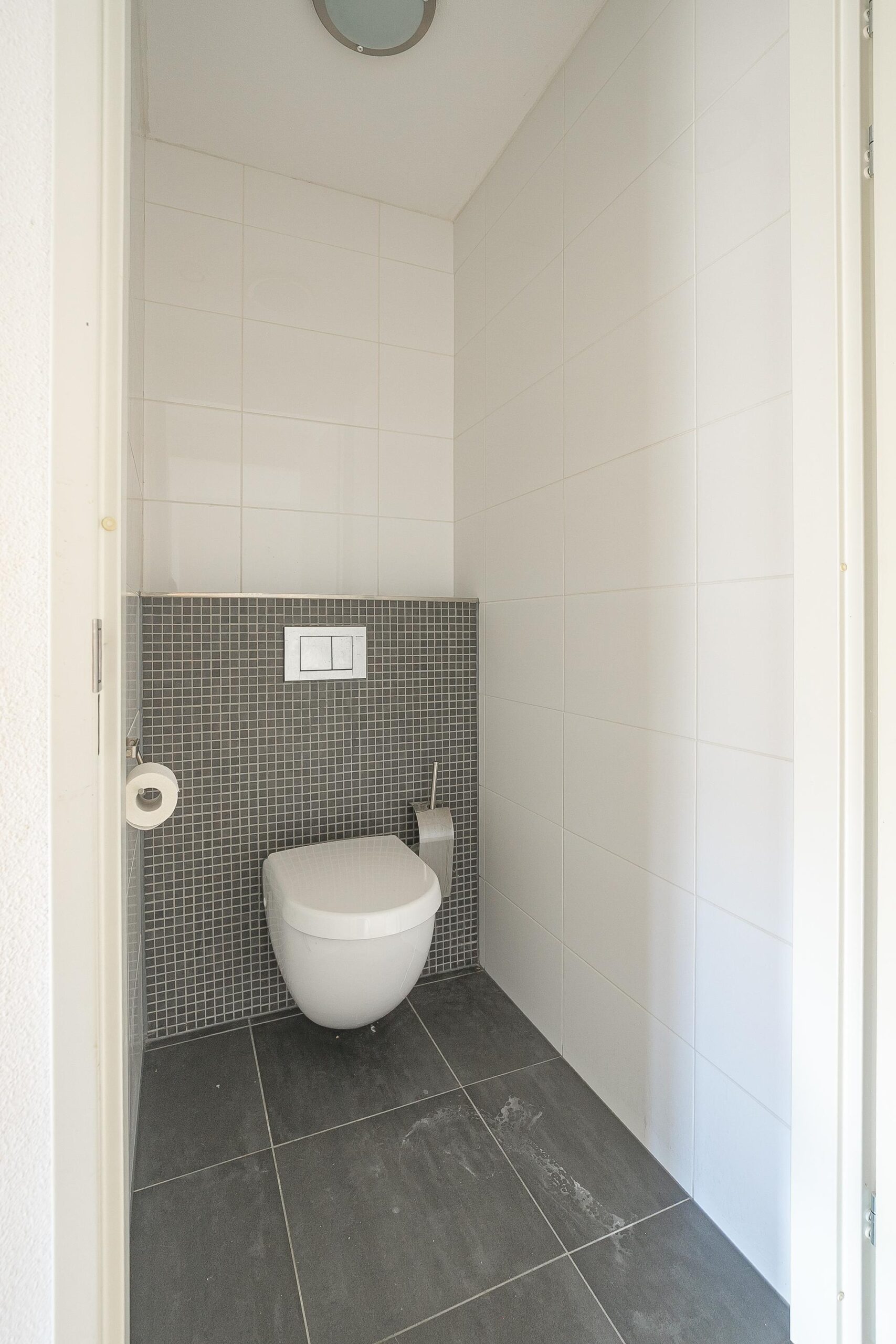Entree/hal (ca. 3,5 m²) voorzien van meterkast en half betegelde toiletruimte met wandcloset en fonteintje. In de hal ligt, evenals op de rest van de begane grond een laminaatvloer.