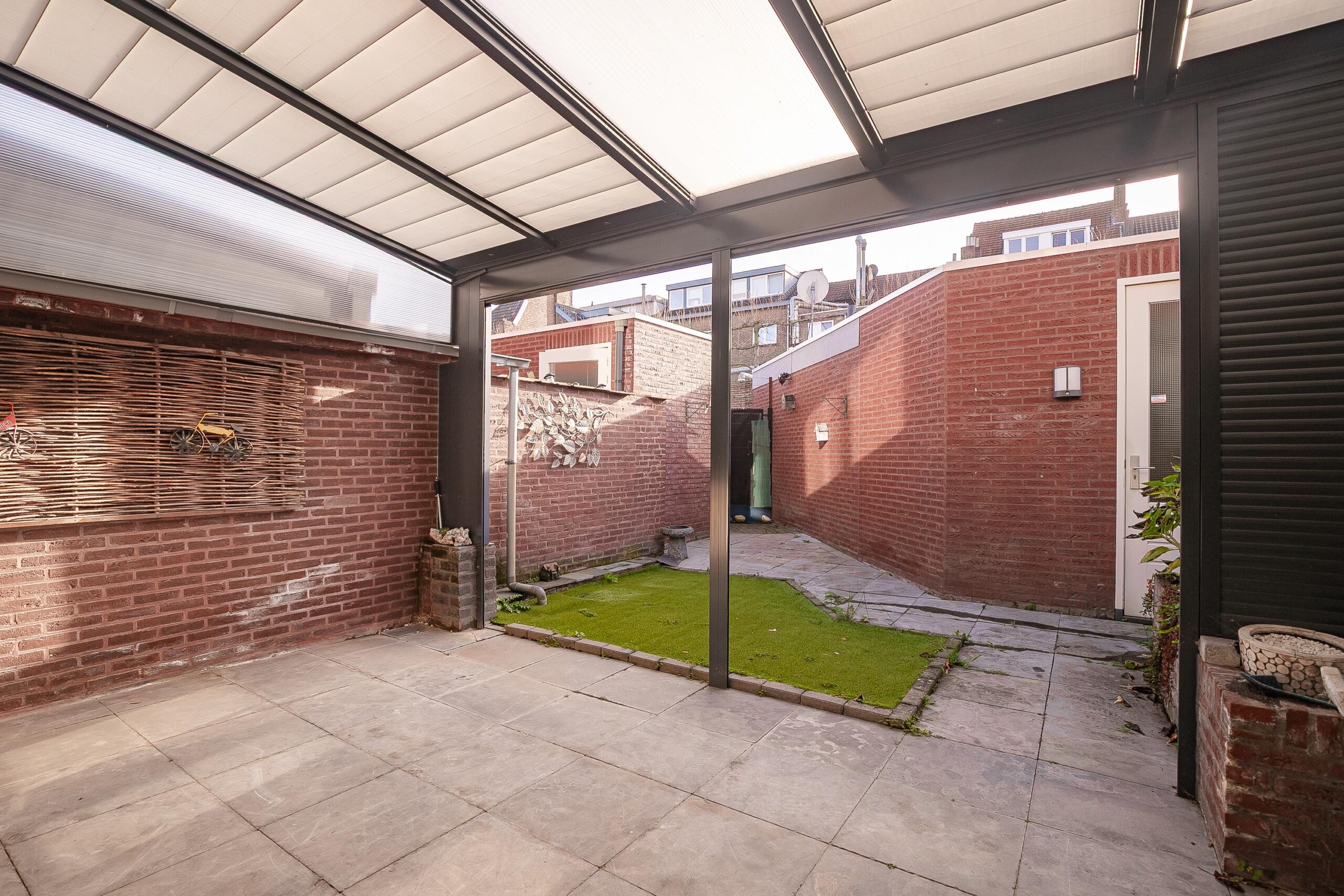 De woning beschikt over een onderhoudsvrije en zonnige tuin met achteringang. Geheel voorzien van moderne tuintegels en een overkapping grenzend aan de woonkamer. Via de achterom is de carport te bereiken.