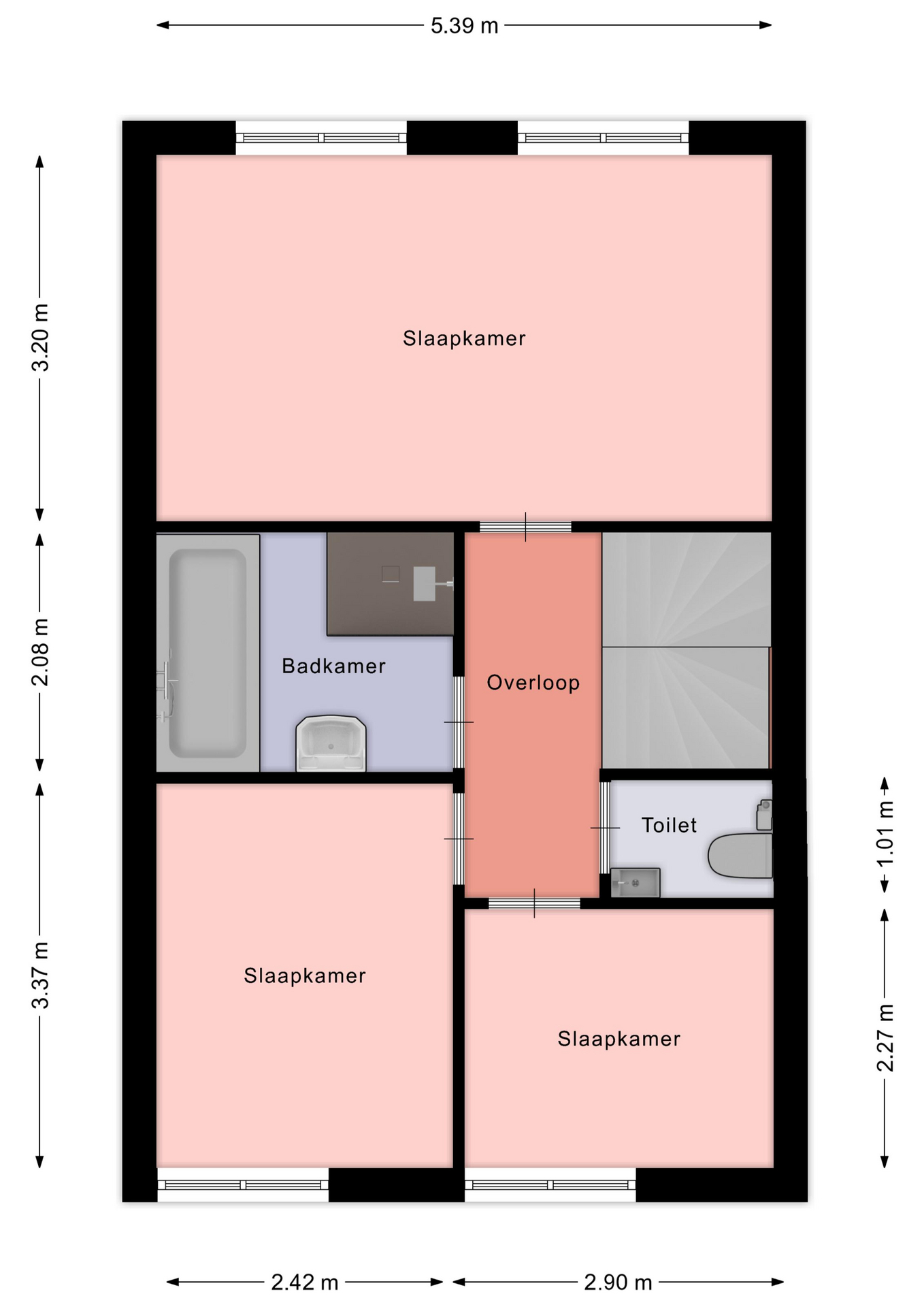 Via de tussenhal in de woonkamer is de trap naar de eerste verdieping bereikbaar. Aan de overloop liggen de 3 slaapkamers, badkamer en de separate toiletruimte. Slaapkamer 1 is gelegen aan de achterzijde van de woning en ca. 17,5 m² groot. Slaapkamer 2 en 3 zijn gelegen aan de voorzijde van de woning en zijn respectievelijk ca. 8 m² en ca. 6,5 m² groot. Op de overloop en de slaapkamers ligt een laminaatvloer. De ruime badkamer (ca. 5 m²) is uitgevoerd met een wastafelmeubel, ligbad en separate douche. De half betegelde toiletruimte is voorzien van een wandcloset en een fonteintje.