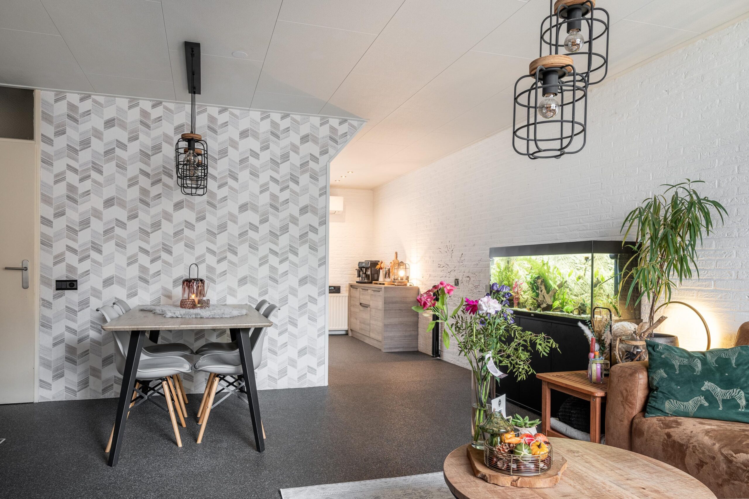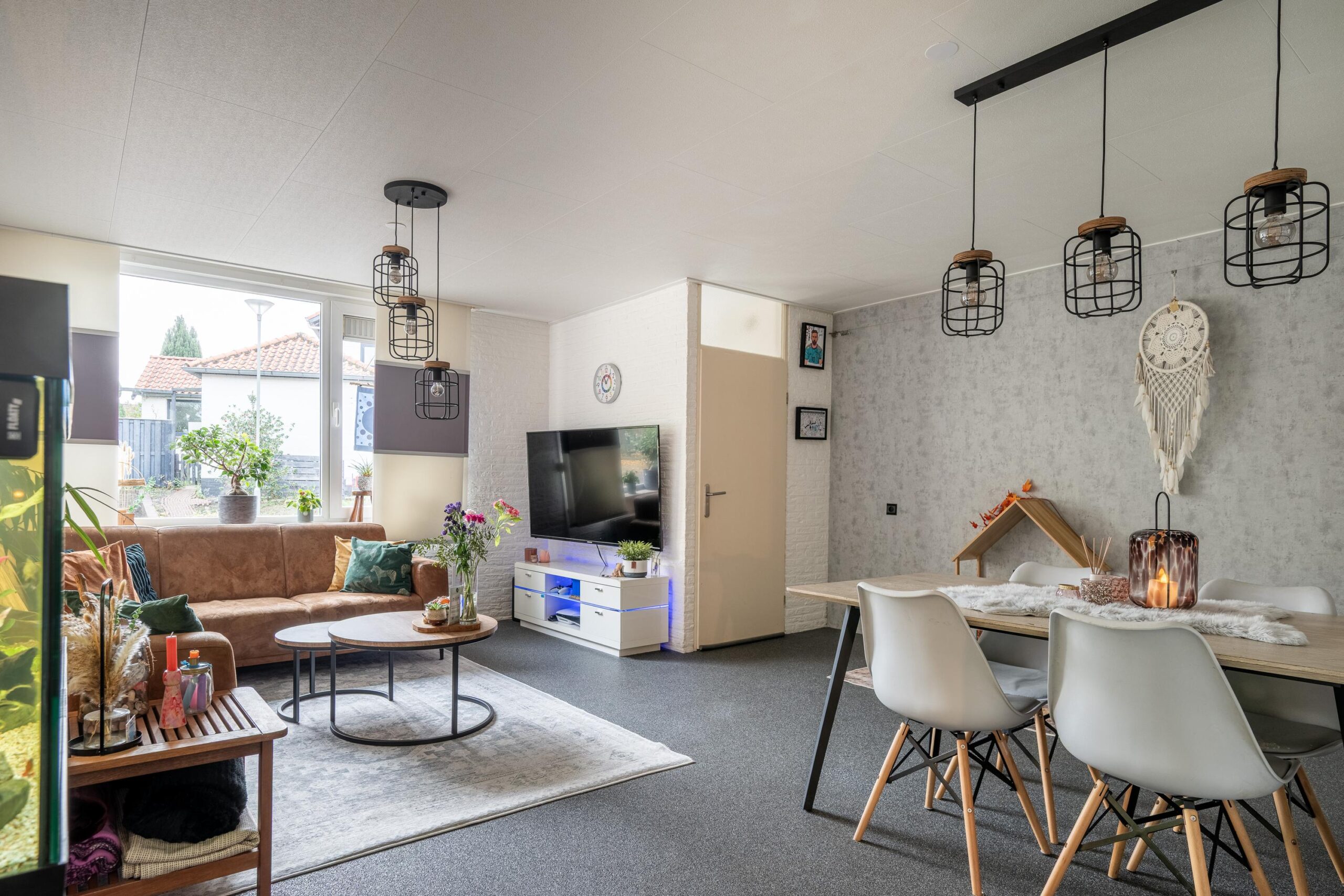 Via de onderhoudsvriendelijke voortuin en de oprit bereikt u de entree/hal van de woning. De hal is voorzien van een garderobe en een gemoderniseerde meterkast. Vanuit de hal heeft u toegang tot de lichte living (ca. 31 m²) met daarachter de halfopen keuken (ca. 8 m²). Aan de voorzijde bevindt zich een groot raampartij, waardoor er veel daglicht binnenvalt en er een prettige zit- en eethoek is gecreëerd. Vanuit deze ruimte is tevens de geheel betegelde toiletruimte bereikbaar, voorzien van een vrijhangend closet en een fontein. De toiletruimte is degelijk uitgevoerd, maar kan desgewenst naar eigen smaak worden gemoderniseerd. De halfopen keuken bevindt zich aan de achterzijde van de woning en is voorzien van een composiet werkblad en de volgende inbouwapparatuur: vaatwasser, keramische kookplaat, afzuigkap, koelkast en een combimagnetron/oven. Verder beschikt de begane grond over een praktische trapkast en een Daikin airconditioning (2023, eigendom). De vloer is afgewerkt met een donkere siergrindvloer, wat zorgt voor een moderne uitstraling.