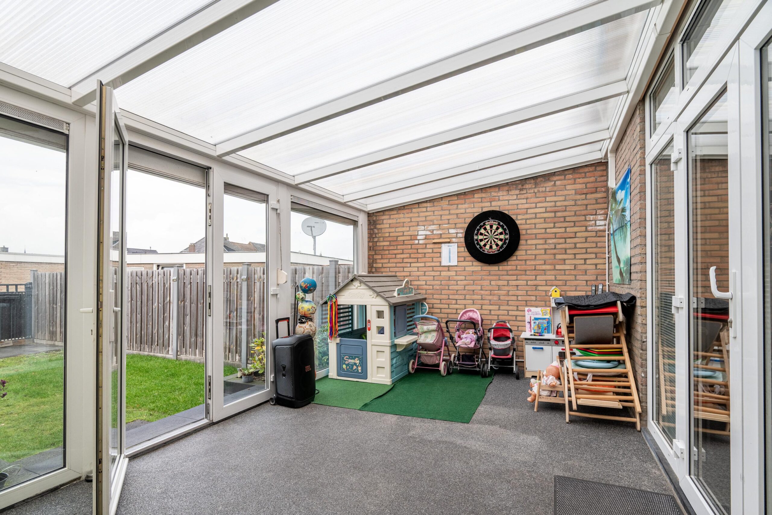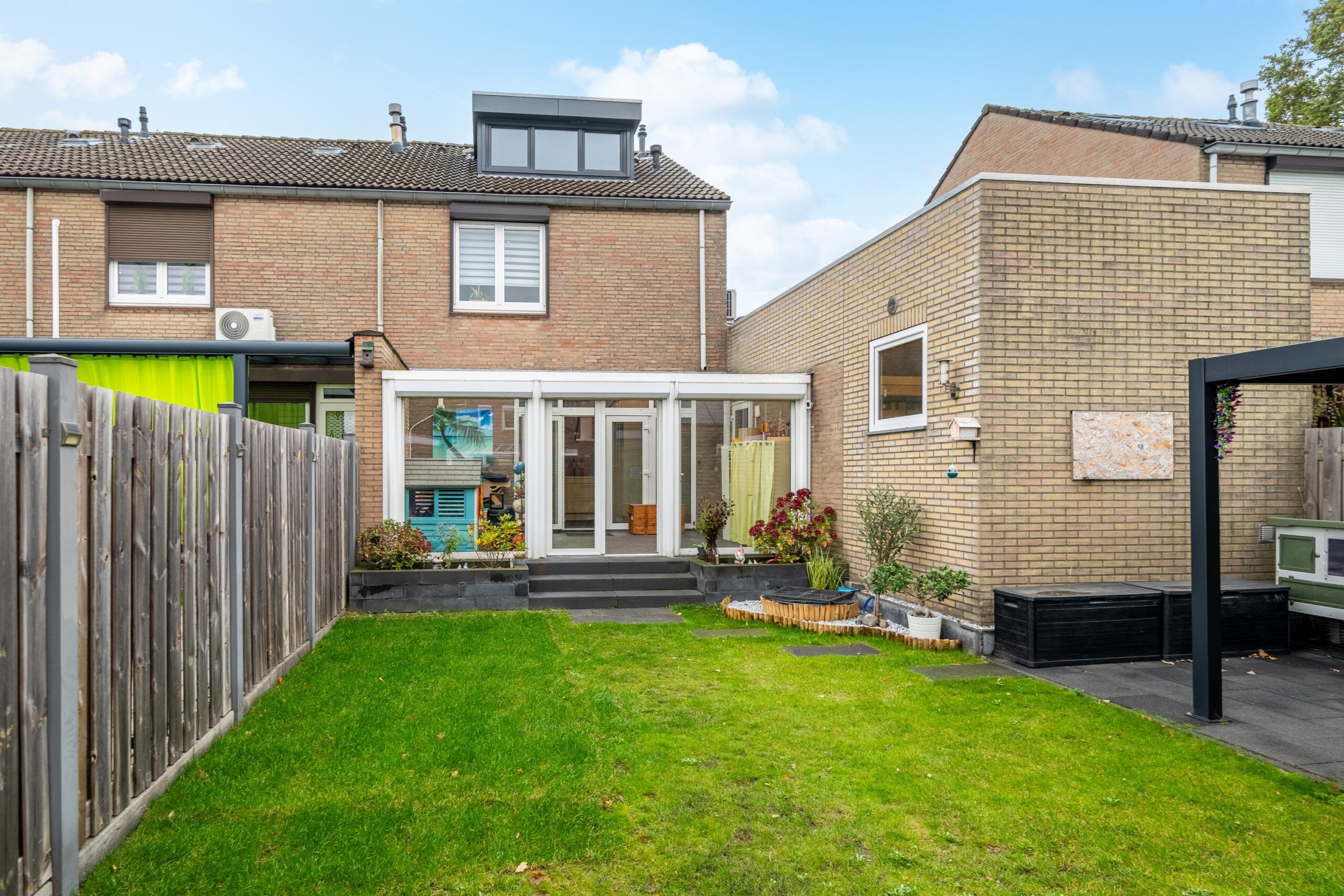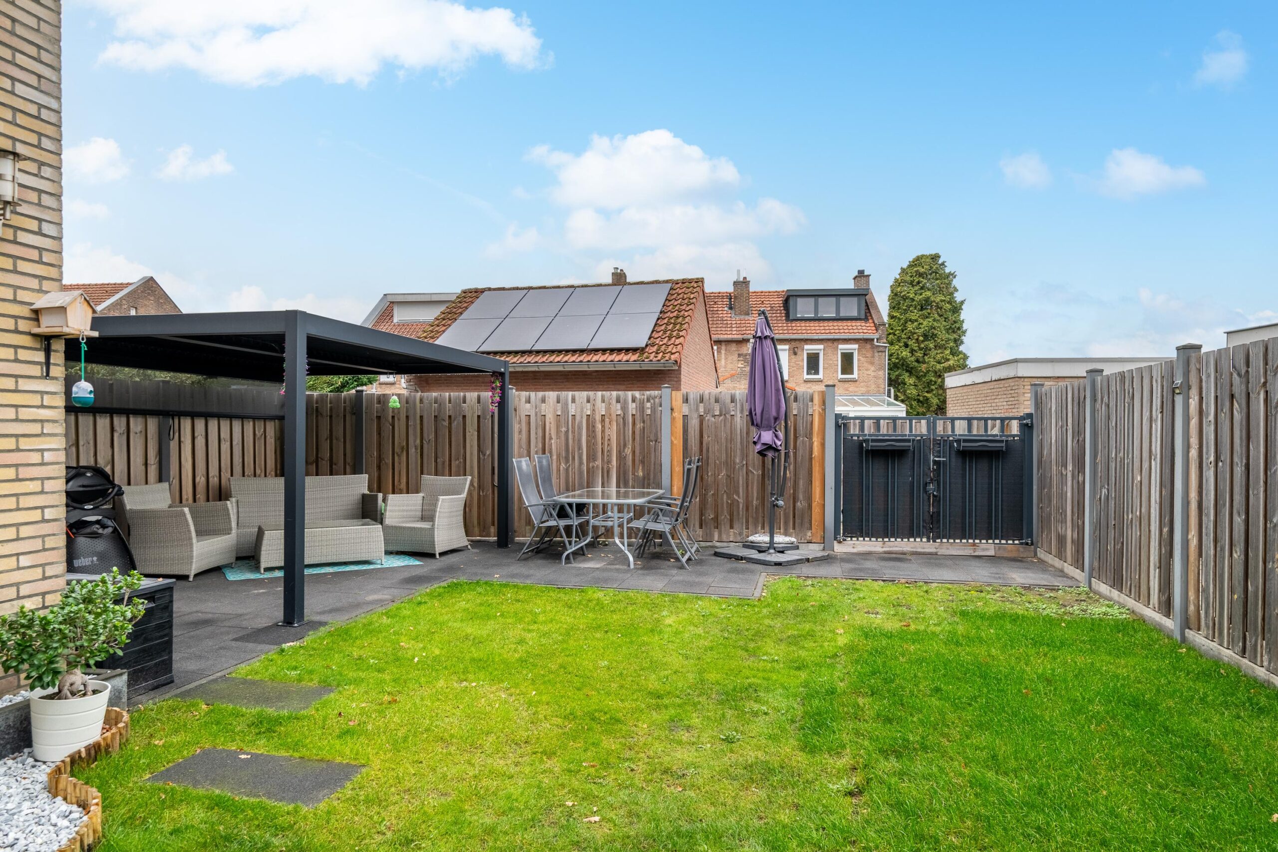 De geheel omsloten, zonnige achtertuin is bereikbaar via de serre en de dubbele poort aan de achterzijde. De tuin is deels betegeld en deels voorzien van een gazon en een klein vijverpartijtje. Achterin bevindt zich een fraaie overkapping (2025) met verplaatsbare screen en lamellendak, die door de koper kan worden overgenomen. Een heerlijke plek om in alle rust van de buitenruimte te genieten..