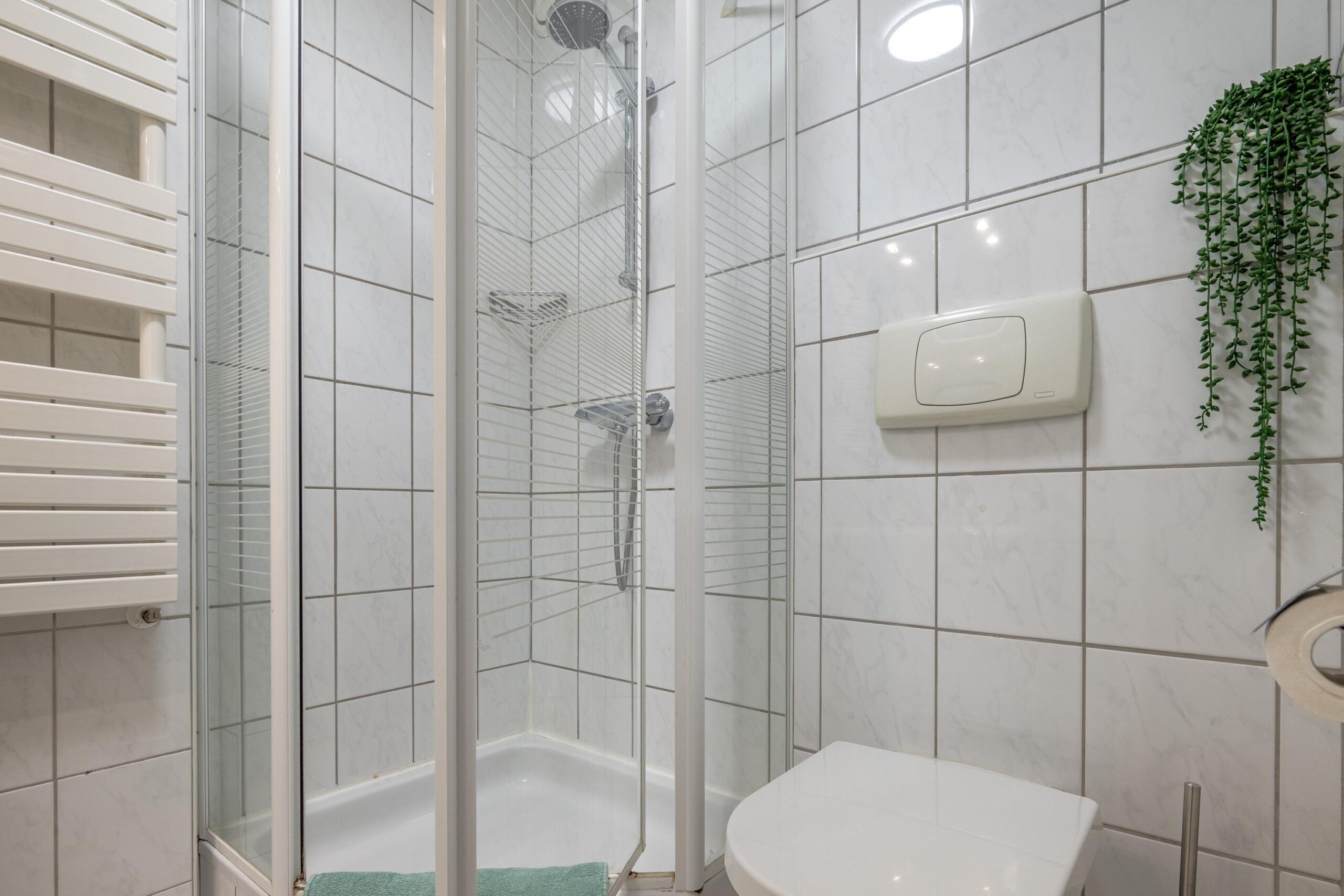 De geheel betegelde badkamer is voorzien van een douche met douchedeur, een tweede vrijhangend closet, een wastafel met ombouwmeubel en een handdoekradiator.