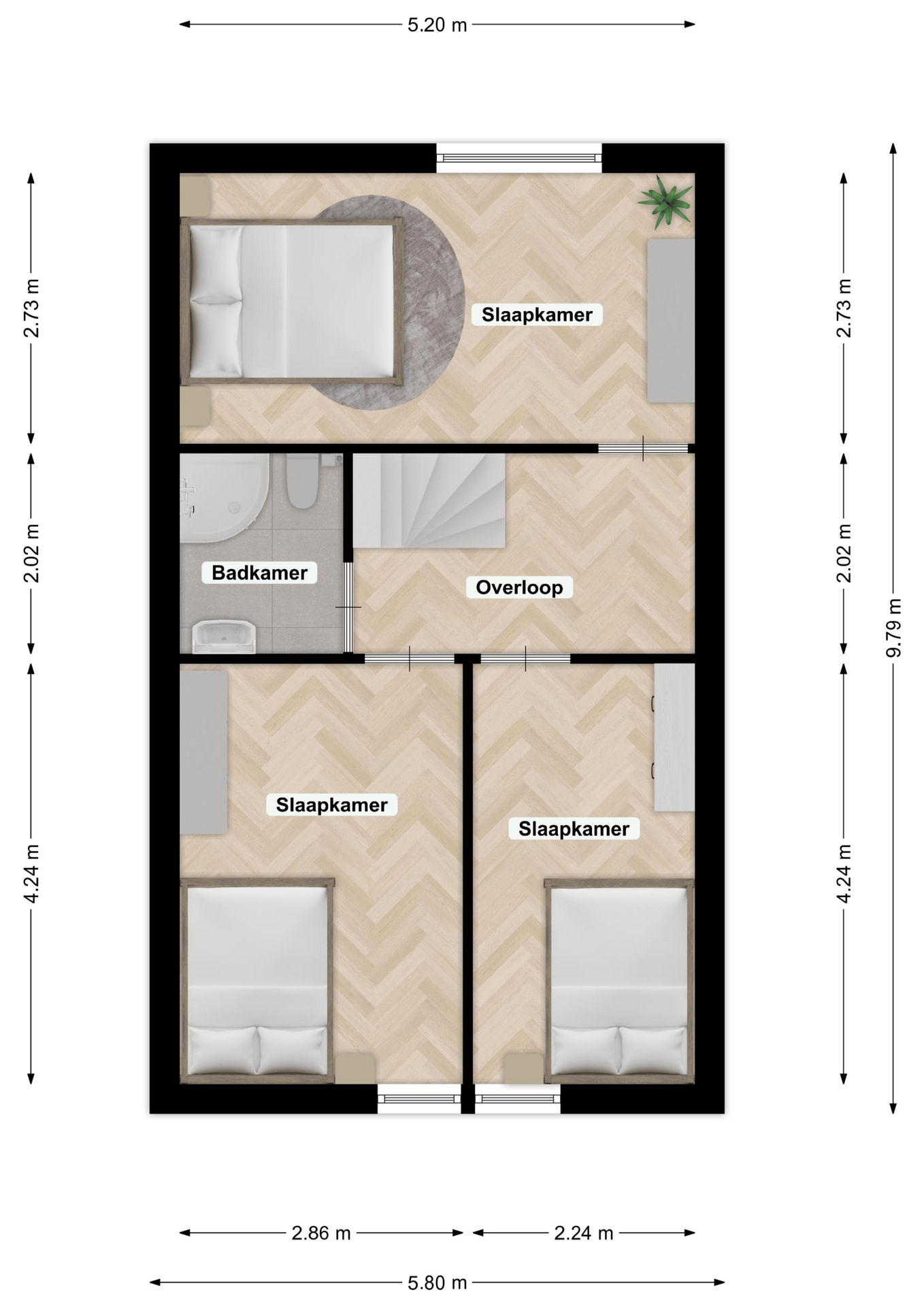 De overloop biedt toegang tot drie ruime slaapkamers, alle voorzien van een lichte laminaatvloer en respectievelijk van de volgende afmetingen: