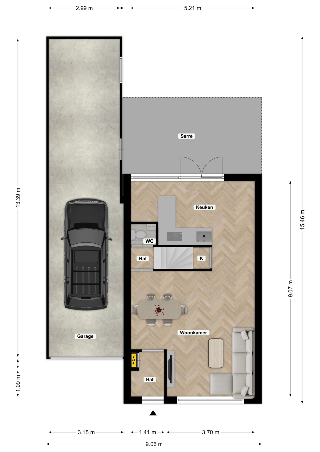 Via de oprit en een loopdeur in de serre is de zeer royale en verhoogde garage bereikbaar. Met een hoogte van (ca. 3,02 m) en een flinke diepte van (ca. 13 m) is deze ruimte ideaal geschikt voor het stallen van een (werk)bus, camper of caravan. De garage is voorzien van een siergrindvloer en aansluitingen voor witgoed.