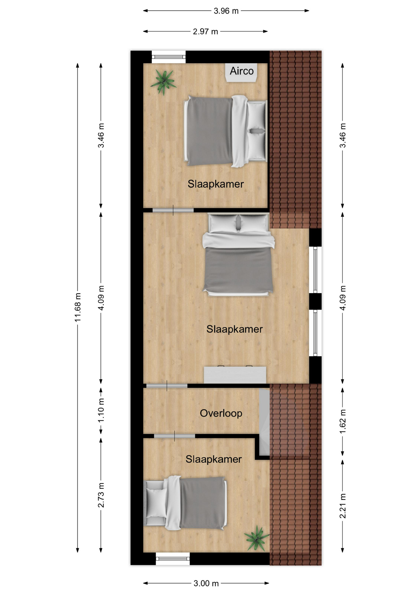 Overloop. Drie slaapkamers (resp. ca. 16.2m², 10.3m² en 8.1m²), waarvan de tweede slaapkamer is voorzien van een airco.
