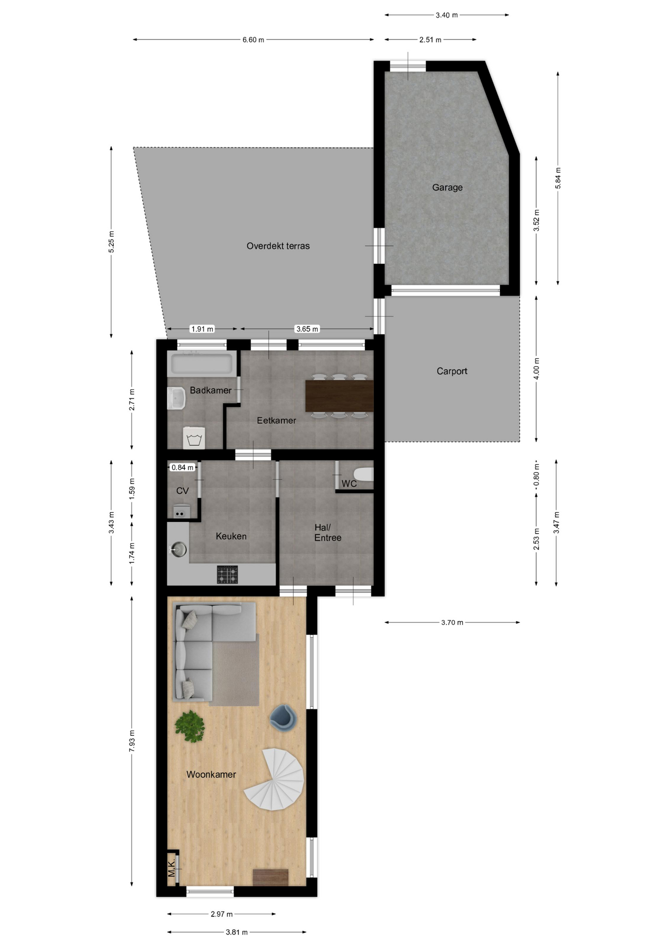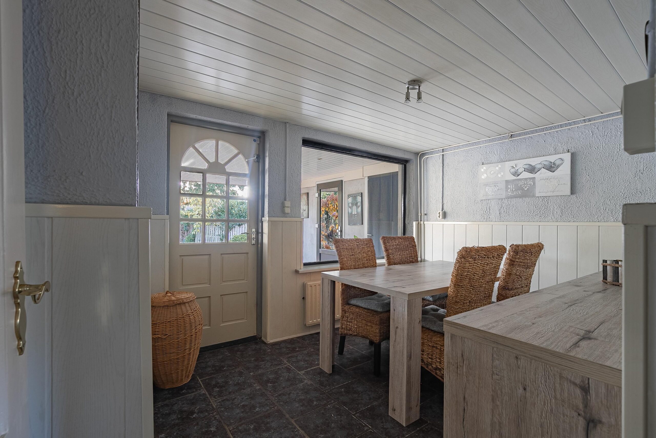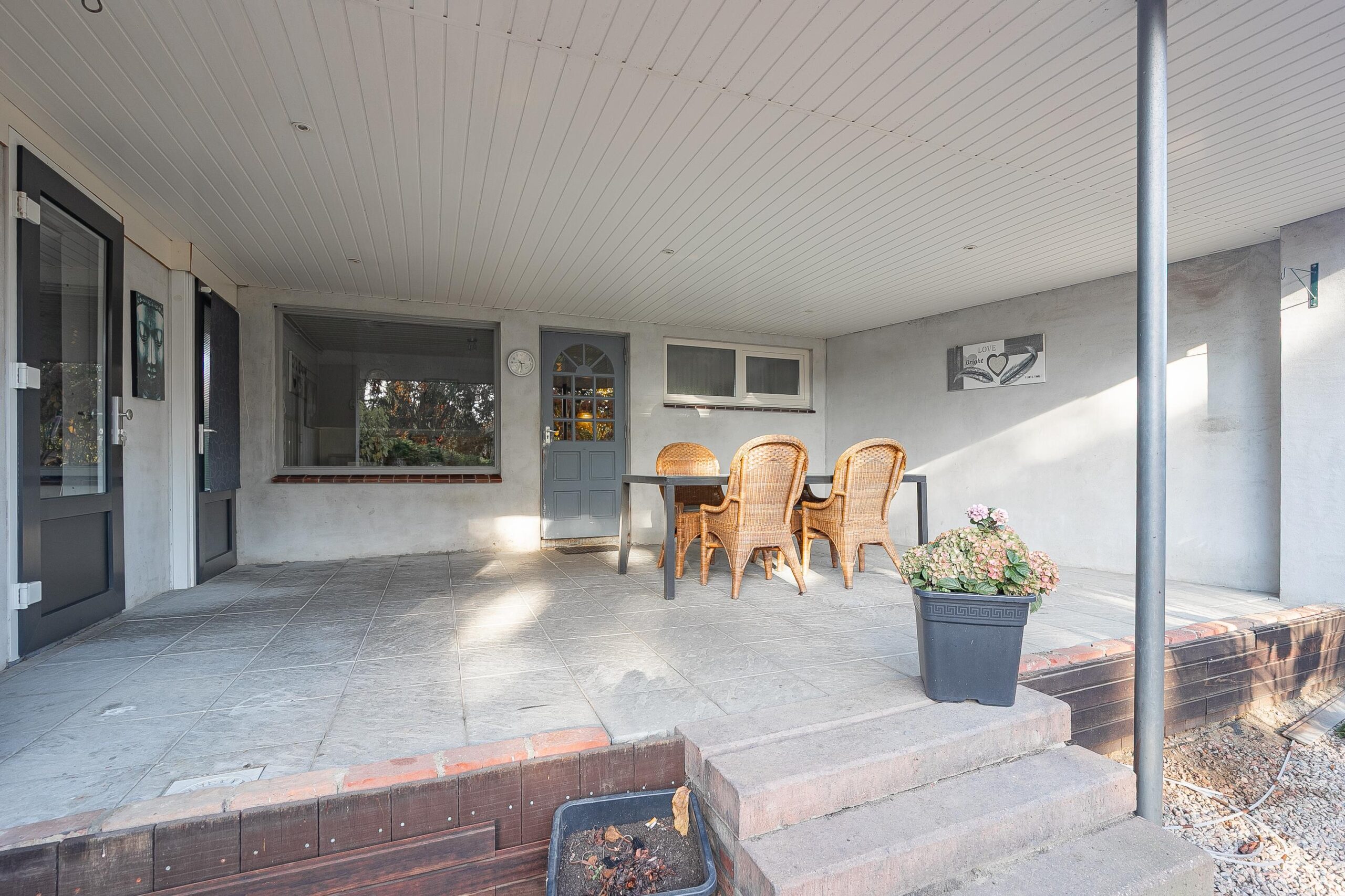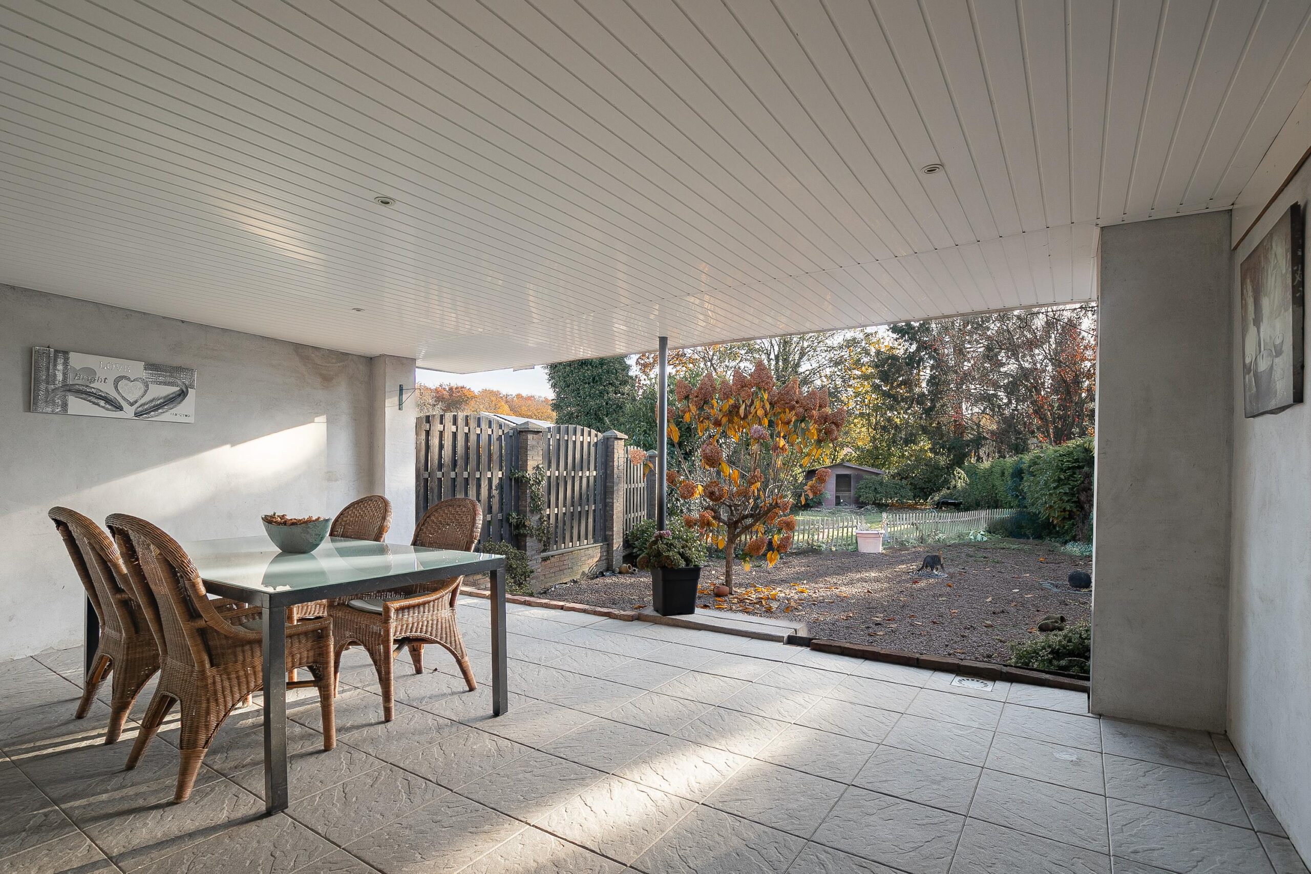 Overdekte entree. Ruime hal met toilet. Woonkamer (ca. 30m²) met schouw. Keuken (ca. 8.6m²) met aanrechtcombinatie voorzien van de volgende apparatuur: gaskookplaat, oven, spoelbak en afzuigkap. CV-ruimte alwaar opstelling CV-combiketel (merk Tzerra, eigendom, bwjr. 2023). Eetkamer (ca. 10.3m²) uitkijkend over de achtertuin. Badkamer (ca. 4.7m²) met ligbad, wastafel en aansluiting wasmachine. Ruim overdekt terras (ca. 32.4m²). Carport (ca. 15.6m²) en garage (ca. 18.9m²) met twee poorten (in de voor- en achtergevel). Ruim 37 meter diepe, op het zuidoosten georiënteerde achtertuin met vrij uitzicht naar het achtergelegen Steinerbos. Achter in de tuin is een dierenstal van ca. 13.3m².
