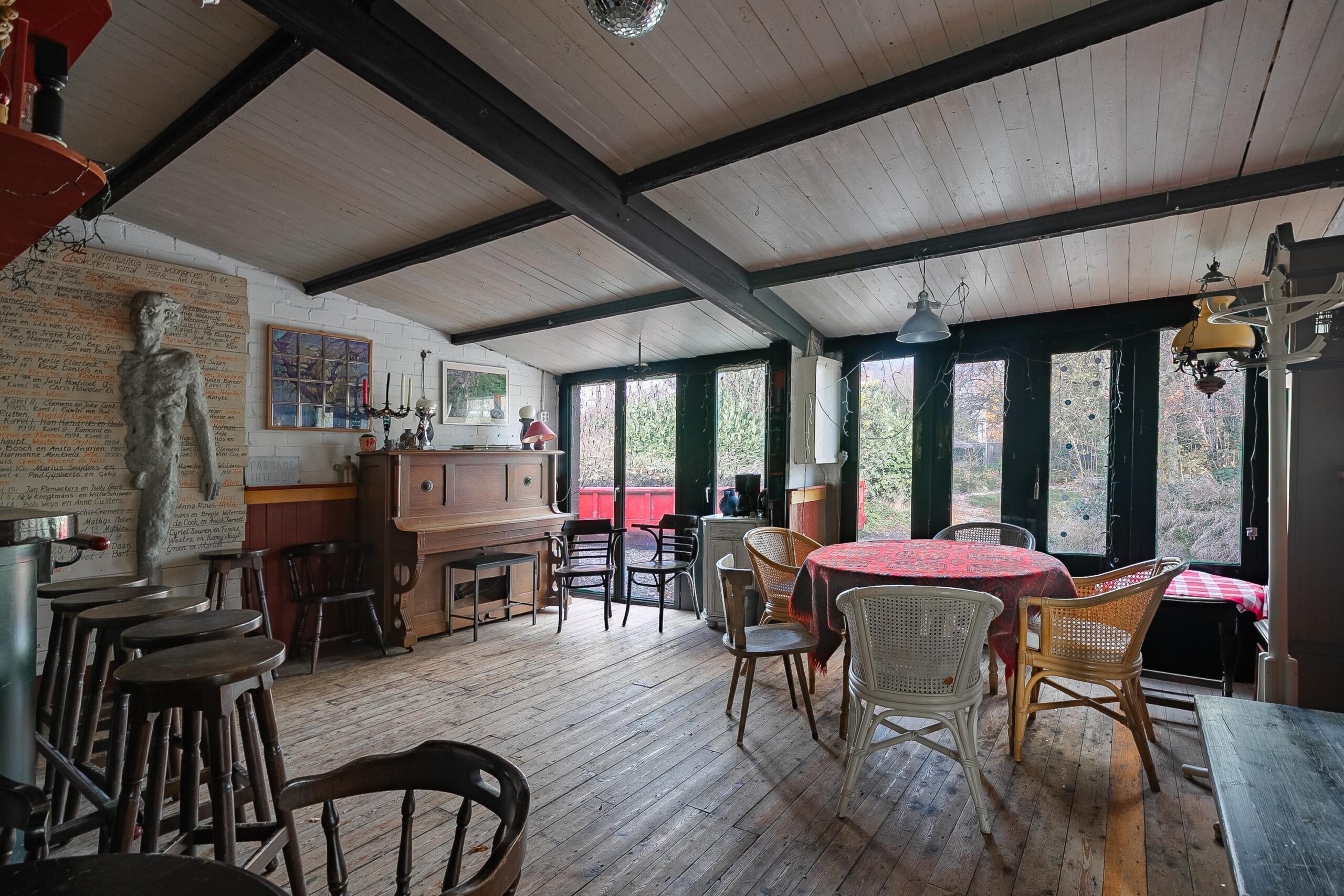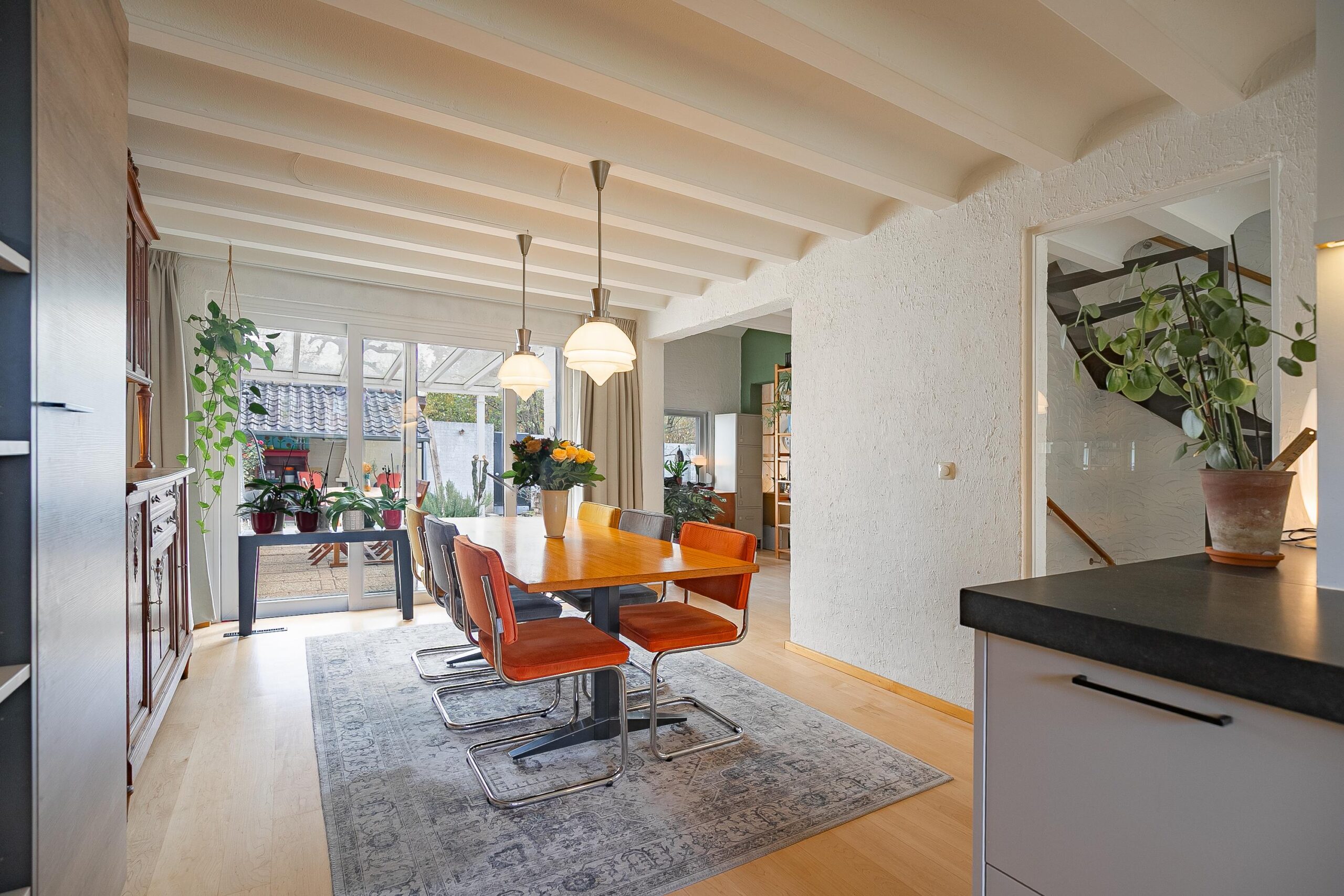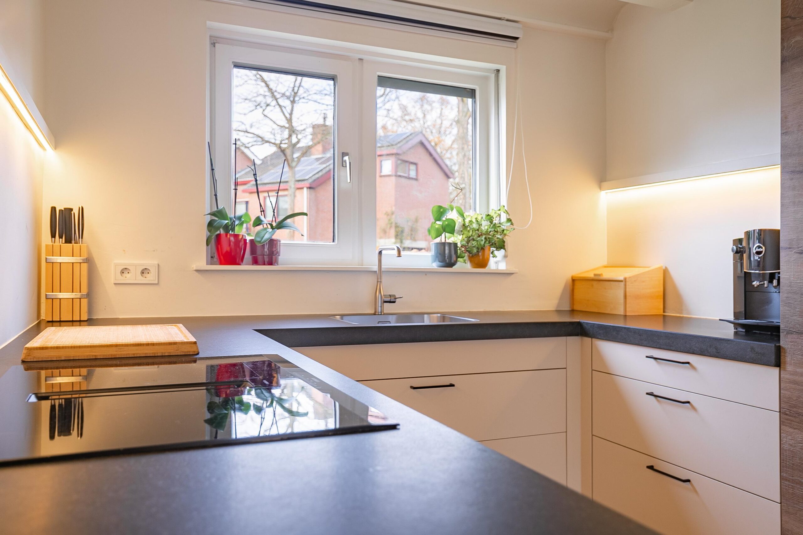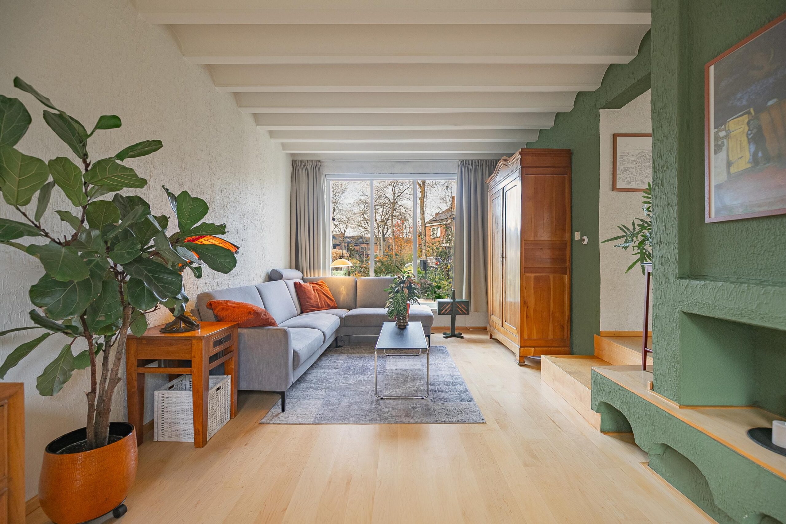 Entree/hal met onder andere de meterkast, garderobe, toiletruimte, toegang tot de kelder, trapopgang en toegang tot de leefruimte. Het moderne toilet is voorzien van een hangcloset, fonteintje en mechanische afzuiging. De leefruimte (ca. 45 m²) is ingedeeld in een gezellige zitkamer met haard, een praktische thuiswerkplek en een ruime eetkamer die in open verbinding staat met de keuken. De keuken uit 2020 in U-opstelling is uitgerust met een inductiekookplaat met geïntegreerde afzuiging, spoelbak, vaatwasser, combi-oven en een hoge koelkast. Vanuit de eetkamer geeft een schuifpui direct toegang tot de achtertuin, waardoor binnen en buiten mooi in elkaar overlopen. De begane grond is voorzien van een fraaie parketvloer en een karakteristiek balkenplafond met ronde balken, wat de ruimte een warme en sfeervolle uitstraling geeft.