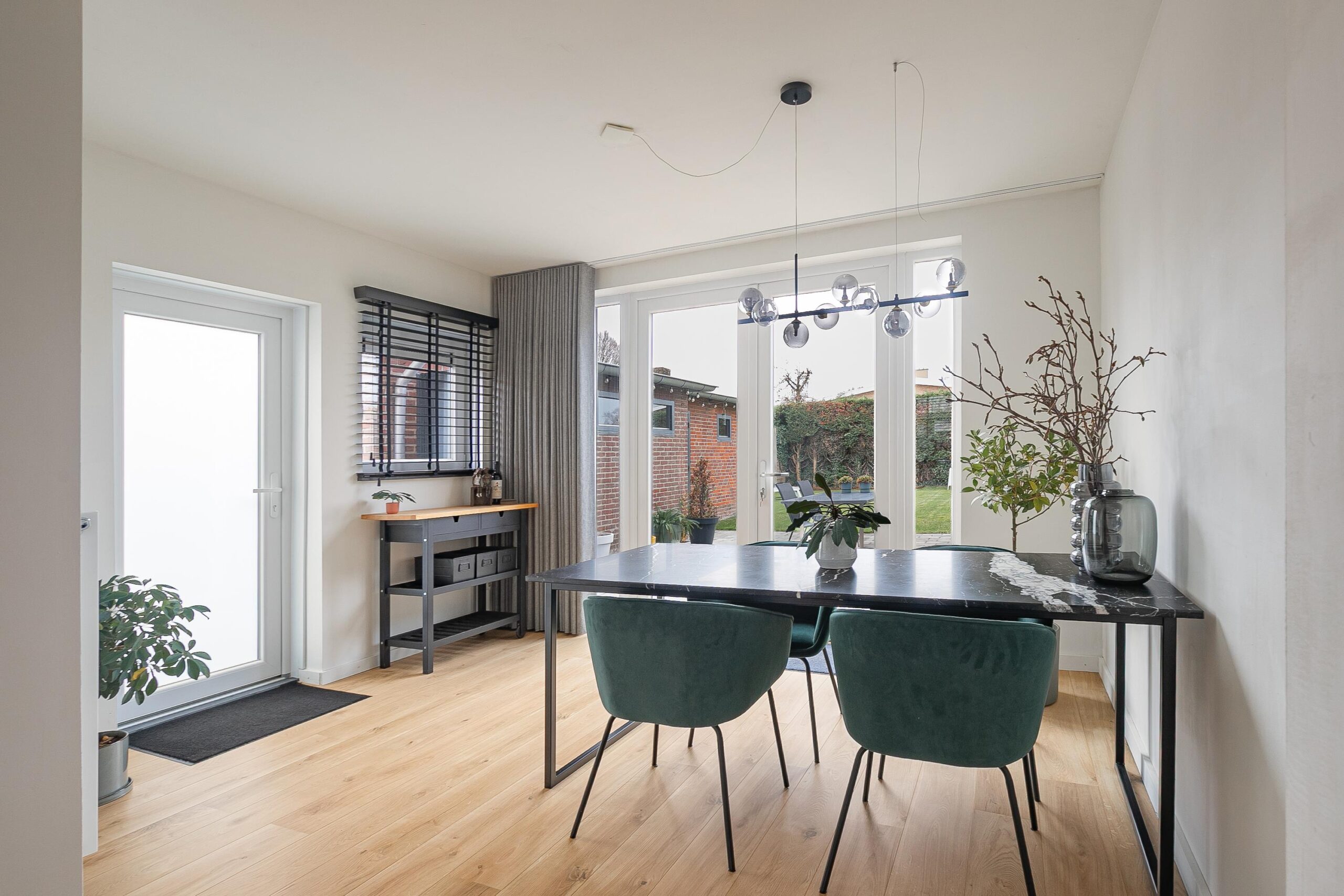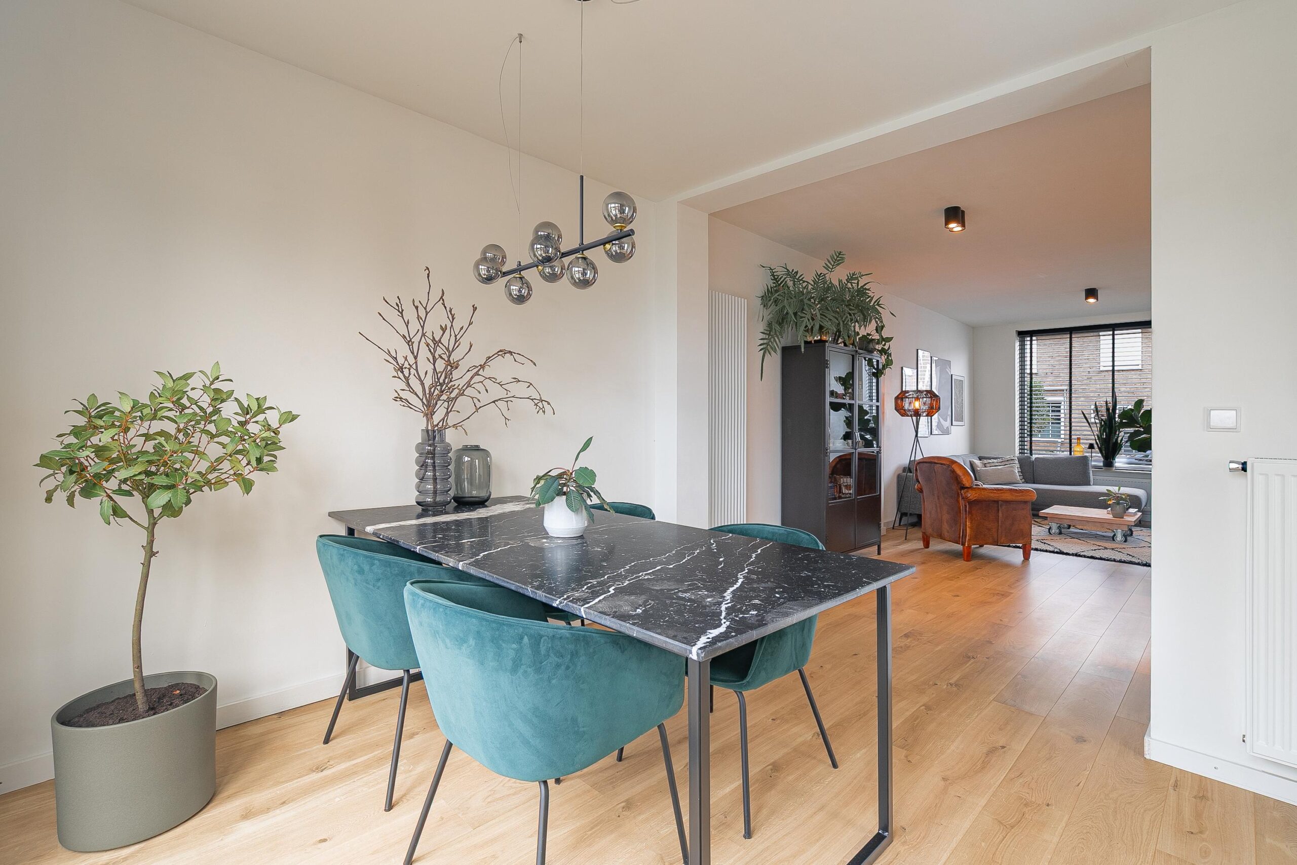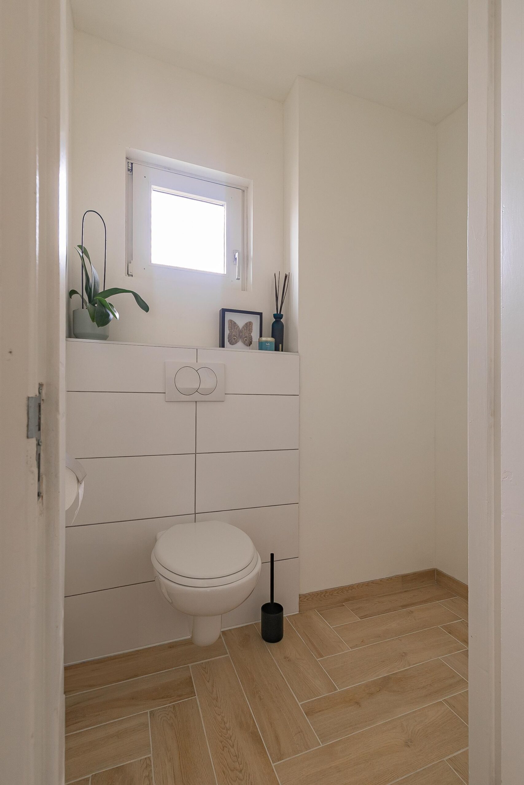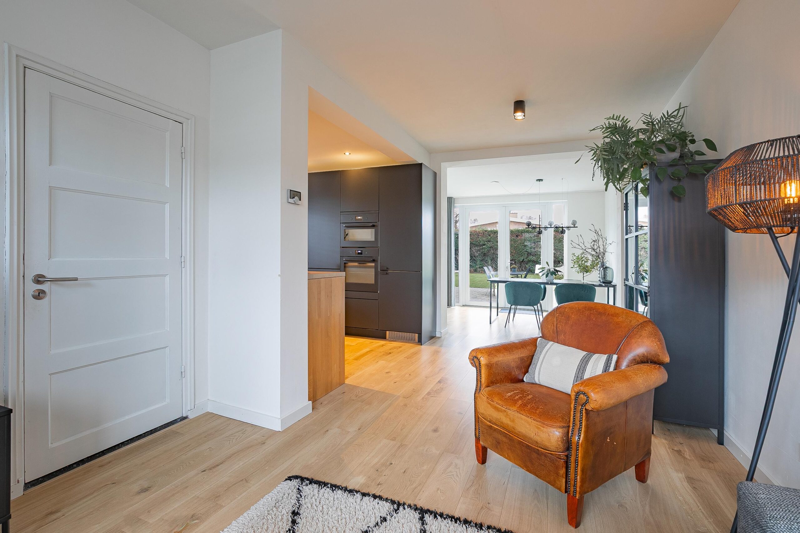 Entree/hal met trapopgang, meterkast, toilet en toegang tot de woonkamer en de provisiekelder. Het toilet is deels betegeld en voorzien van een wandcloset en fonteintje. De woonkamer met open keuken is licht en sfeervol. De zitkamer ligt aan de voorzijde en de eetkamer aan de achterzijde van de woning. De keuken heeft een moderne U-opstelling met onderkasten, wandkast en diverse inbouwapparatuur, waaronder een spoelbak, inductiekookplaat, afzuigkap, koelkast, vriezer, vaatwasser, combi-oven en heteluchtoven. Vanuit de woonkamer bieden openslaande deuren direct toegang tot de ruime, geheel omsloten achtertuin. Via de eetkamer is tevens de oprit bereikbaar.