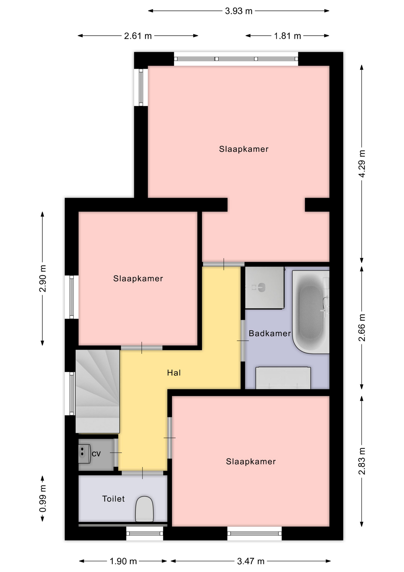 Via de vaste trap te bereiken overloop met toegang tot drie slaapkamers, de badkamer, een toiletruimte en de CV-ruimte. De slaapkamers zijn respectievelijk ca. 12,5m², 10m² en 7,5m² groot. De toiletruimte is deels betegeld en voorzien van een wandcloset. De badkamer (ca. 5 m²) is volledig betegeld en uitgerust met een ligbad, douche, wastafelmeubel met onderkast en mechanische ventilatie. In de CV-ruimte bevinden zich de CV-ketel (Remeha Avanta HR+ Combi, eigendom, bouwjaar december 2020).