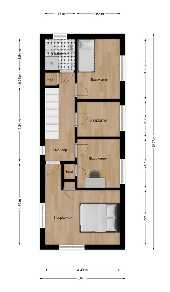 De slaapkamers zijn respectievelijk 16m2, 9m2, 7m2 en 5m2 groot ca en 2 slaapkamers zijn voorzien van een muurkast.