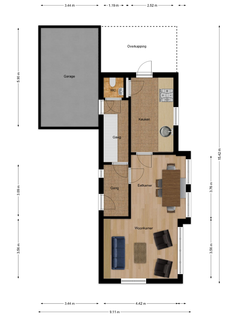 Tevens is vanuit de hal/entree de garage te bereiken.
