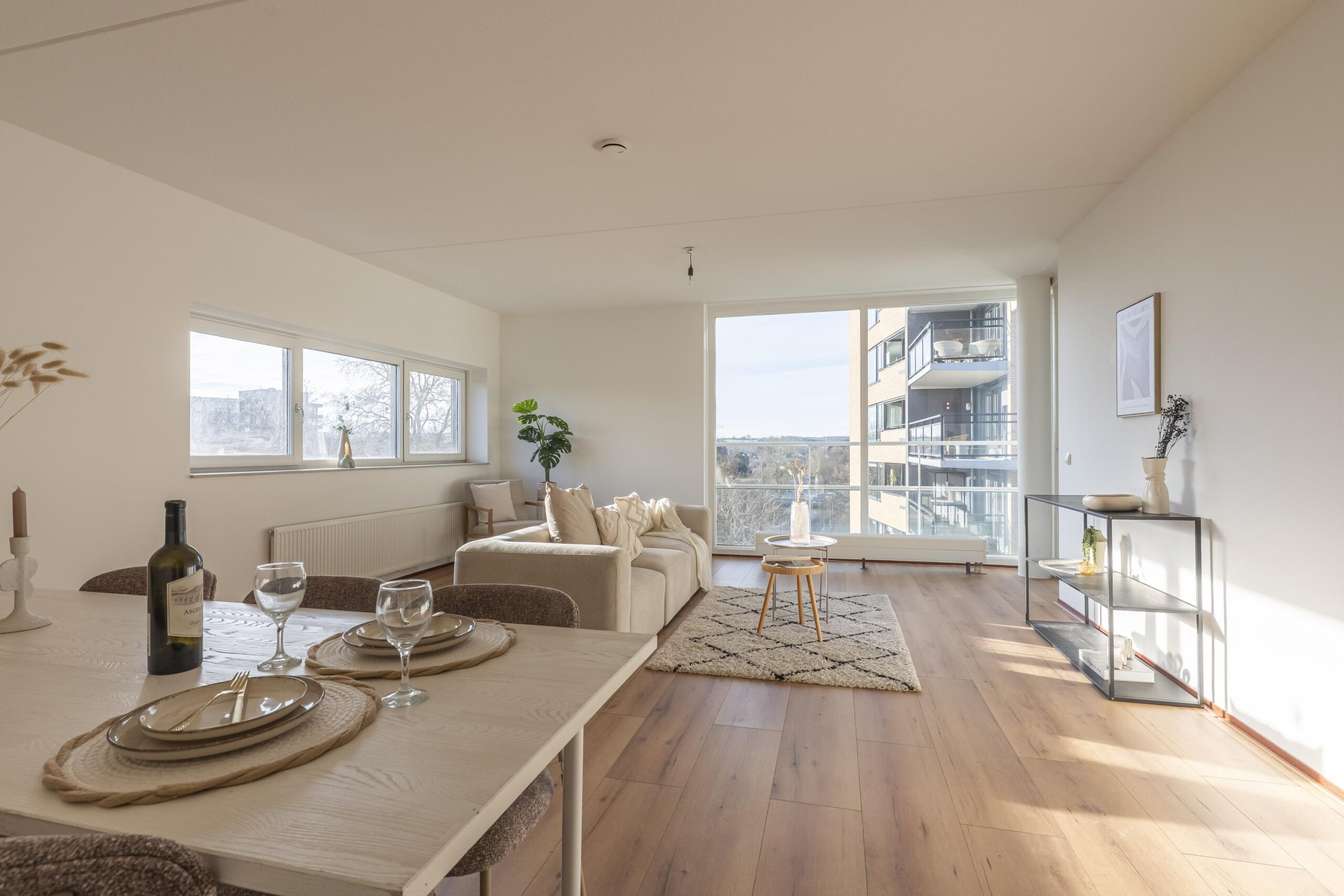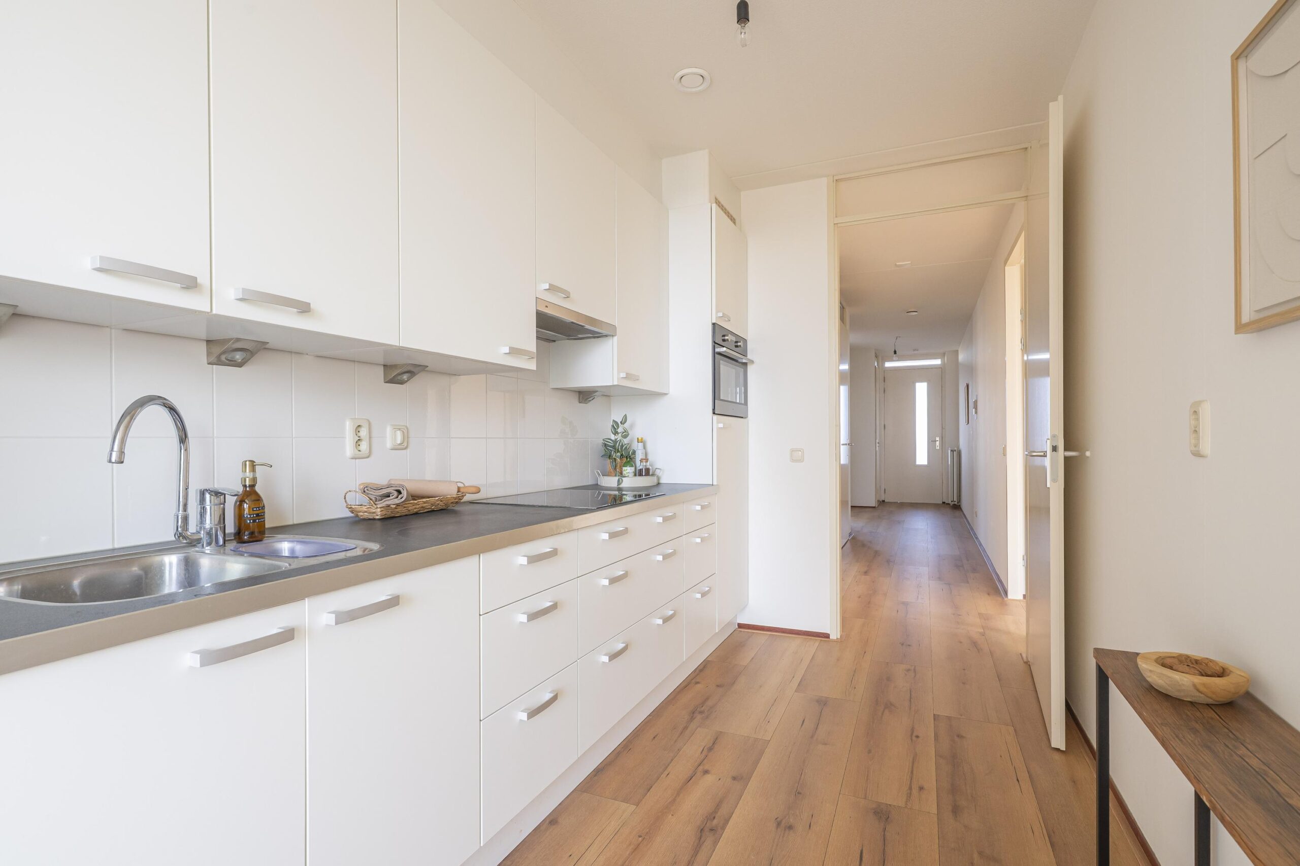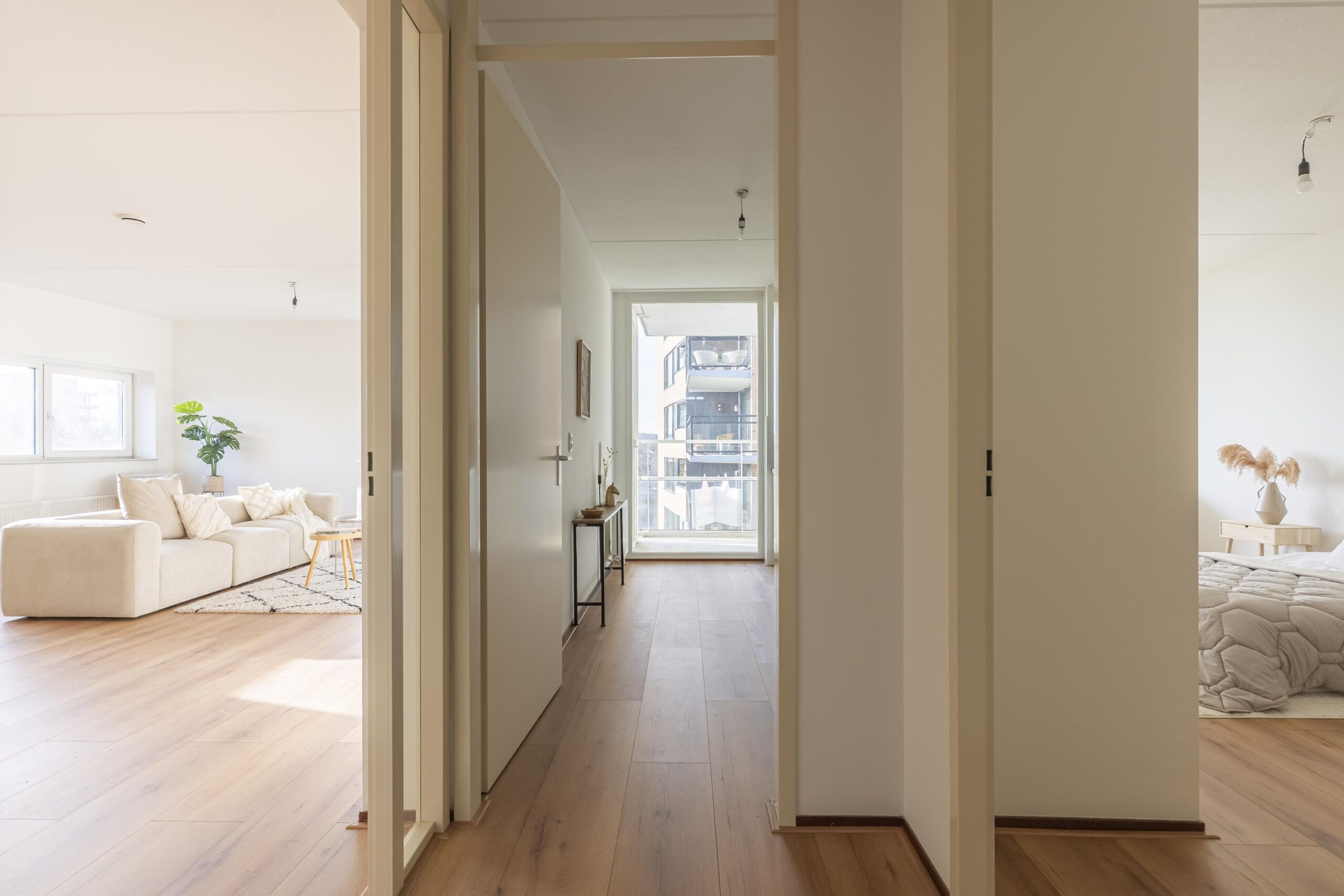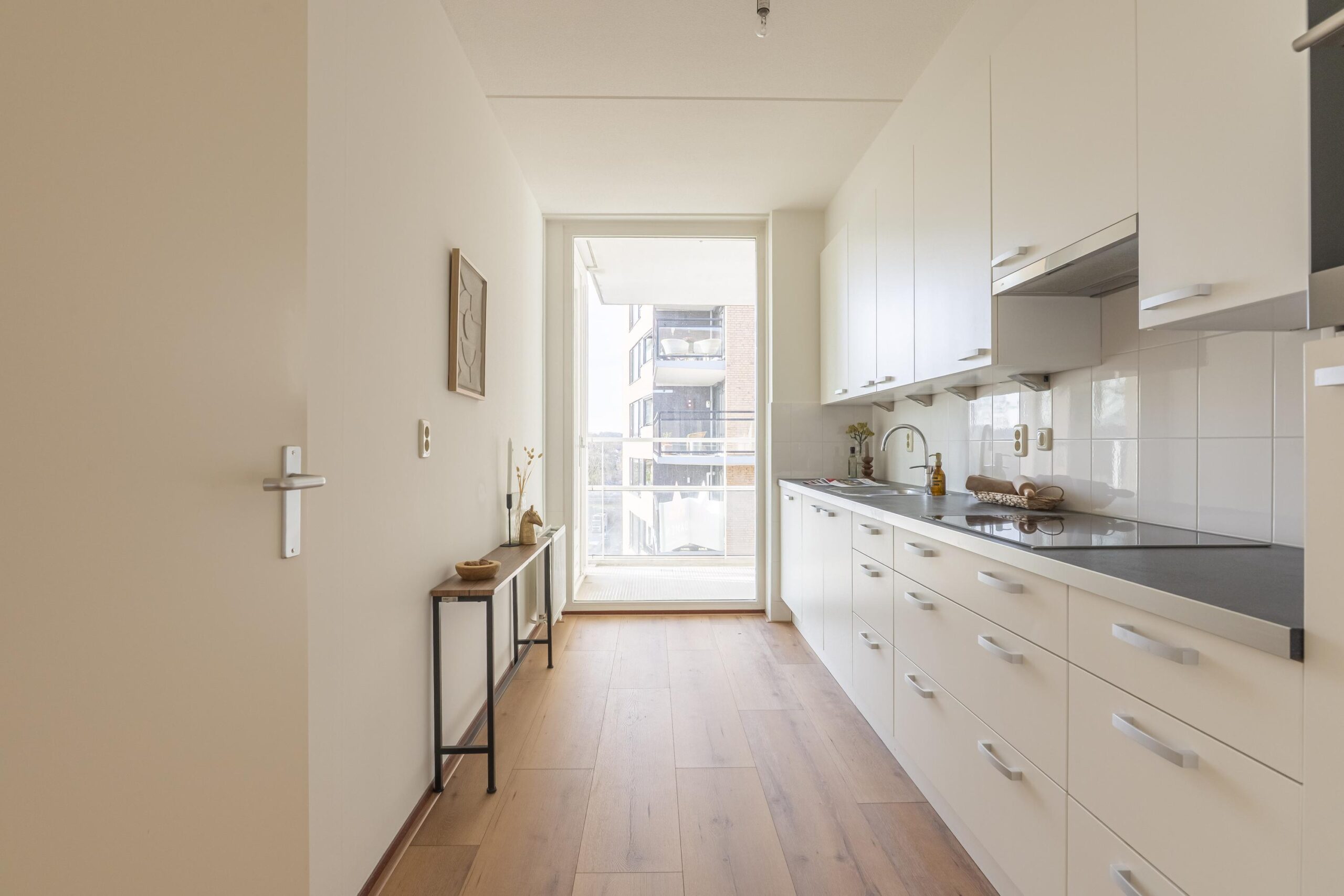 Royale hal met meterkast en garderobe. Deels betegelde toiletruimte met toilet en fonteintje. Technische ruimte alwaar zich de aansluitpunten voor witgoedapparatuur bevinden, alsmede de WTW installatie. Tevens is hier ook nog genoeg plek voor extra opslag. Geheel betegelde, moderne badkamer voorzien van ligbad, douche en wastafel. Ruime living met een fraai uitzicht en veel lichtinval door de extra raampartij aan de zijkant, met toegang tot het ruime balkon. De gesloten keuken is voorzien van een nette keukeninstallatie in hoekopstelling voorzien van de navolgende apparatuur: koelkast met vriesvak, keramische kookplaat, vaatwasser en combimagnetron.