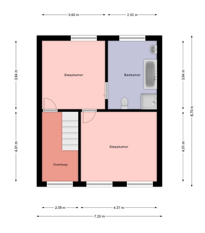 Middels de overloop zijn de 2 ruime slaapkamers alsmede de badkamer te bereiken. De slaapkamers zijn respectievelijk groot ca. 18 m² en 14 m².