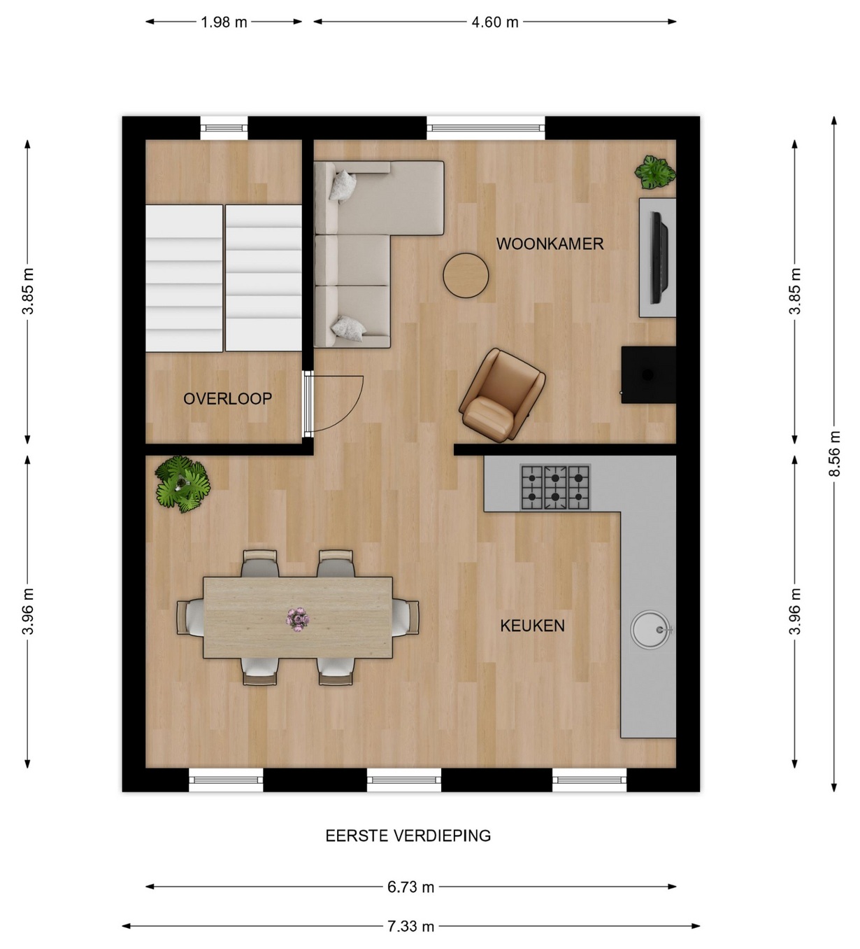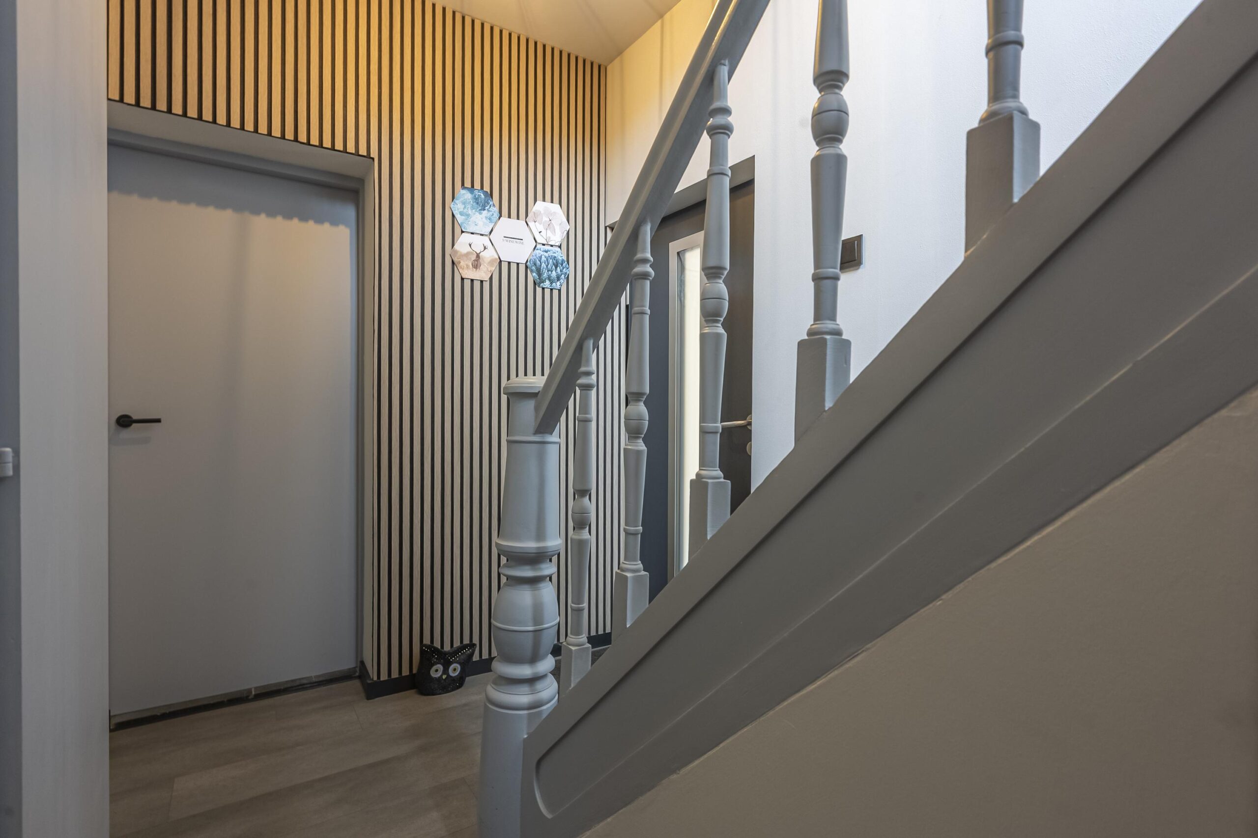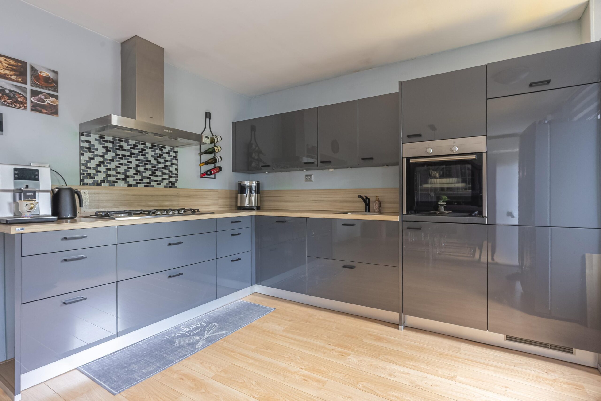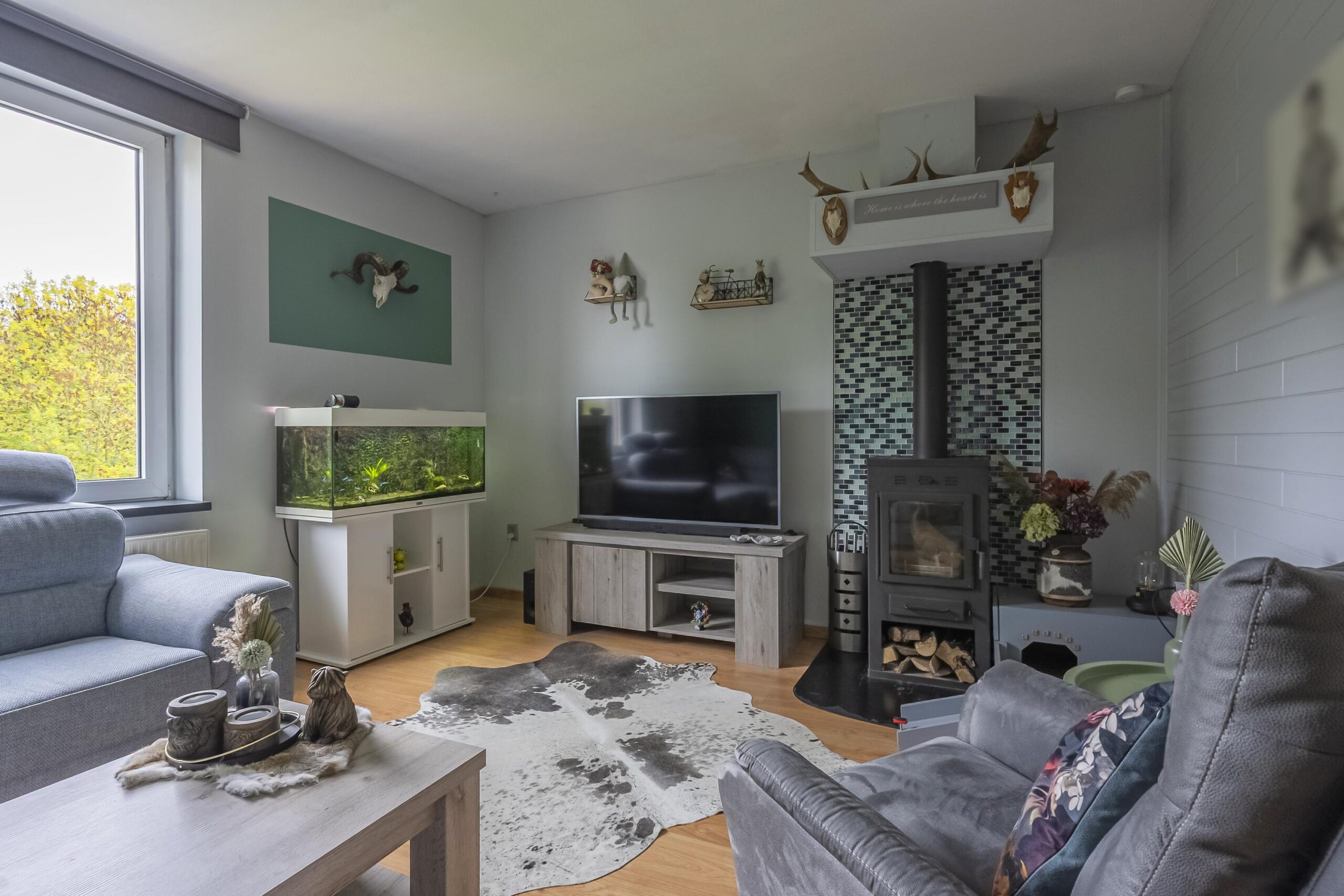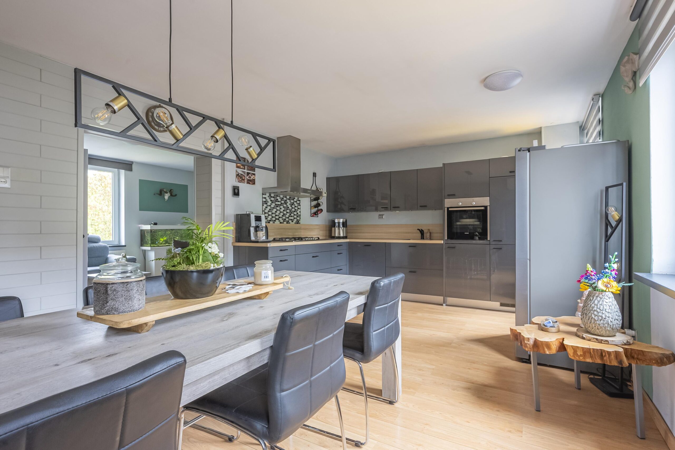 Eerste verdieping: gang, de woonkamer met laminaatvloer en houtkachel en de open leefkeuken met een keuken in hoek-opstelling voorzien van een 5-pits gaskookplaat, afzuigkap, vaatwasser, oven en koelkast.