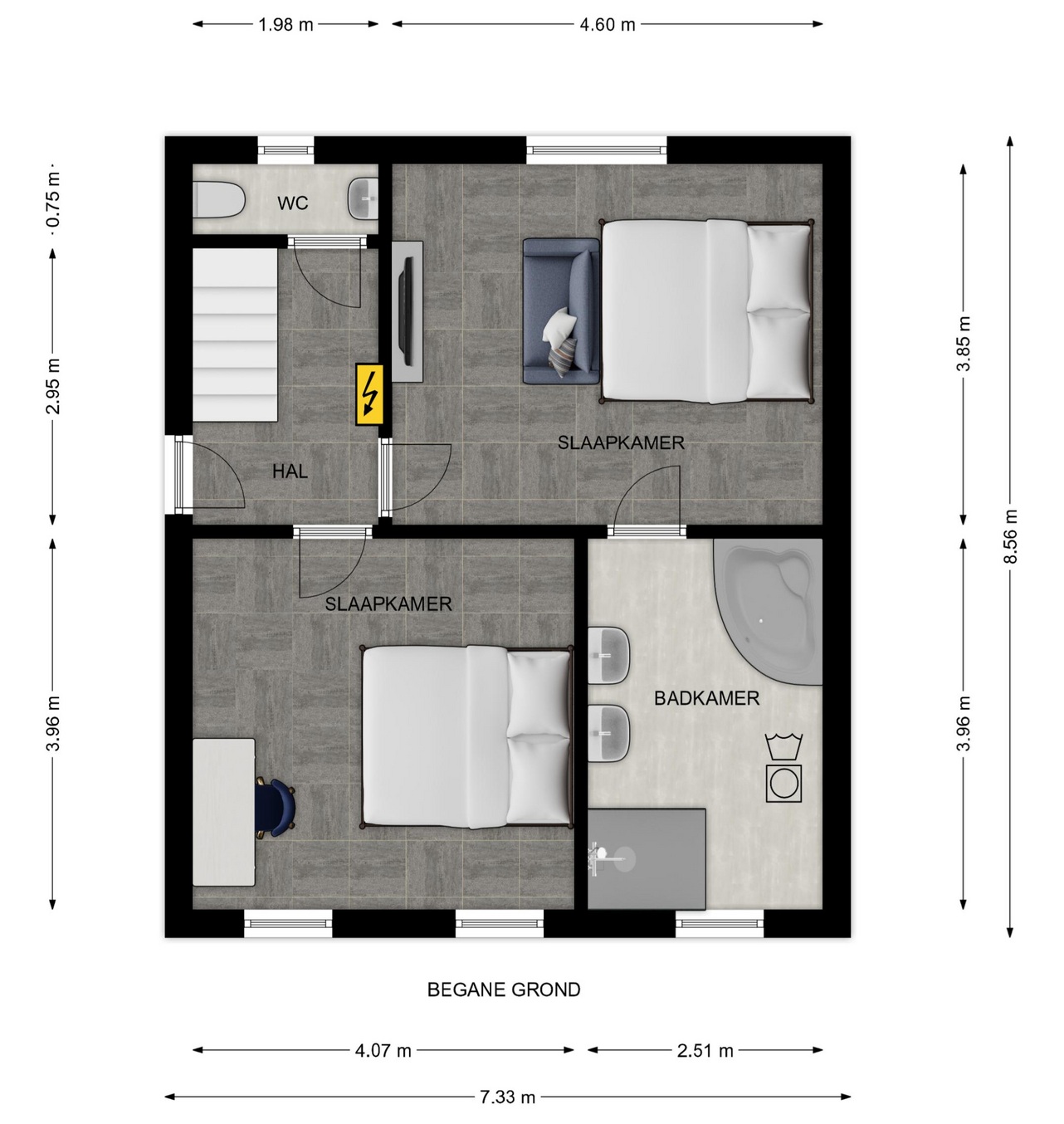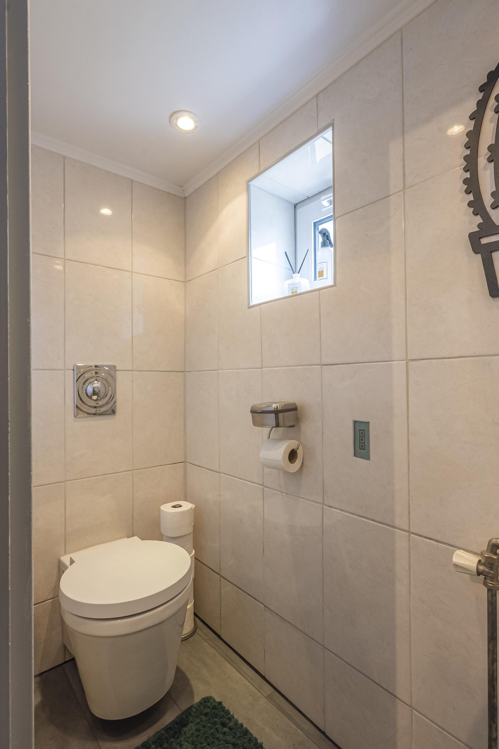 Begane grond: entree zijkant woning, hal met pvc-vloer, trappenhuis, moderne meterkast, geheel betegeld toilet met fonteintje. twee ruime kamers, nu in gebruik als slaapkamers, en een badkamer met een hoekbad, separate douche, badmeubel en 2e toilet. Deze ruimte was eerst een keuken.