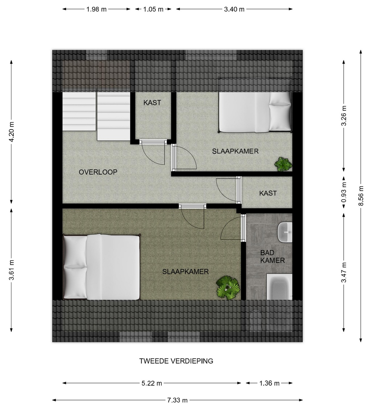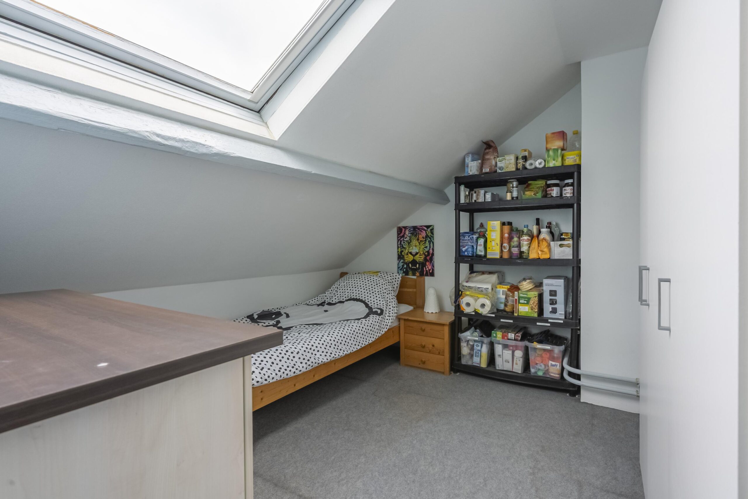 Tweede verdieping: overloop, 2 slaapkamers, één met Velux-raam en de andere uitgebouwd met een dakkapel. Tevens bevindt zich hier de tweede badkamer met een ligbad-, douchecombinatie, badmeubel en 2e toilet. Berging met C.V.-installatie.