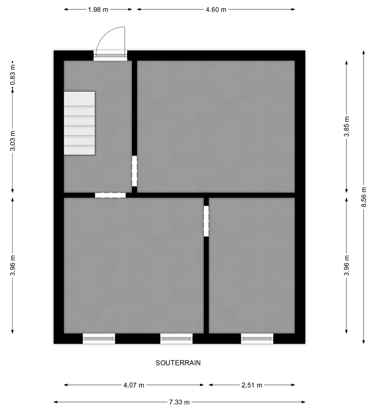 Souterrain: geheel onderkelderd en verdeeld in diverse ruimtes waaronder een provisiekelder, berging voor opslag en stalling van fietsen en dergelijke. Vanuit hier is de diepe tuin bereikbaar. Deze is ingericht met een terras, grasveld en via de zijkant van de woning bereikbaar.