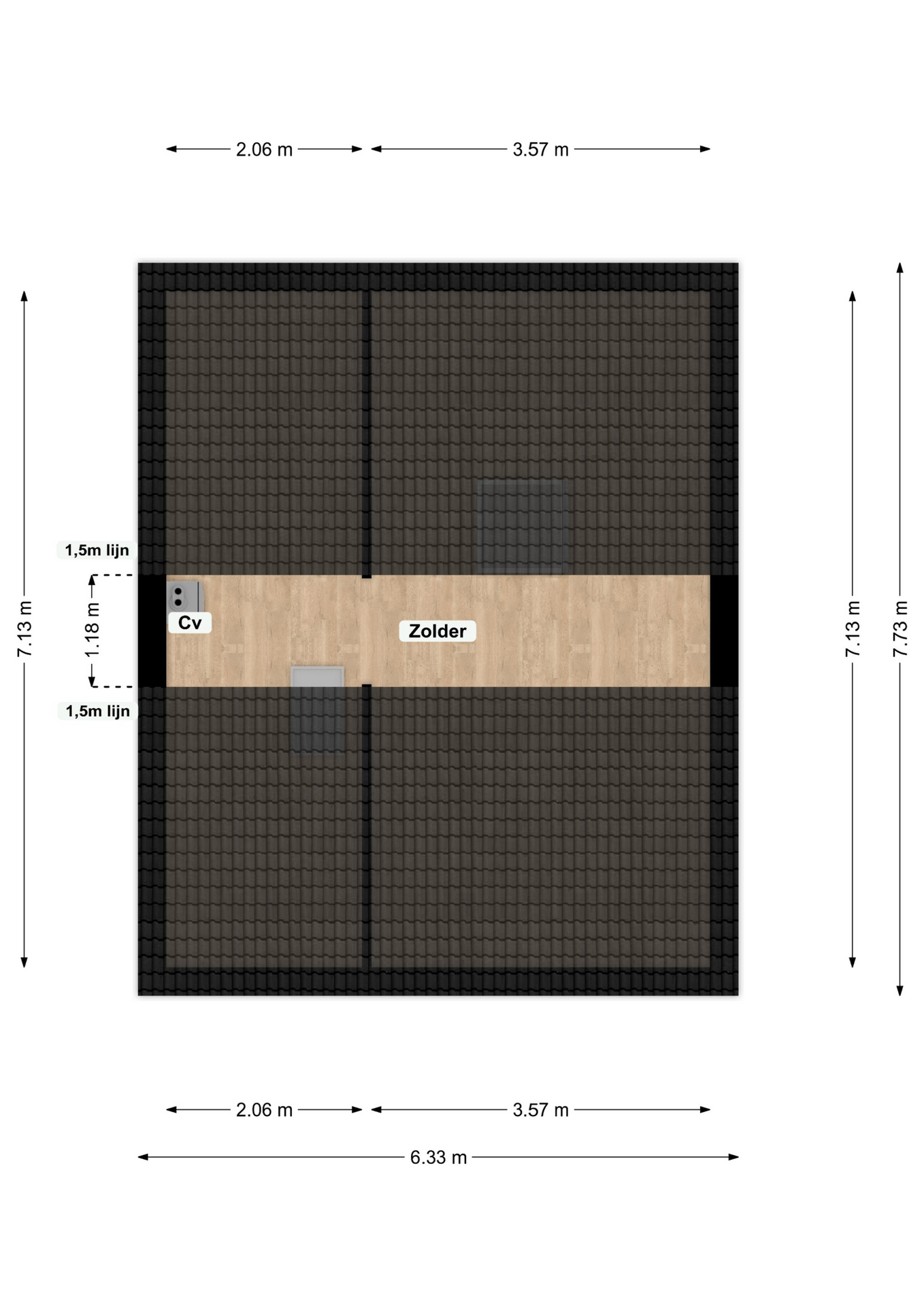 Via een vlizotrap bereikbare ruime bergzolder met dakraam en de cv-installatie (Intergas, Volta huur, 2008).