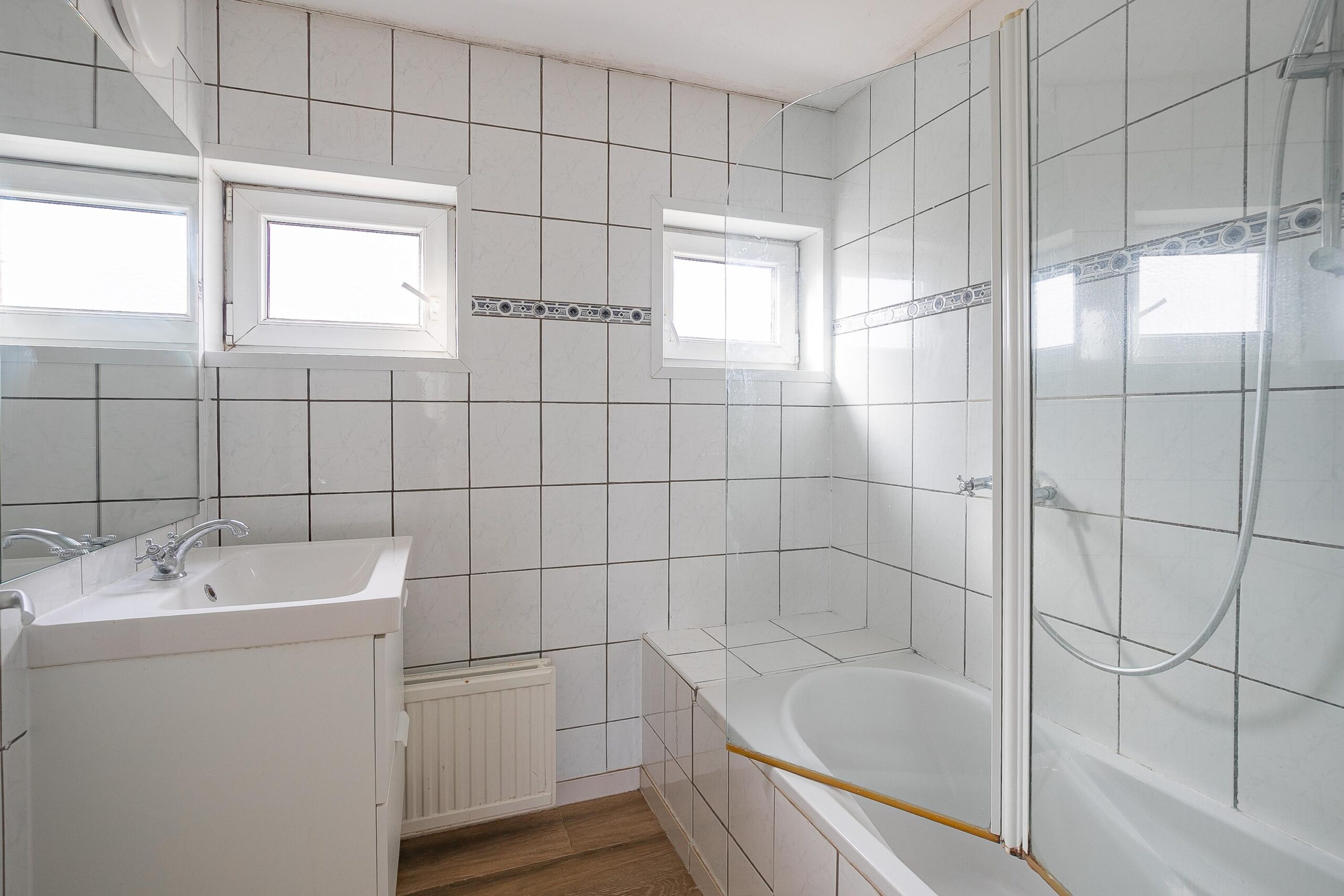 De volledig betegelde badkamer beschikt over een wastafelmeubel en ligbad met douche en heeft twee ramen voor natuurlijke ventilatie. De gehele verdieping is voorzien van een moderne laminaatvloer (m.u.v. de badkamer).