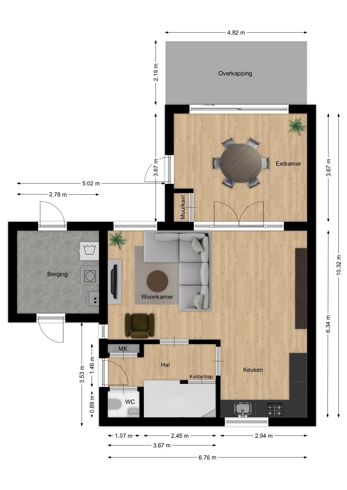 – De woonkamer, eetkamer en keuken zijn samen (49m²);