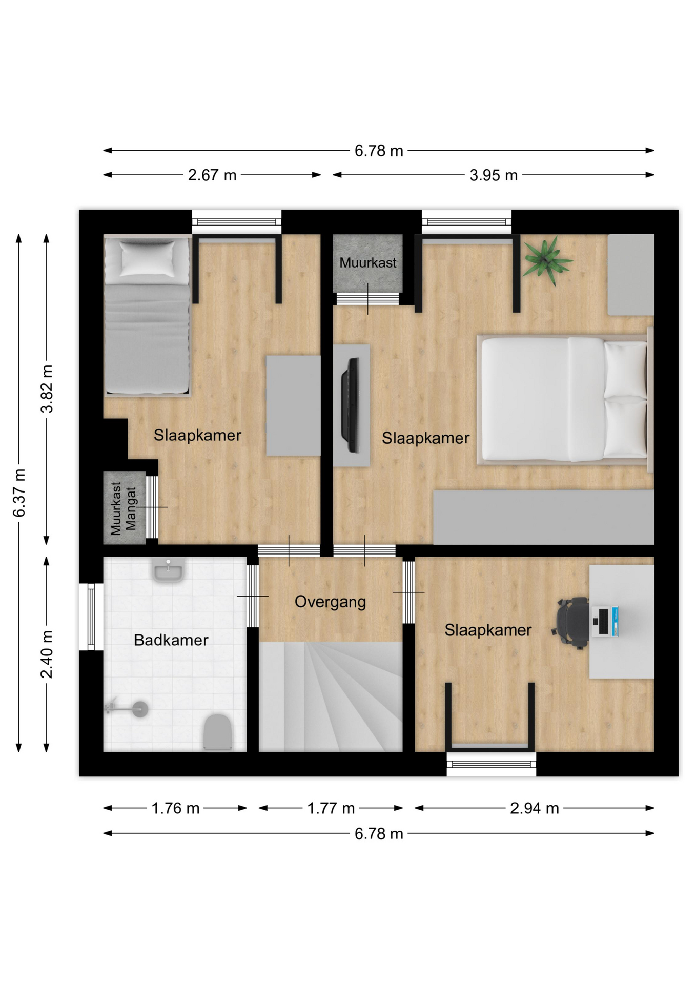 Via de overloop is er toegang tot drie slaapkamers en de badkamer. Aan de voorzijde ligt een slaapkamer van circa 7 m². Aan de achterzijde liggen twee slaapkamers van circa 14 m² en circa 9 m². In één van de slaapkamers is in de inbouwkast een mangat aanwezig dat toegang biedt tot de praktische bergzolder. Alle slaapkamers zijn voorzien van rolluiken, wat zorgt voor extra comfort en verduistering. De badkamer is ingericht met een douche, wastafel en toilet.
