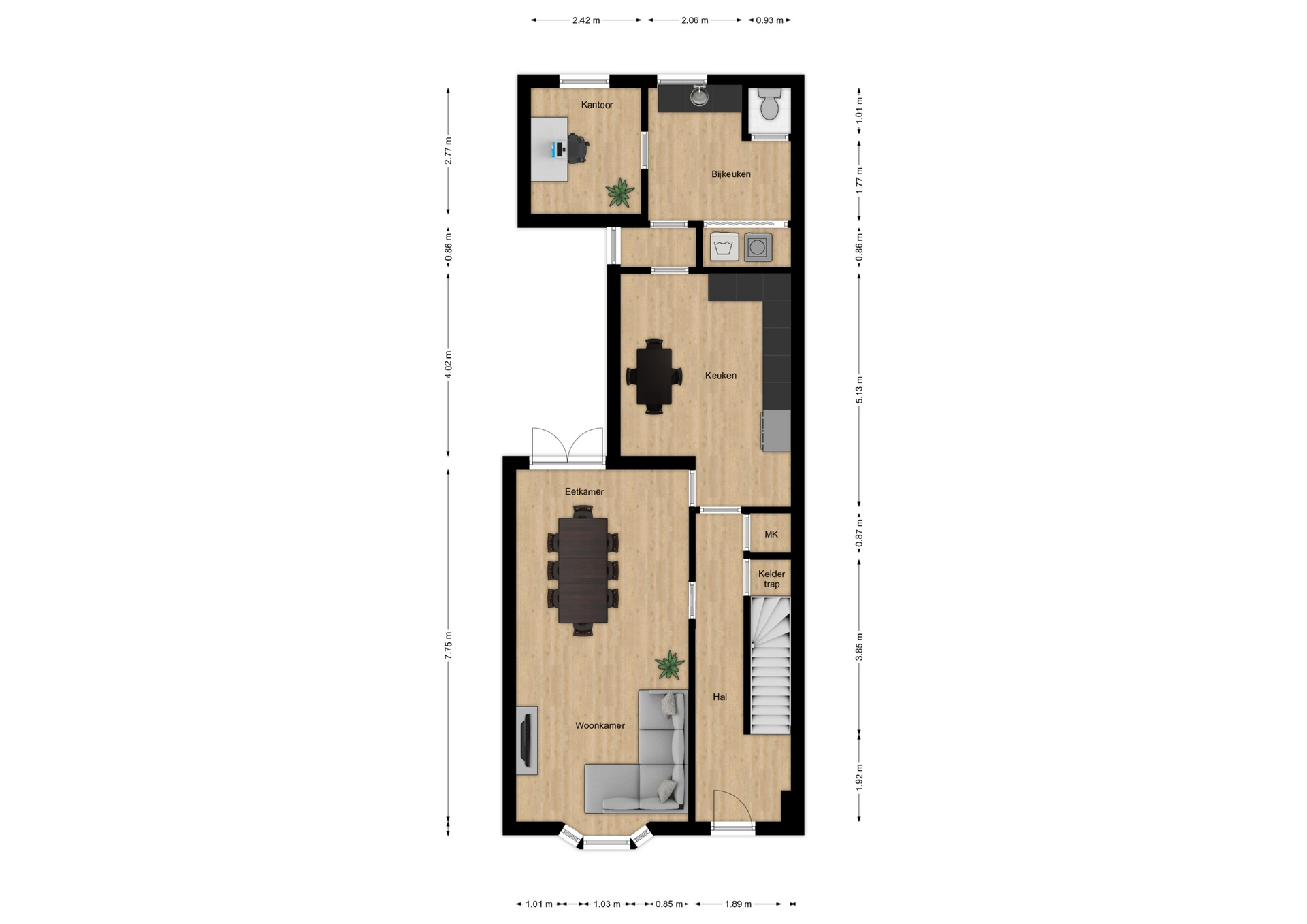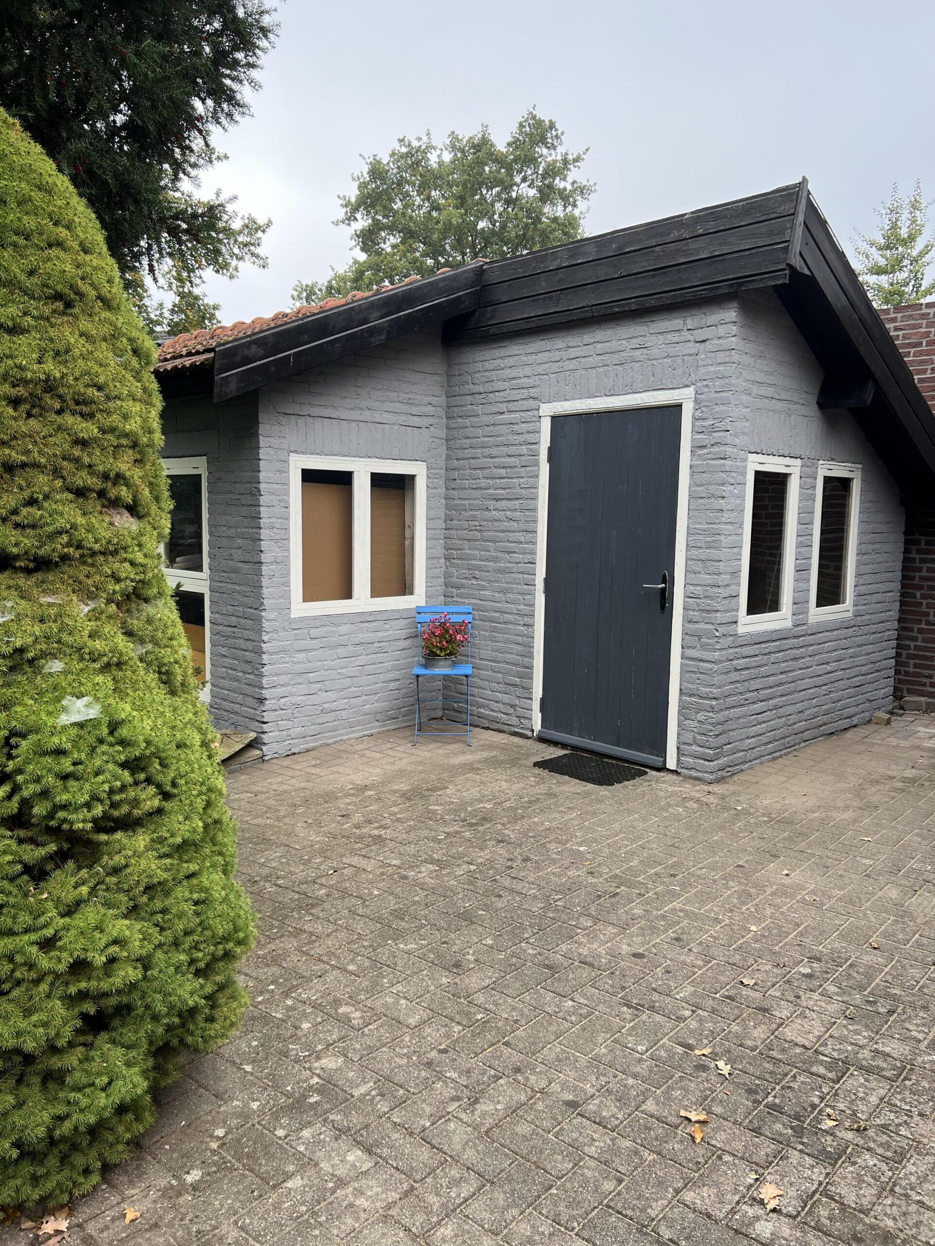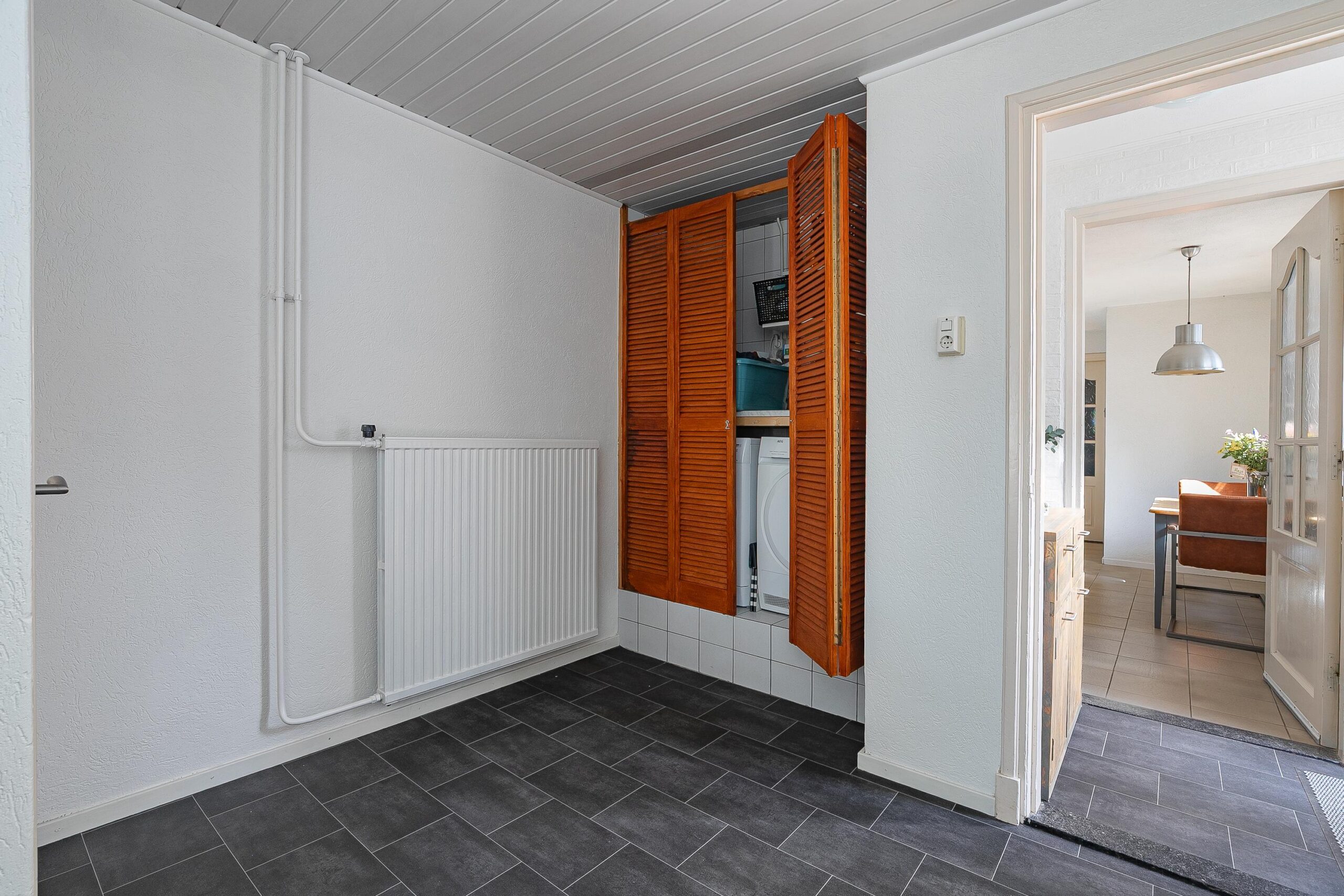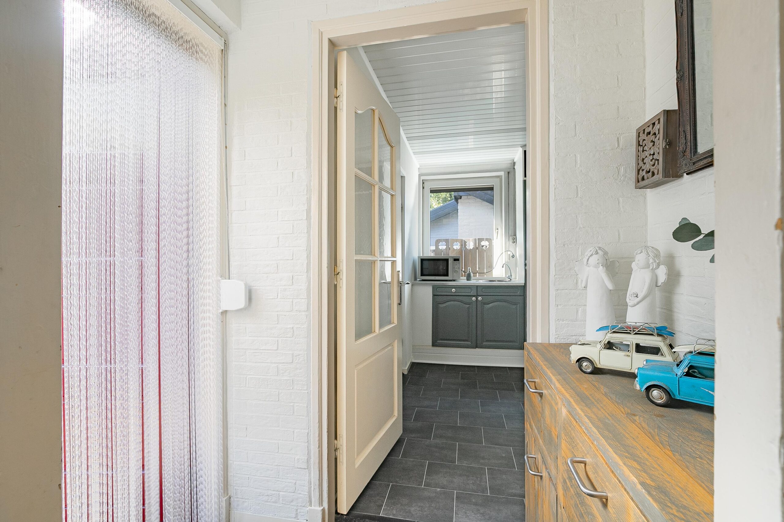 Aan de achterzijde van de woning bevindt zich een bijkeuken met toilet, witgoedaansluitingen en een separate kantoorruimte.