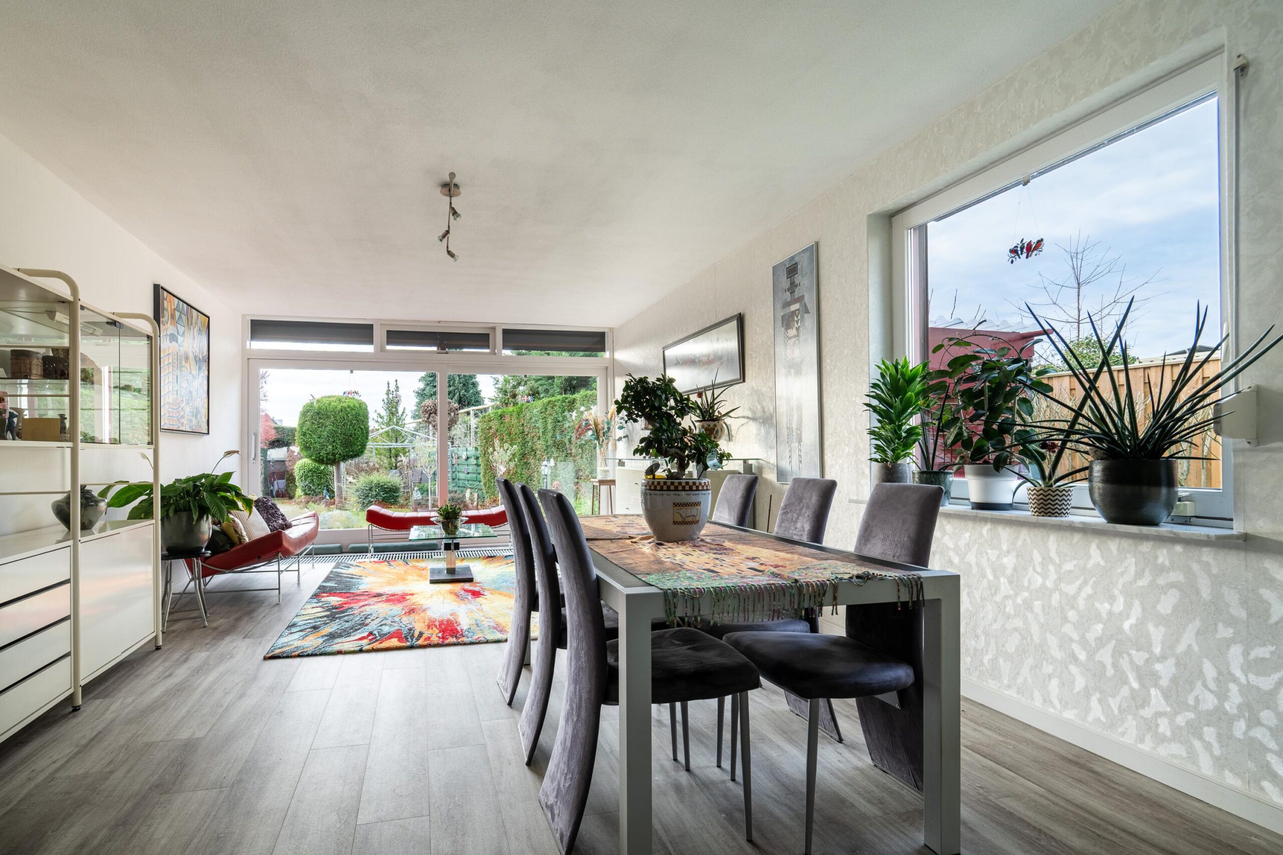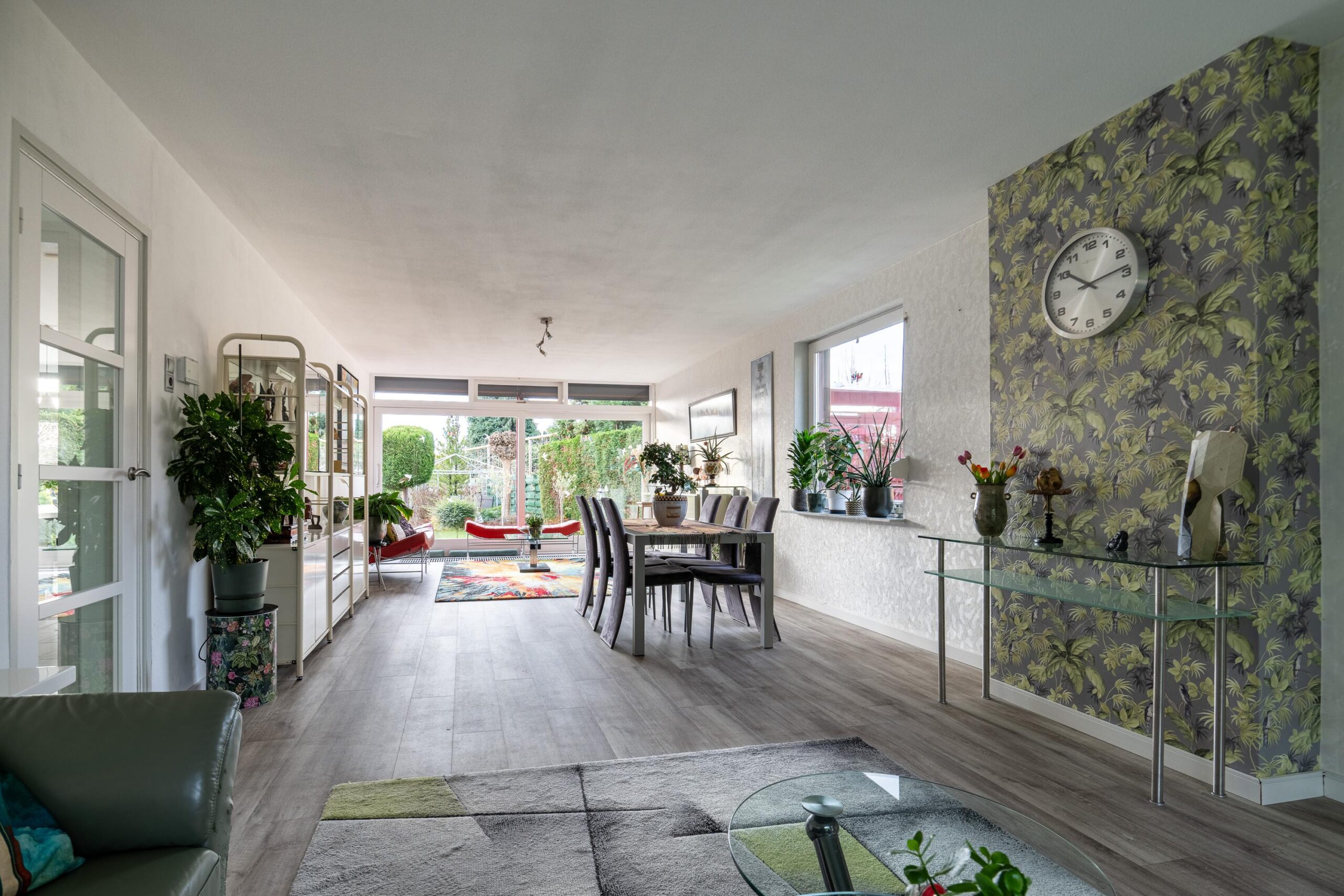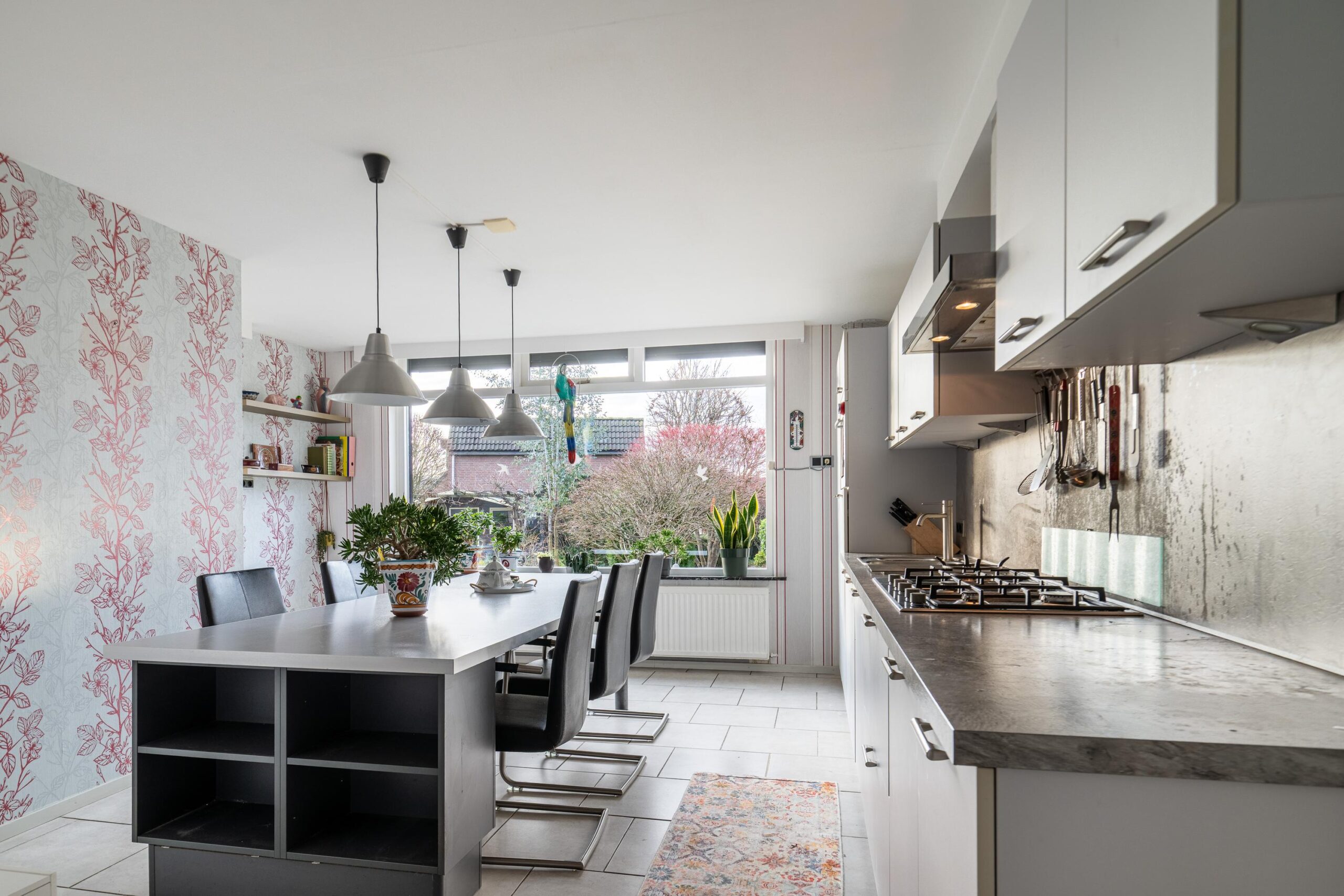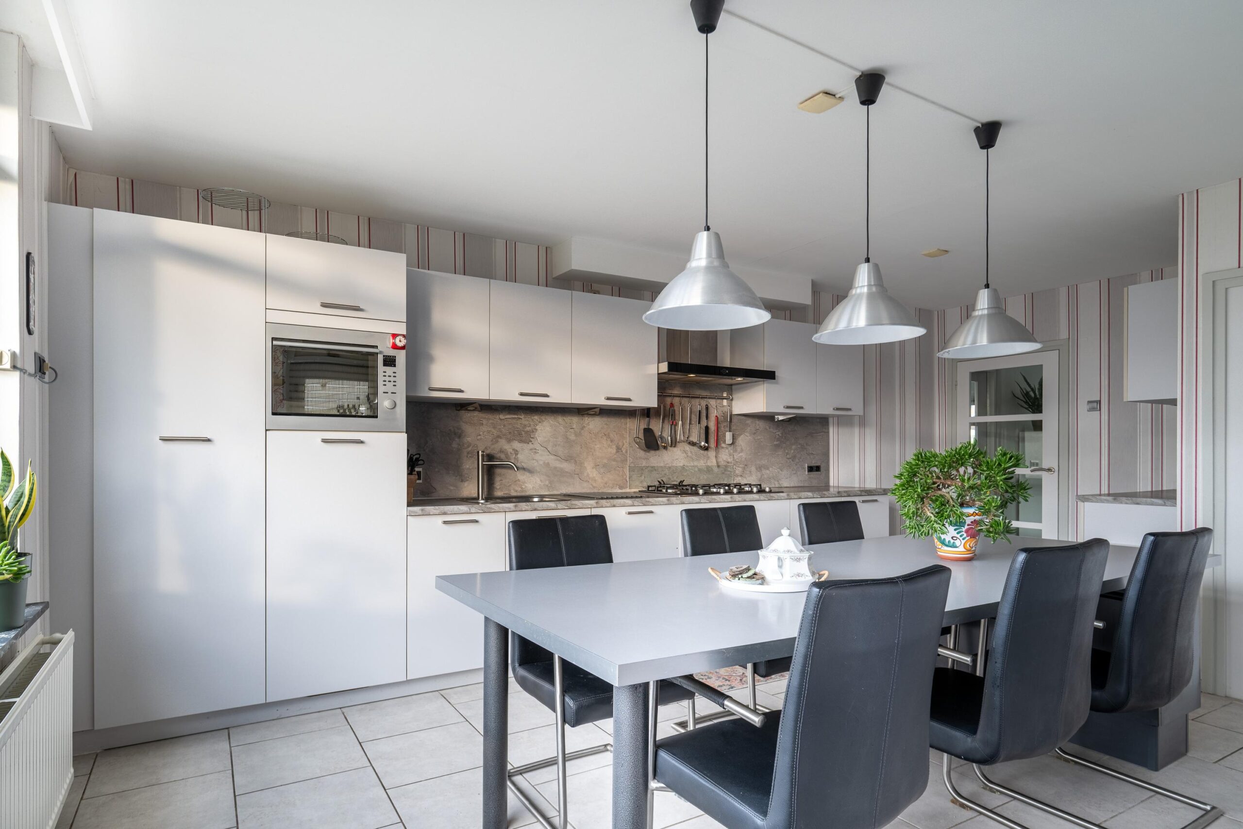 Aan de rechterzijde van de hal bevindt zich de royale woonkamer 11.39 x 4.09 met een prettige, natuurlijke lichtinval van meerdere zijden. De woonkamer heeft een moderne uitstraling en staat in direct contact met de tuin via een grote schuifpui aan de achterzijde. Hierdoor ontstaat een fijne verbinding tussen binnen en buiten en is er optimaal tuincontact met de fraai aangelegde achtertuin. Aangrenzend aan de woonkamer bevindt zich de ruim opgezette leefkeuken 6.30 x 3.55, uitgevoerd in een lichtgrijze keukeninstallatie en voorzien van diverse inbouwapparatuur, waaronder een 5-pits gaskookplaat, vaatwasser, koelkast, combimagnetron en afzuigkap.