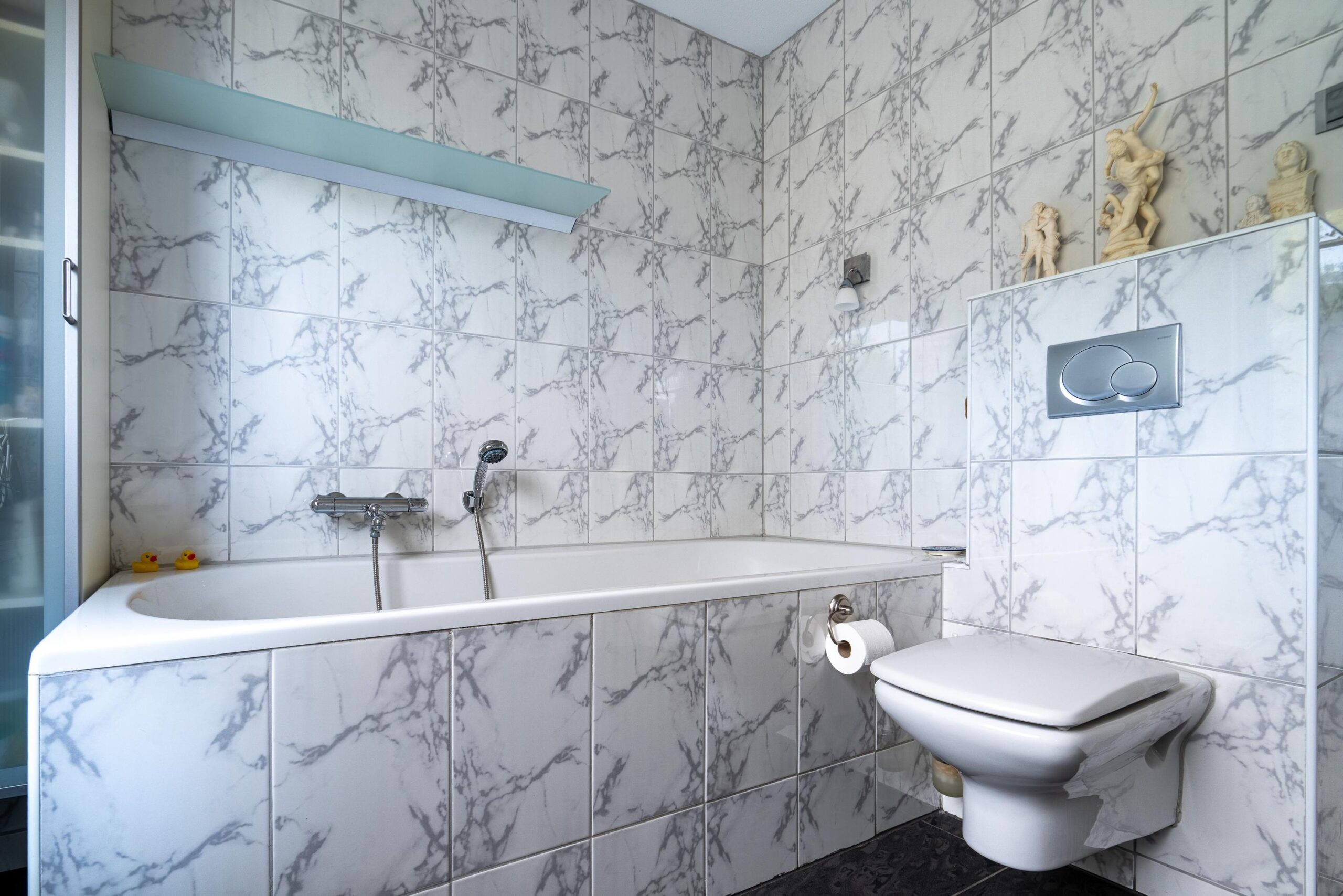 – Badkamer 2: is volledig betegeld en uitgerust met een ligbad, vrijhangend toilet, radiator en een brede wastafel met bijpassend badmeubel. Een raam zorgt hier voor natuurlijke ventilatie en daglicht.