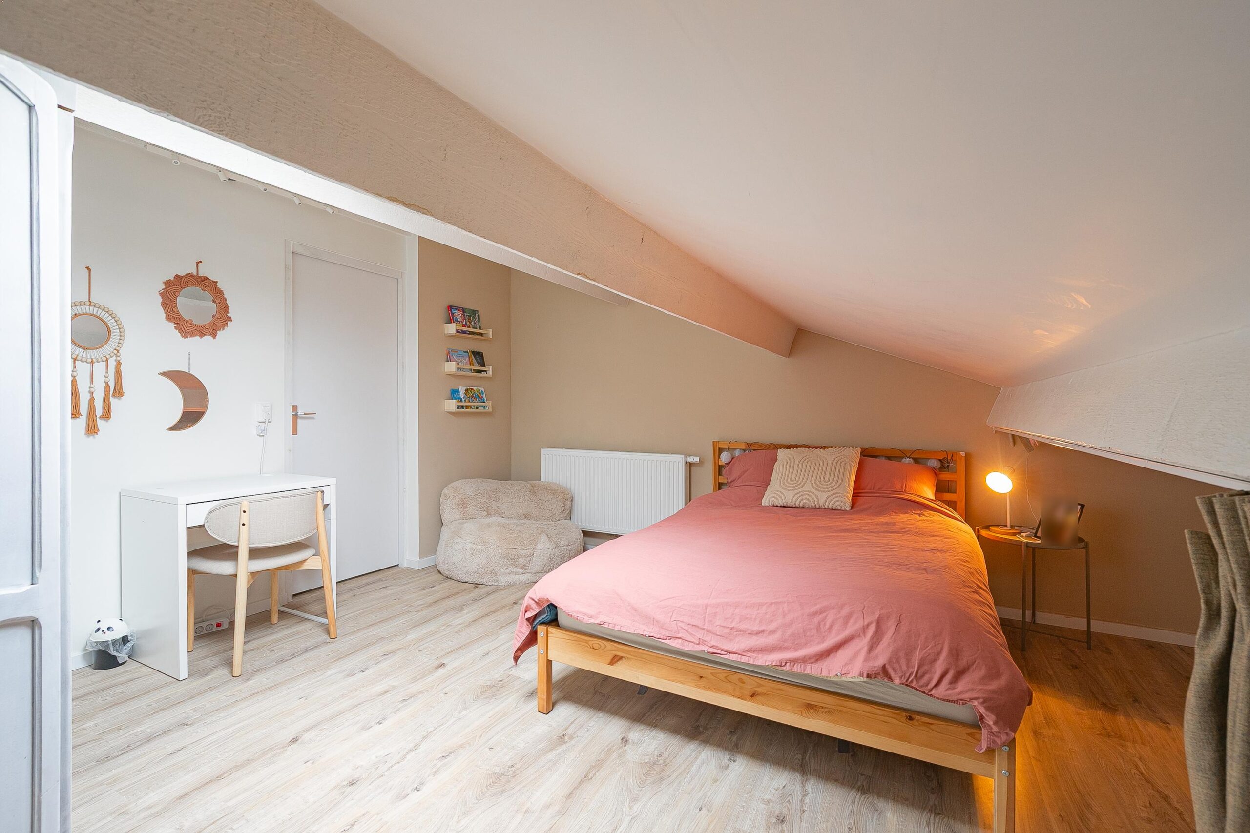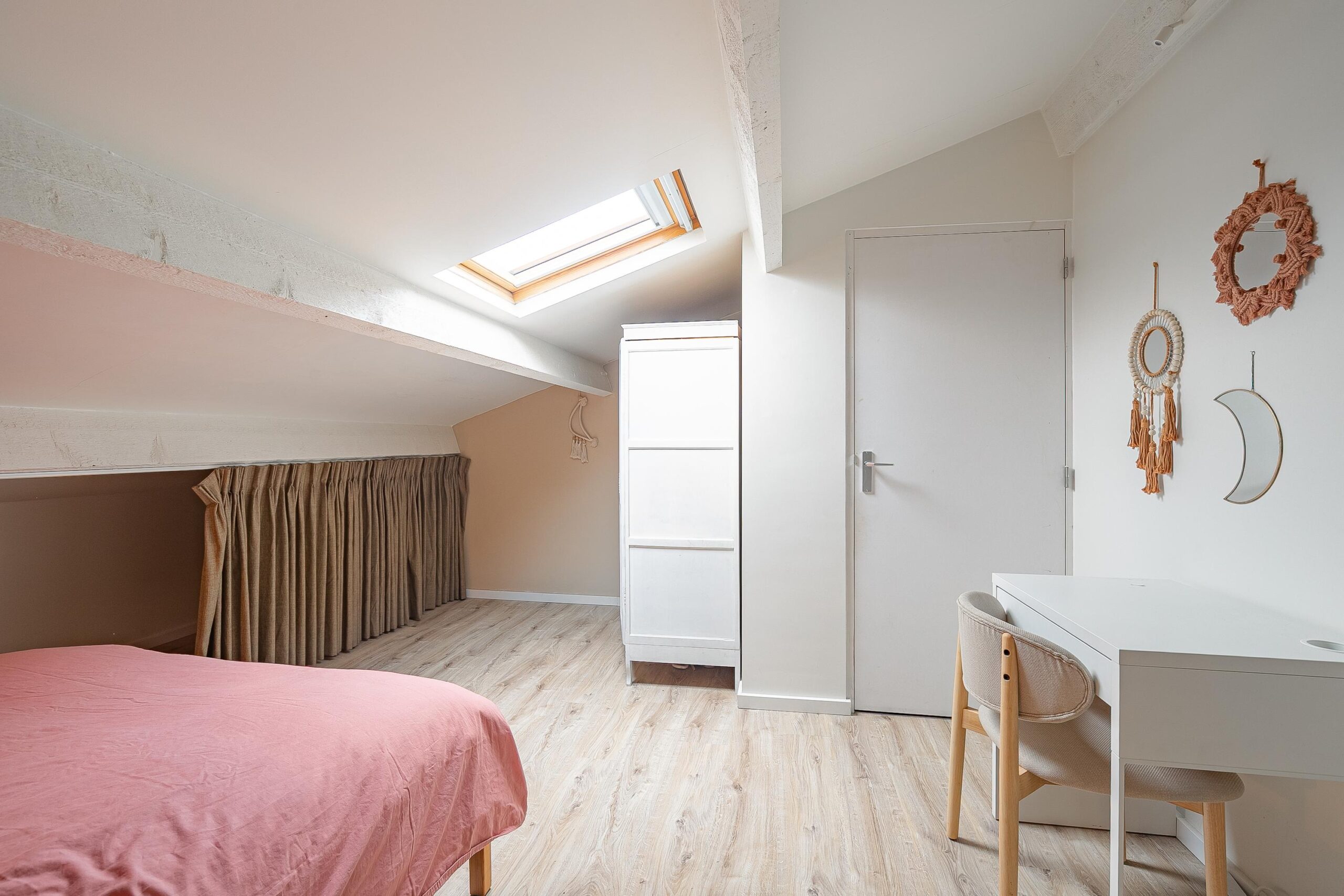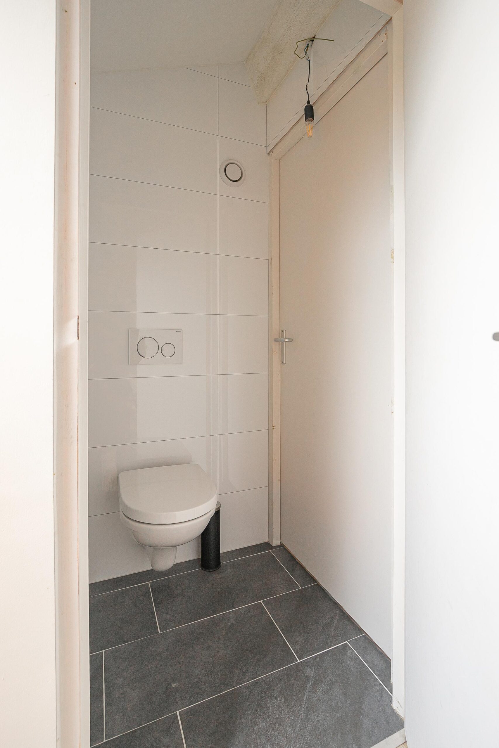 Via de hal is de trap naar de eerste verdieping bereikbaar. Deze verdieping bestaat uit twee slaapkamers (ca. 8,3 & 12m²), die beide toegang hebben tot een separaat toiletruimte met twee toegangsdeuren. Beide slaapkamers zijn voorzien van een dakraam voor voldoende natuurlijk licht en bieden voldoende opbergruimte dankzij de handige vlizoruimte en de berging achter de knieschotten.