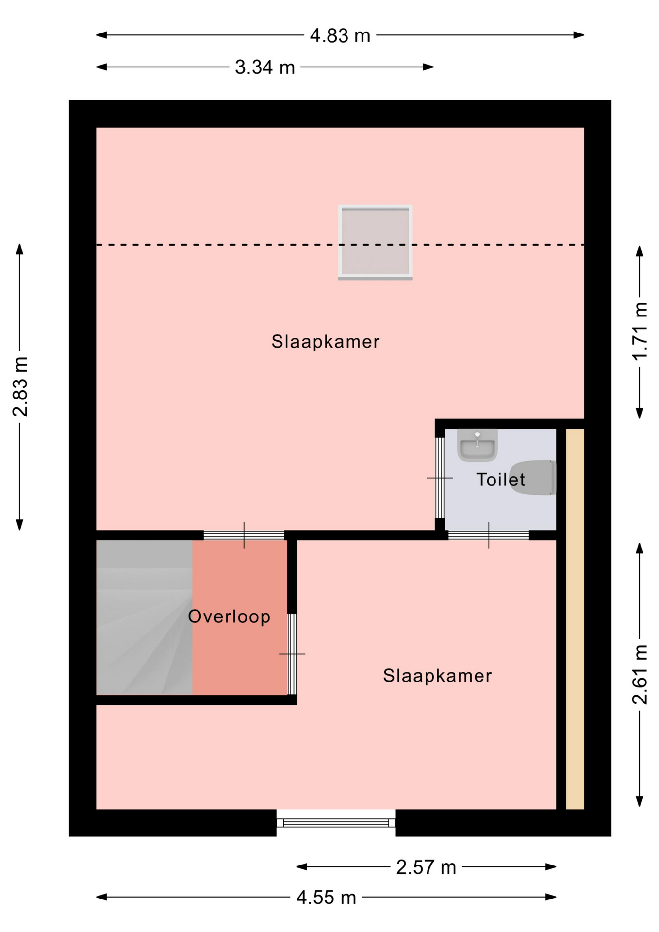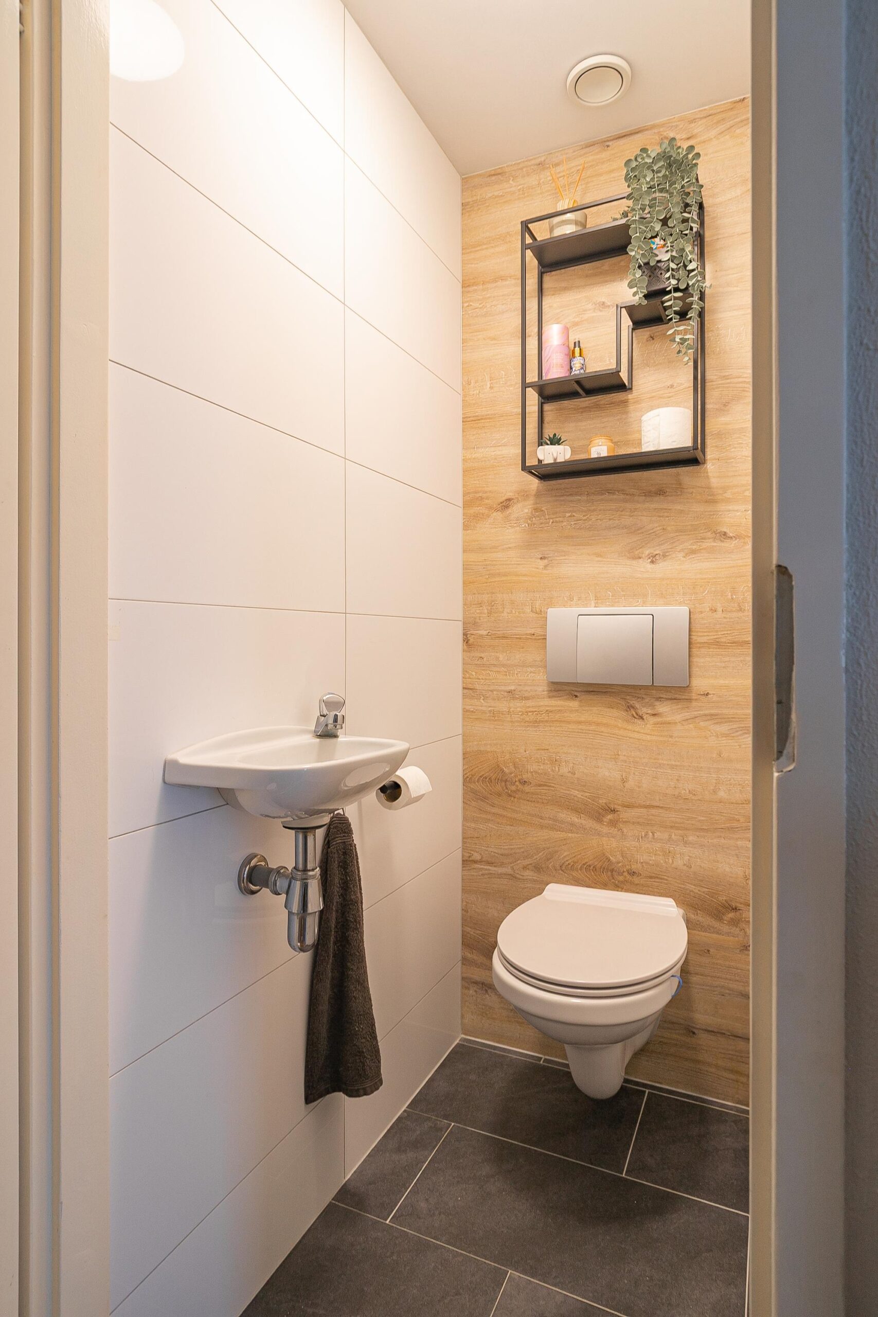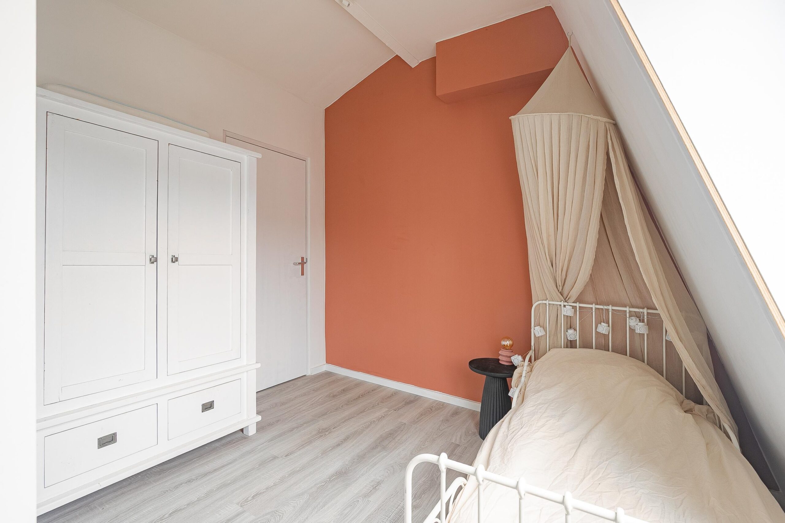 Via de hal is de trap naar de eerste verdieping bereikbaar. Deze verdieping bestaat uit twee slaapkamers (ca. 8,3 & 12m²), die beide toegang hebben tot een separaat toiletruimte met twee toegangsdeuren. Beide slaapkamers zijn voorzien van een dakraam voor voldoende natuurlijk licht en bieden voldoende opbergruimte dankzij de handige vlizoruimte en de berging achter de knieschotten.