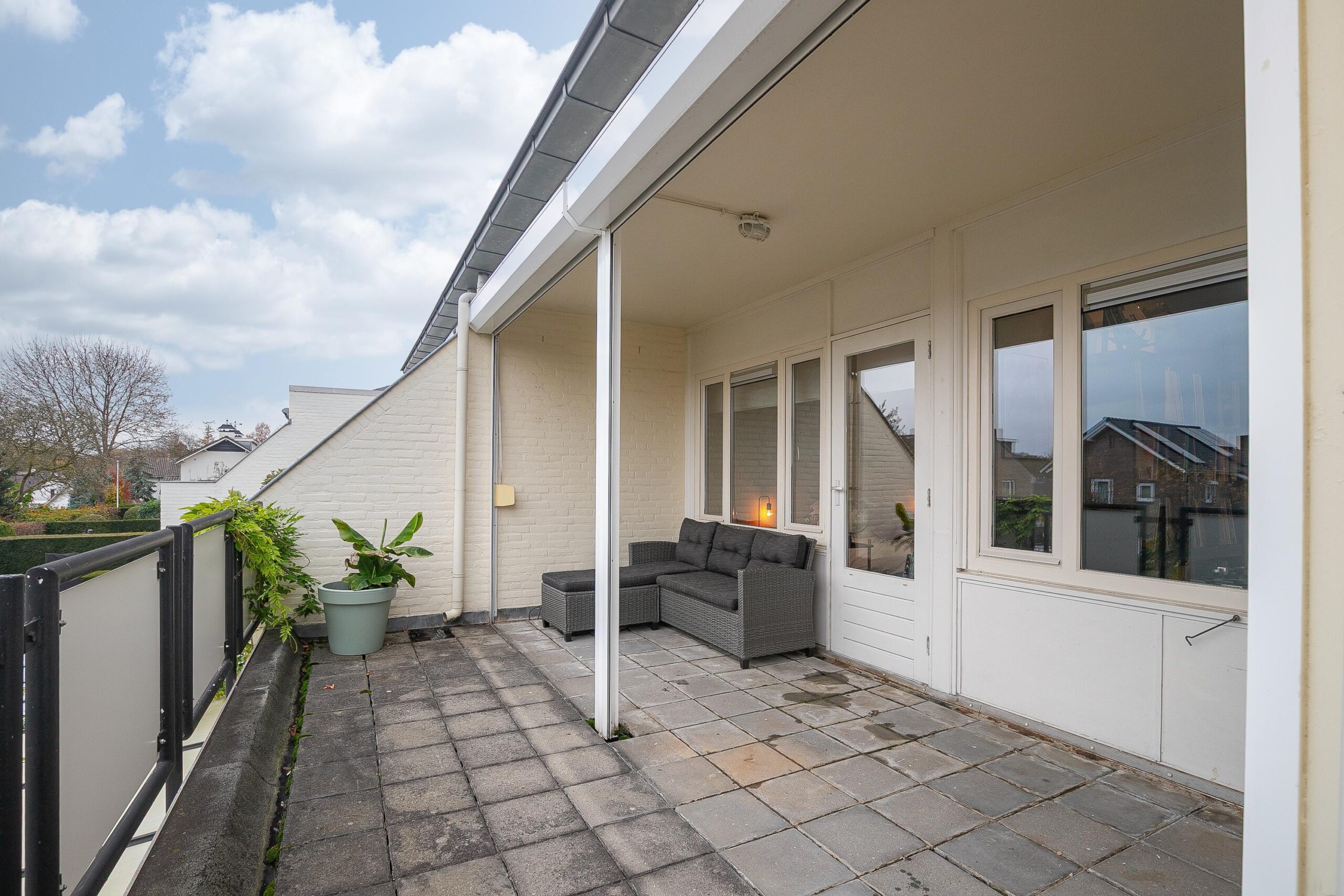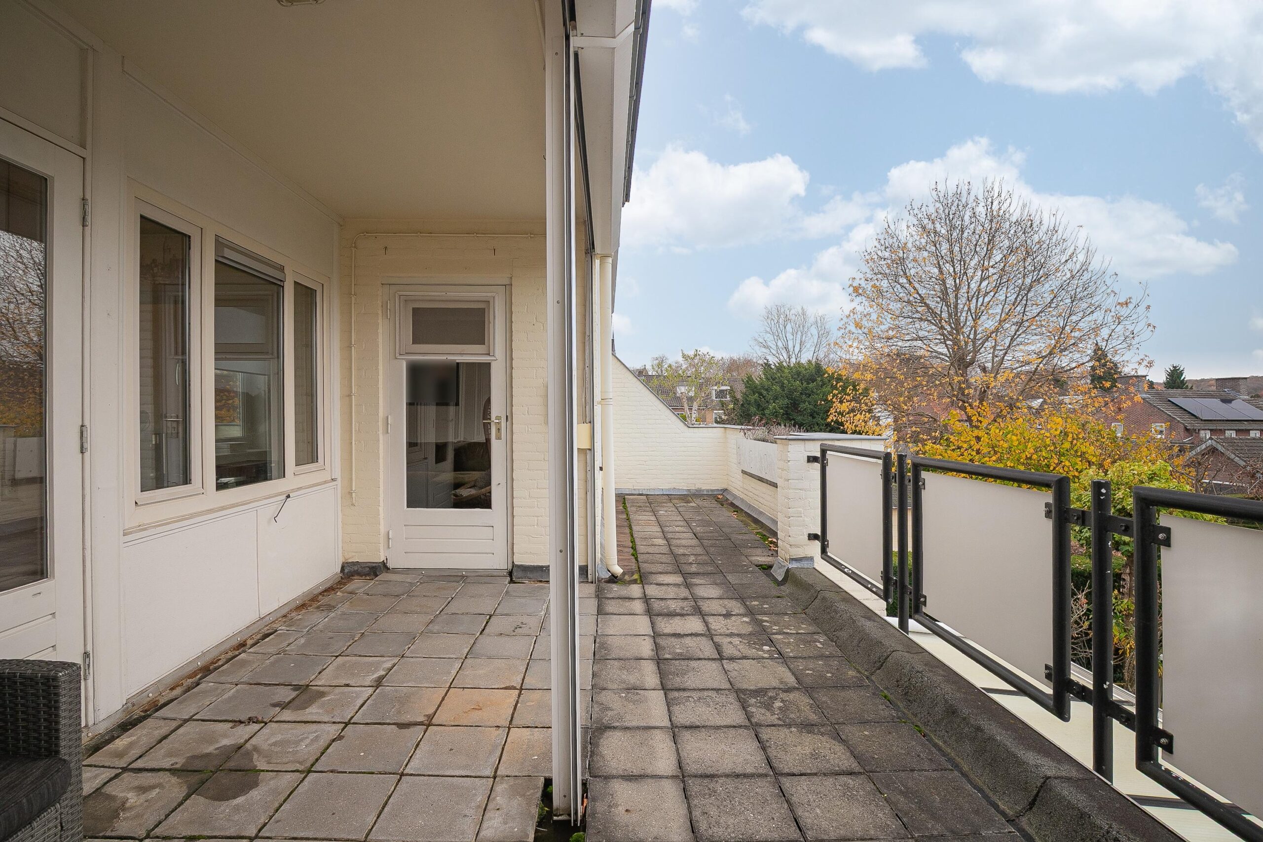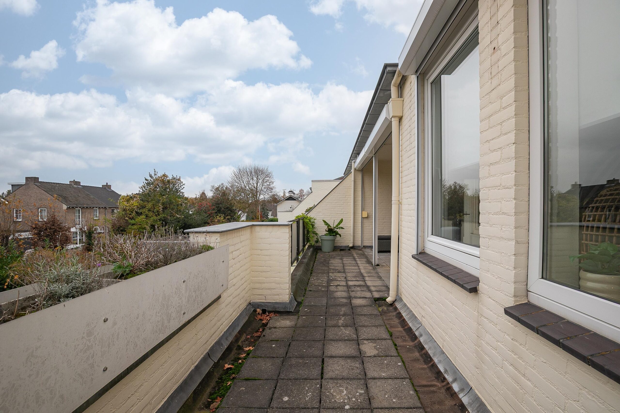 Het sfeervol betegelde balkon van ongeveer 23m² is bereikbaar vanuit zowel de woonkamer als de slaapkamer op de begane grond. Het balkon is uitgerust met twee elektrische zonneschermen en ligt op het zuiden. Vanaf het balkon is er een vrij uitzicht op een mooie groenstrook, de Proostenbuurt en het station.