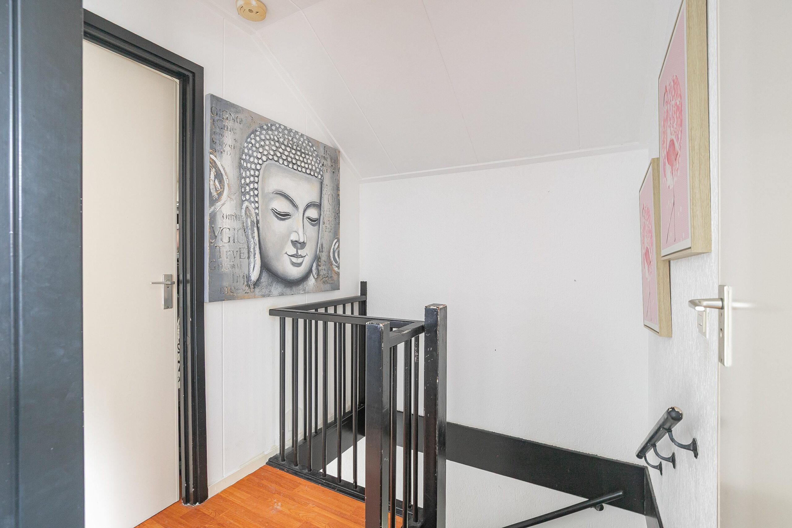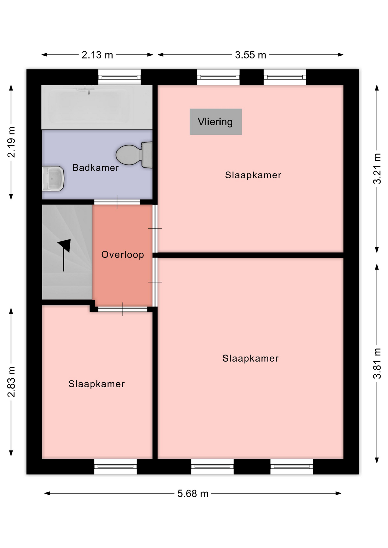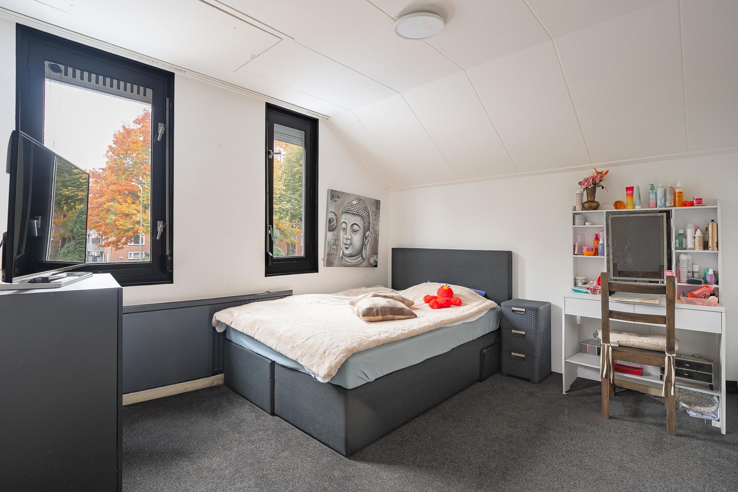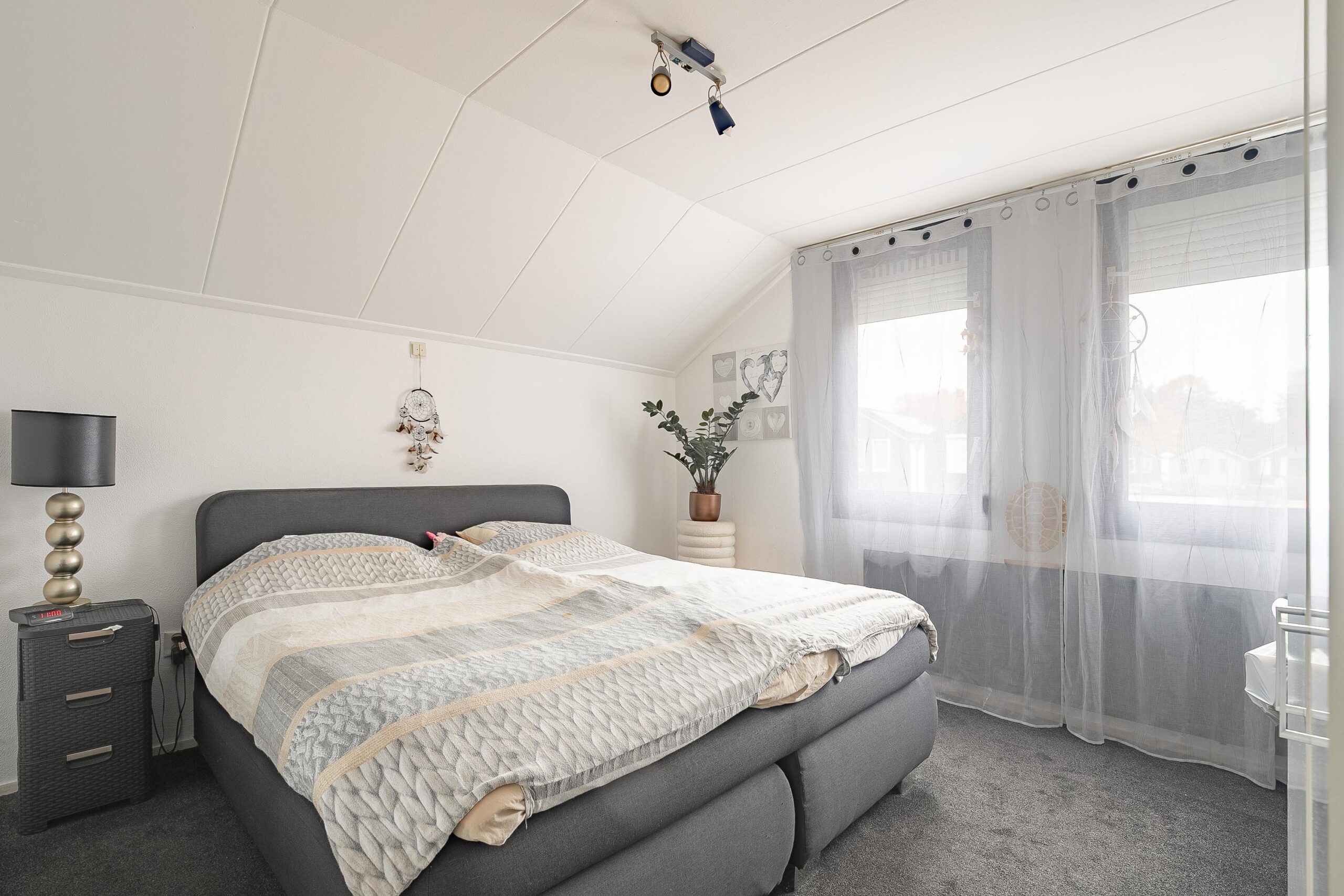 Via een vaste trap bereikt men de overloop met toegang tot drie slaapkamers en de badkamer. De slaapkamers (ca. 16m², 13m² en 6m²) zijn voorzien van donkere vloerbedekking. De badkamer (ca. 5m²) is volledig betegeld en voorzien van een ligbad, toilet en wastafelmeubel. De overloop is voorzien van een laminaatvloer. Verder heeft men vanuit de slaapkamer aan de achterzijde toegang tot de vliering, die extra bergruimte biedt.