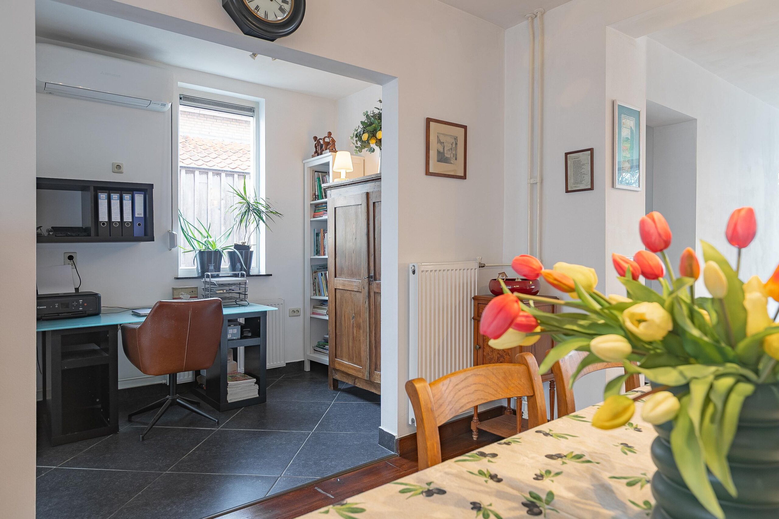 De ruime woonkamer (circa 36 m²) staat in open verbinding met de royale leefkeuken (circa 16 m²) en vormt een prettige, open leefruimte. De woonkamer is bovendien voorzien van een airconditioning, wat zorgt voor extra comfort. Vanuit de woonkamer is tevens de kelder bereikbaar, waar zich een praktische trapkast bevindt met de opstelling van de cv-ketel.