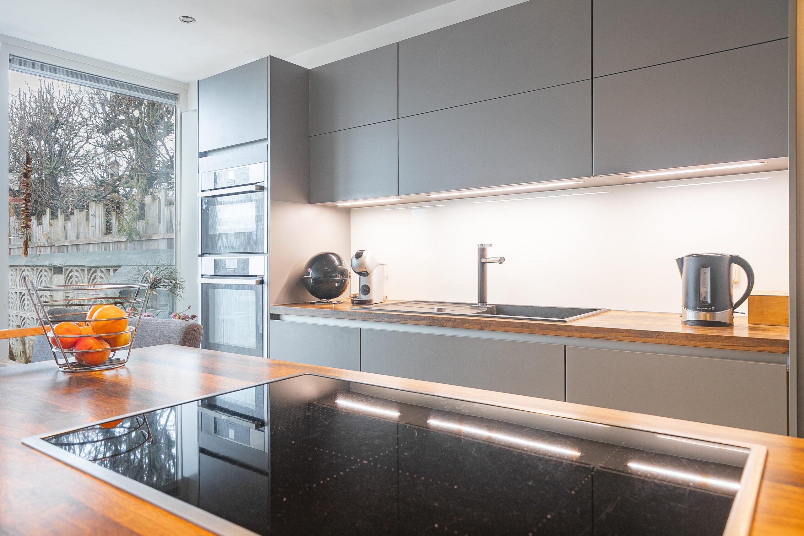 De keuken is uitgevoerd met een kookeiland en voorzien van diverse inbouwapparatuur, waaronder een inductiekookplaat, twee ovens (waarvan één combimagnetron en één stoomoven met praktische inschuifdeur), een spoelbak, afzuigkap en vaatwasser. Via de openslaande deuren is er direct toegang tot de tuin, wat zorgt voor veel lichtinval en een fijne verbinding met buiten. Vanuit de keuken zijn daarnaast het toilet en de badkamer op de begane grond bereikbaar. De badkamer is uitgerust met een inloopdouche en wastafel. Hier bevinden zich tevens de elektrische boiler en de witgoedaansluitingen.