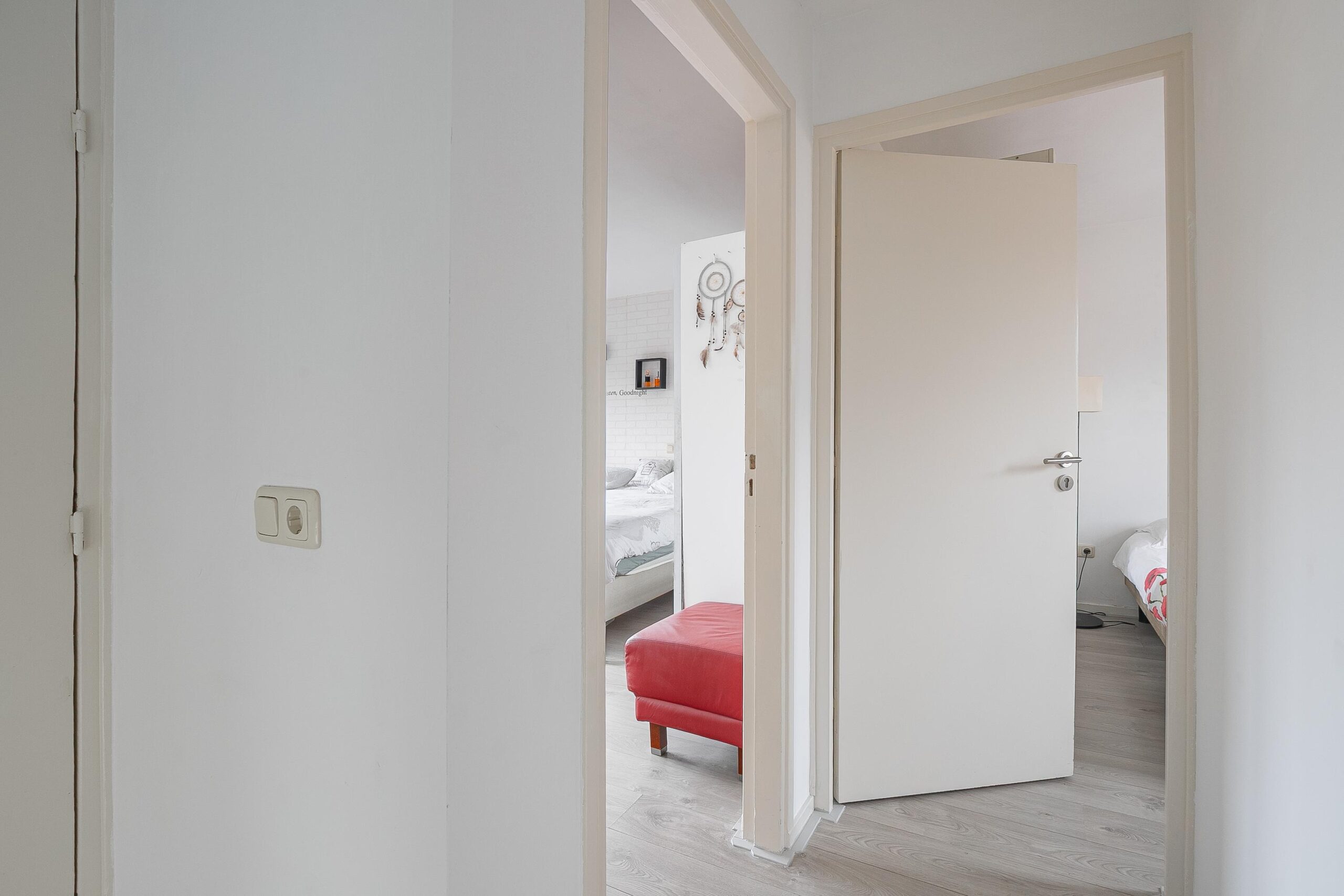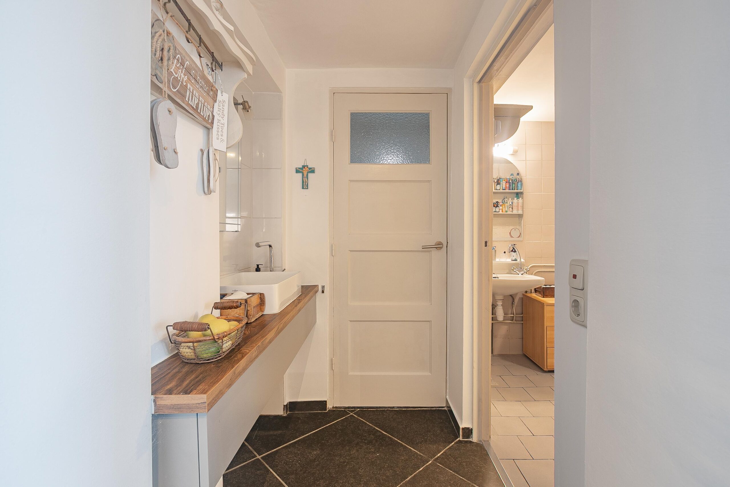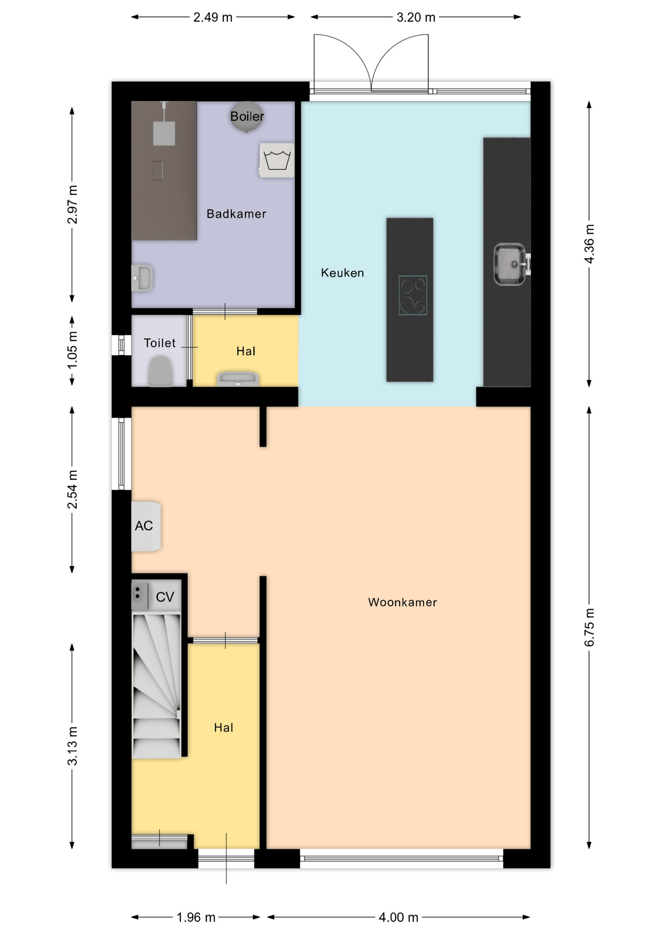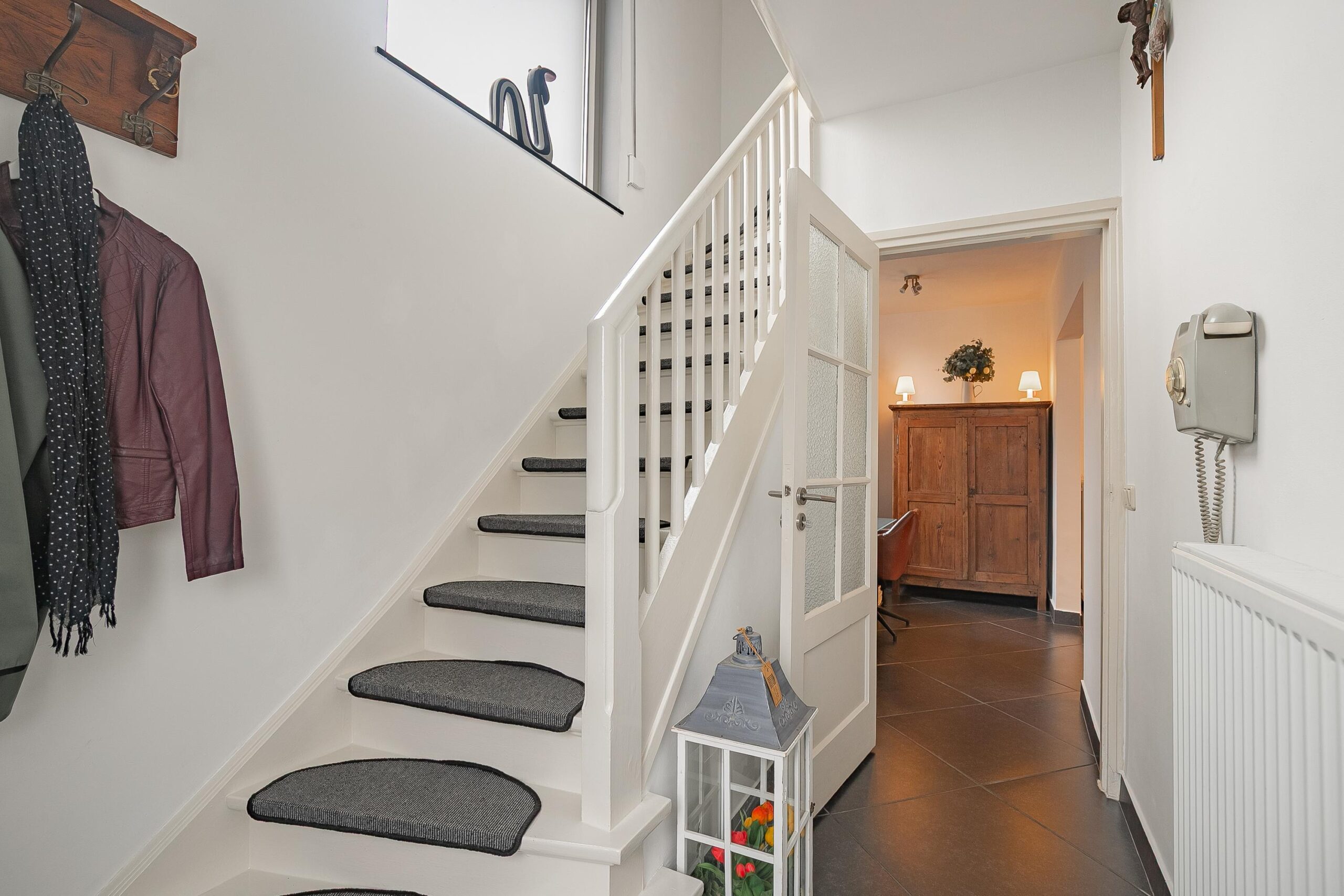 Via de entree betreedt u de hal met toegang tot de meterkast, de woonkamer en de trapopgang naar de eerste verdieping.