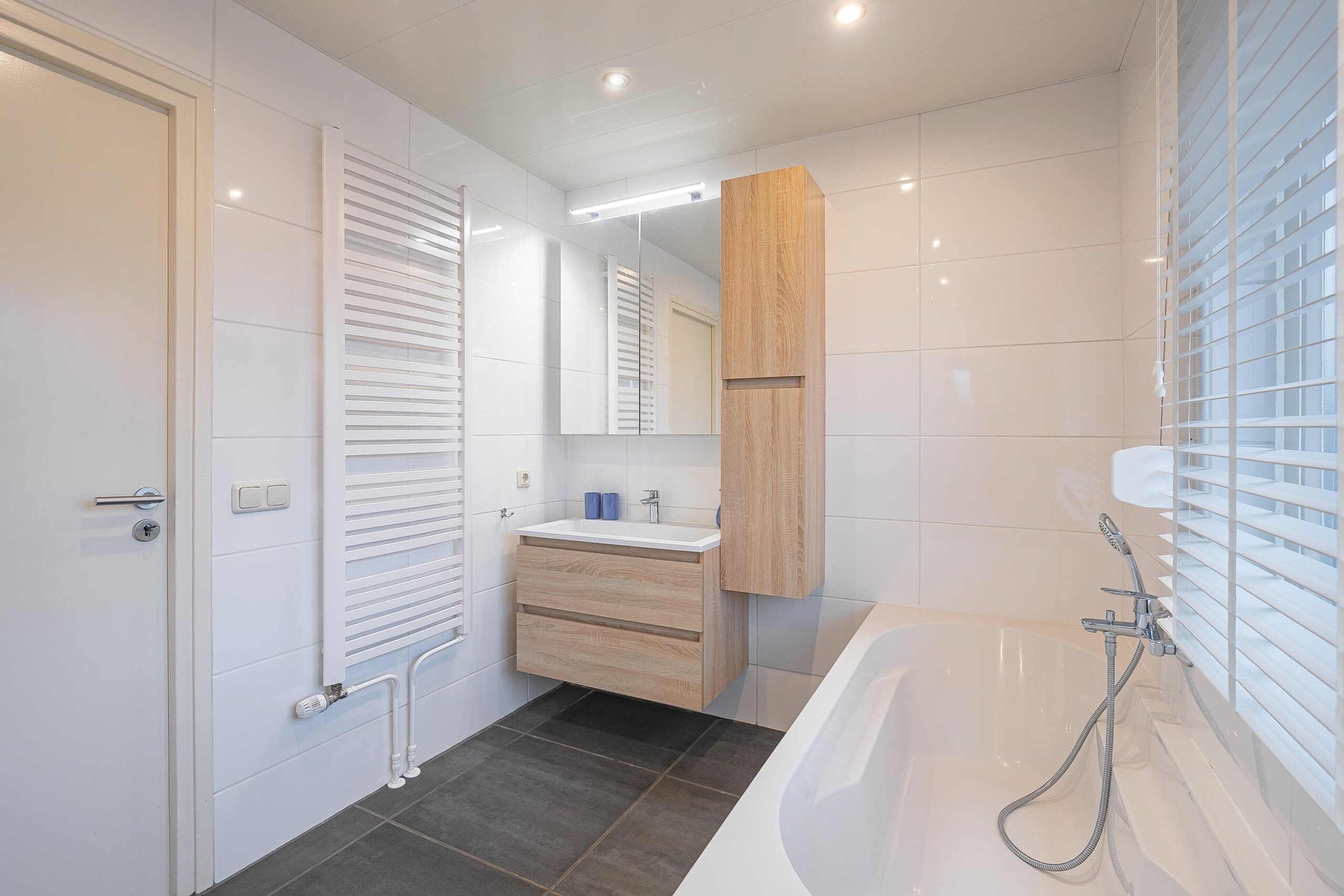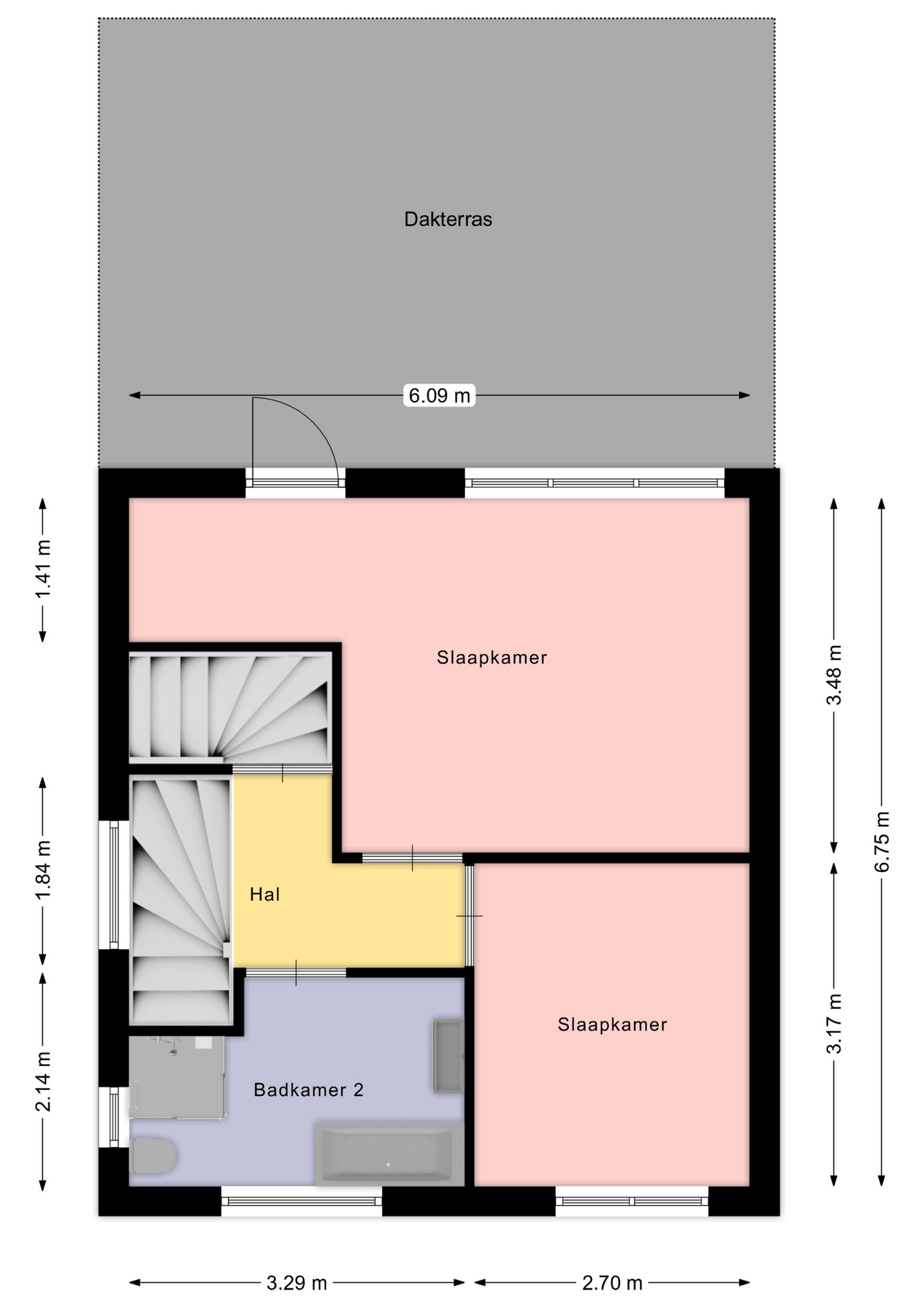 De overloop biedt toegang tot twee slaapkamers van circa 9 m² en 17 m², beide voorzien van rolluiken. De grootste slaapkamer, gelegen aan de achterzijde van de woning, heeft toegang tot het dakterras. Daarnaast bevindt zich op deze verdieping een tweede badkamer (circa 6 m²), voorzien van een ligbad, douche, toilet en wastafel. Vanuit de overloop leidt een vaste trap naar de zolderverdieping.