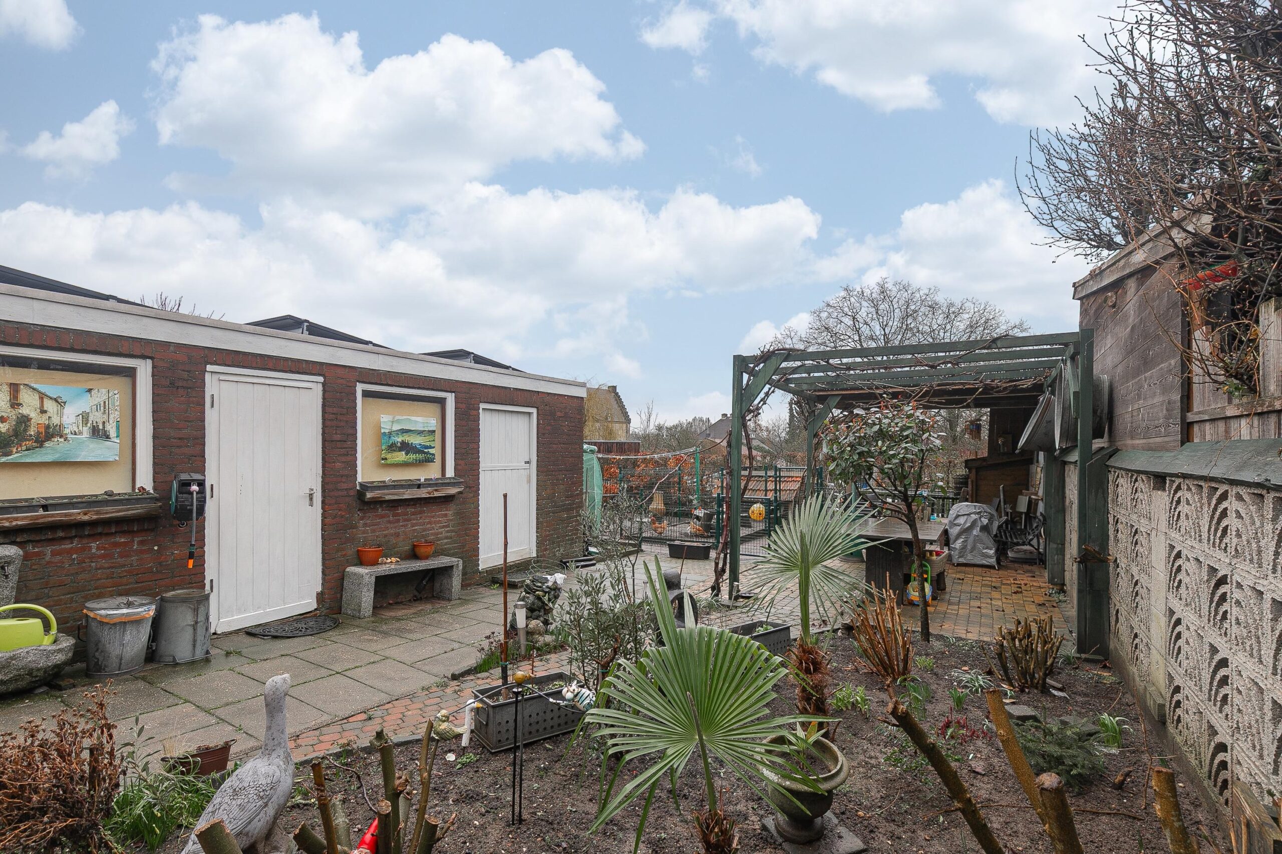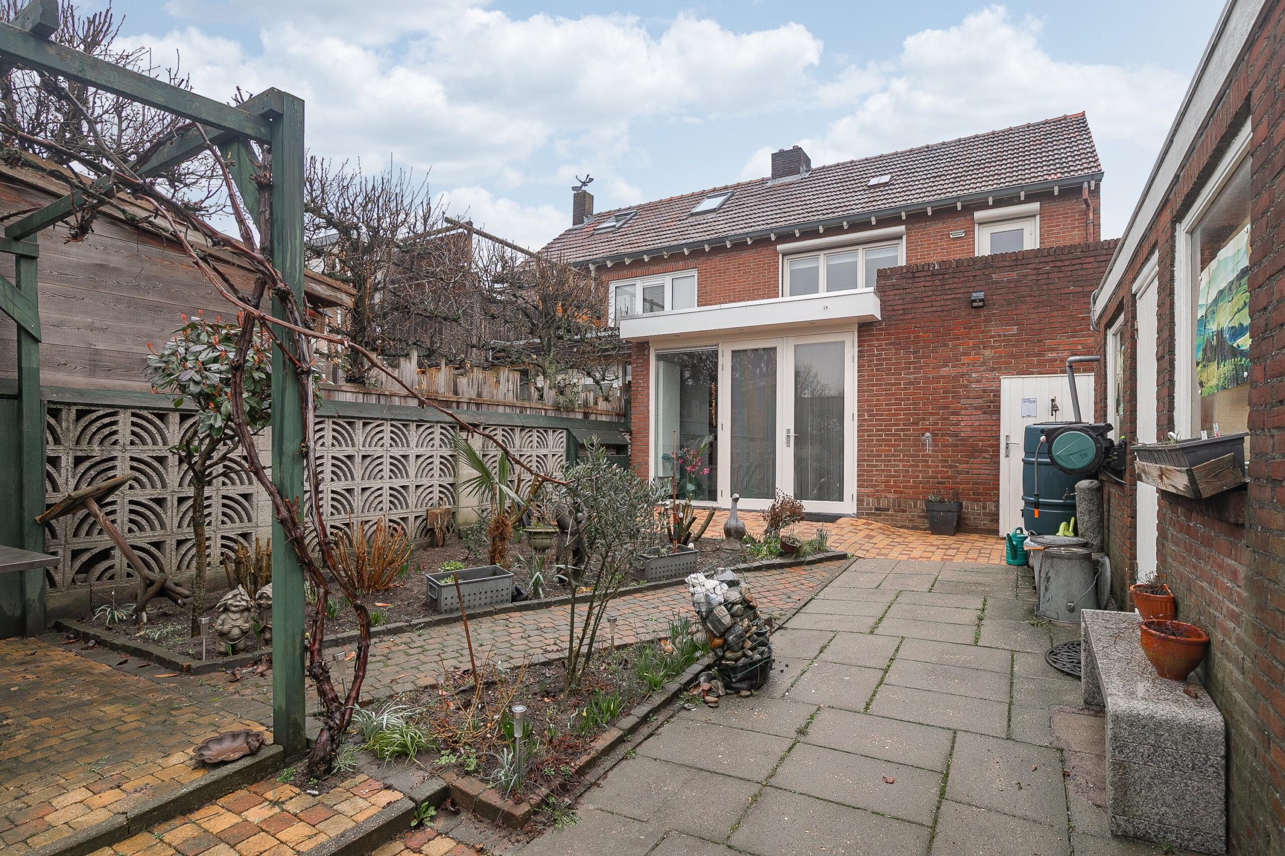 De ruime, volledig omsloten achtertuin is speels aangelegd met een combinatie van terras, bestrating en groen. Direct aan de woning ligt een terras met openslaande deuren vanuit de keuken. Achterin de tuin bevindt zich nog een extra zitplek en een overkapping. De tuin biedt toegang tot de garage en berging en heeft veel privacy.