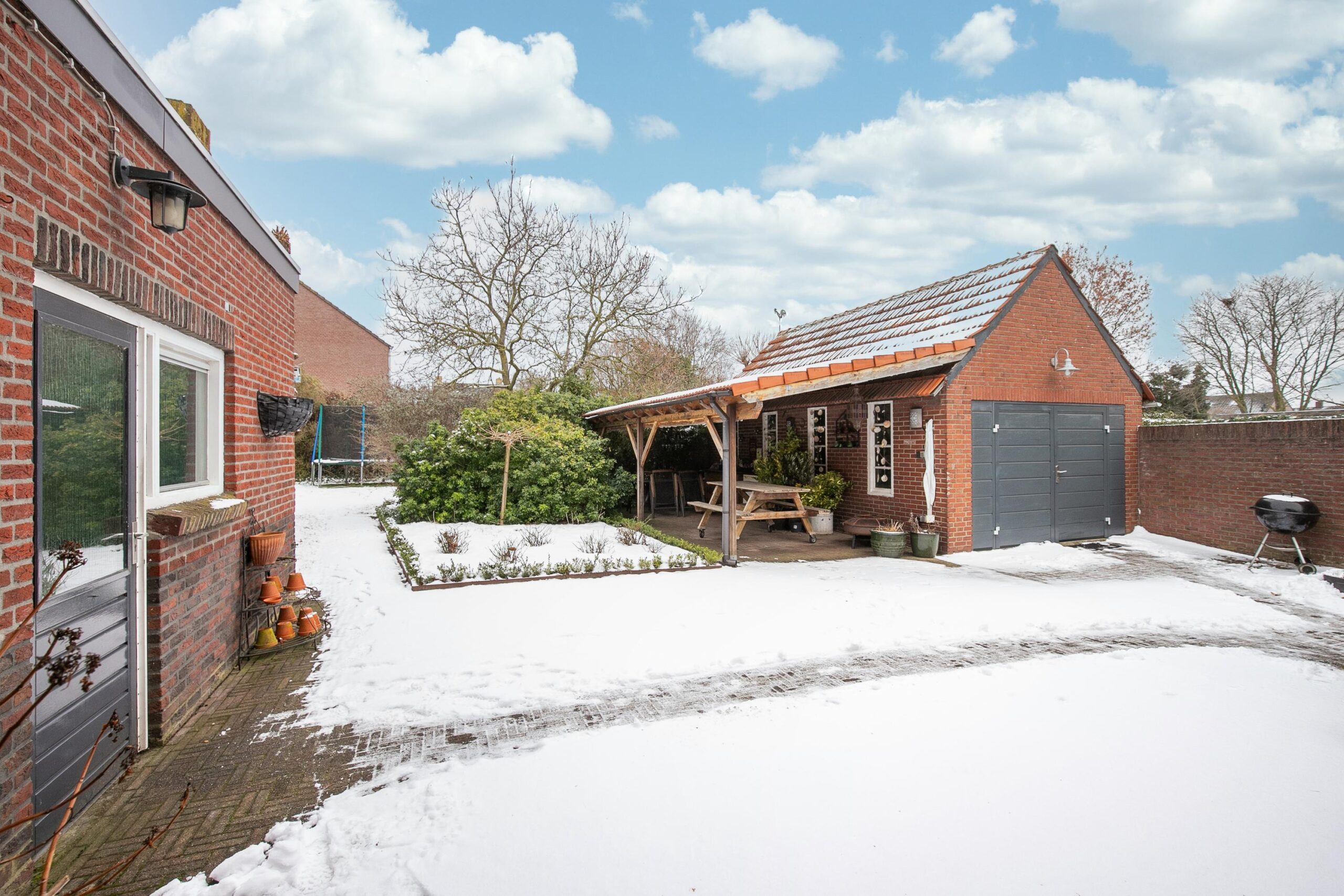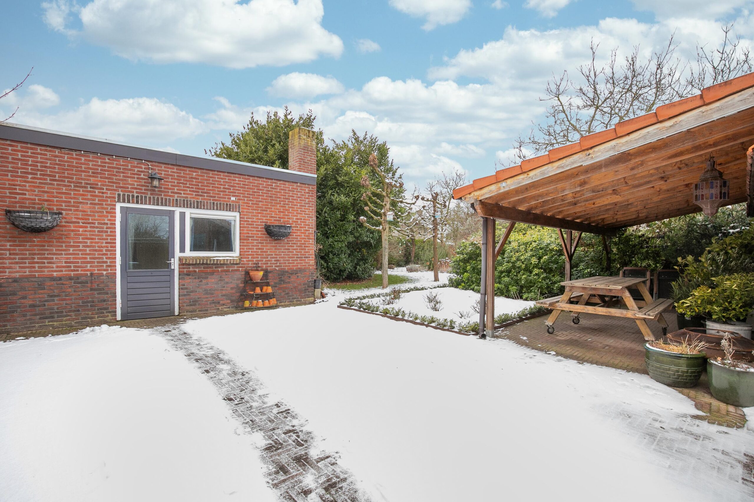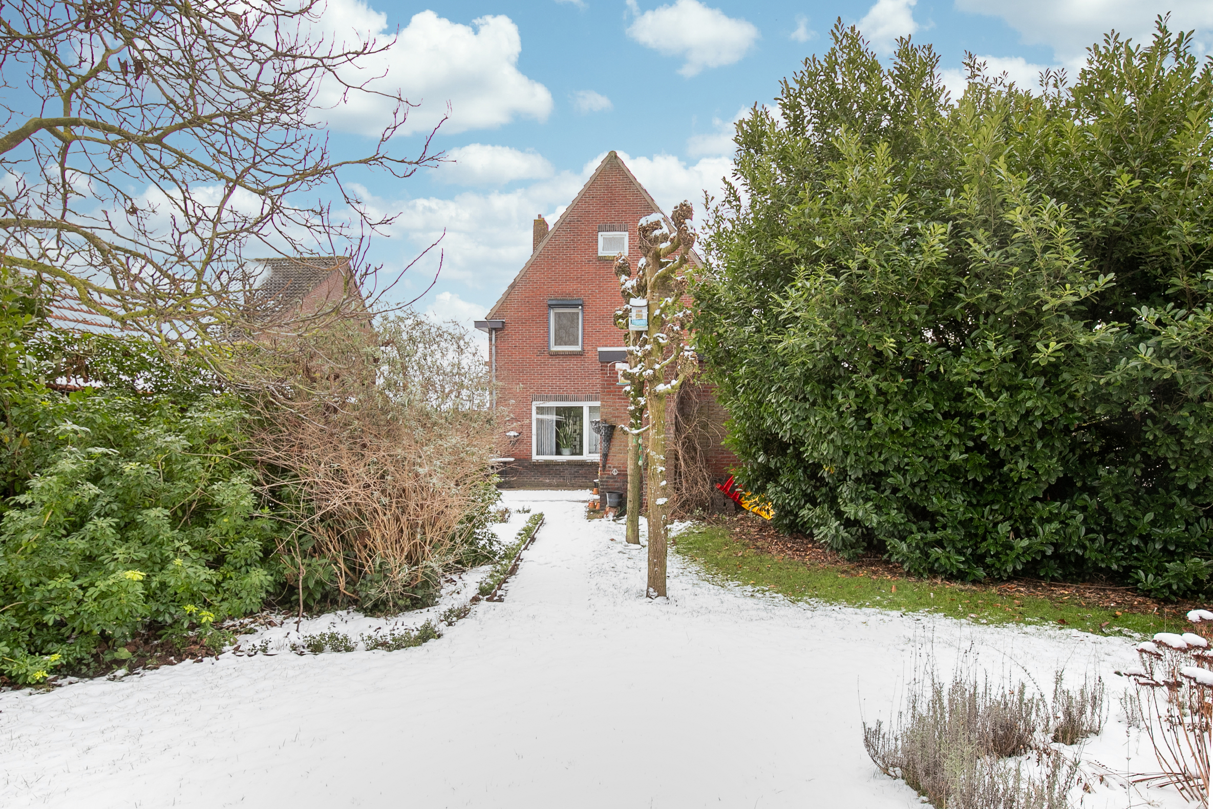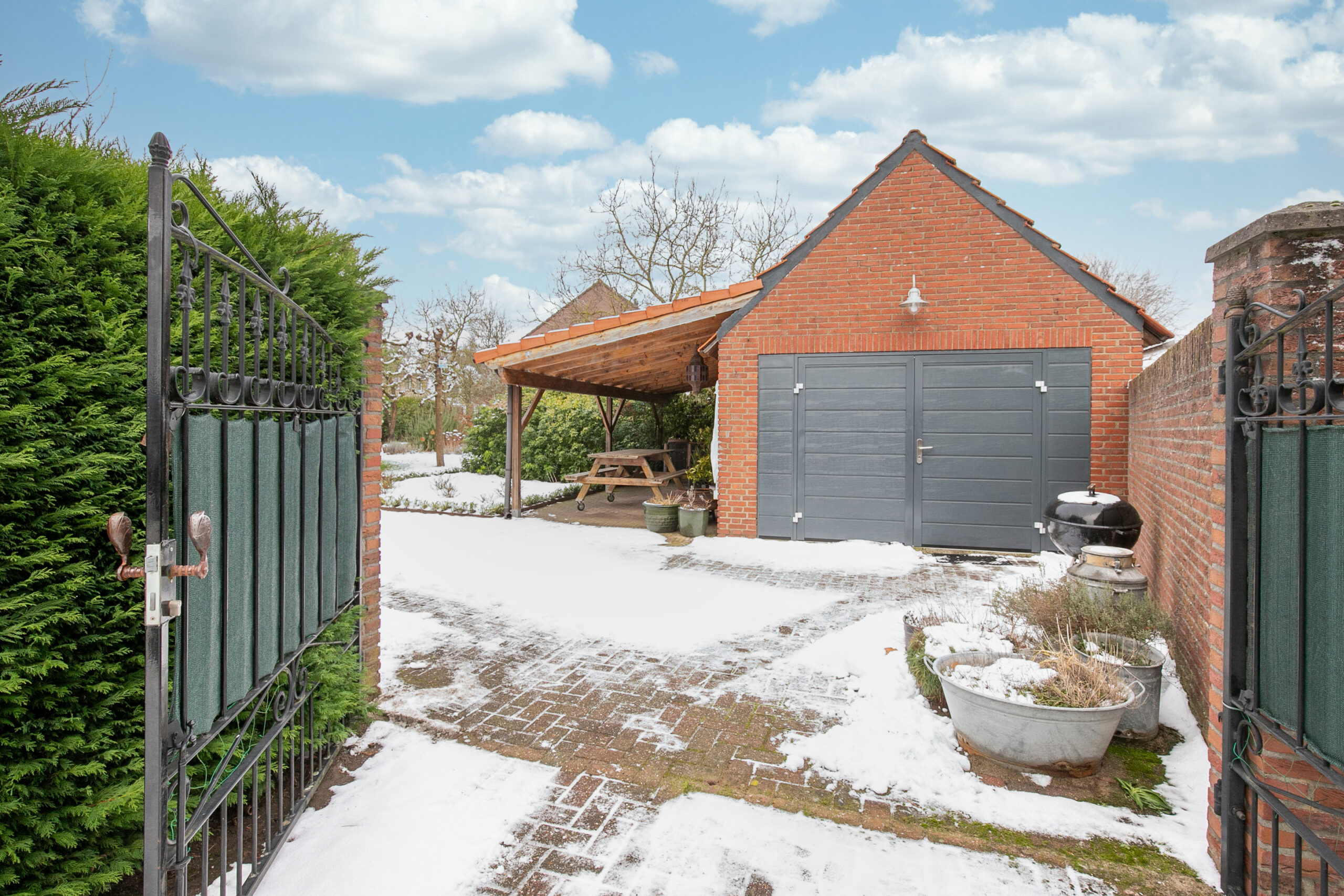 Het huis ligt mooi op het perceel, met aan beide zijden genoeg ruimte om het huis een mooie, statige aanblik te geven. Aan de rechterzijde van het huis ligt een brede oprit met toegangspoort, hier kunnen meerdere auto’s op eigen terrein geparkeerd worden. Er is een vrijstaande, gemetselde garage met pannen dak, deze is 7.18 x 3.90 en biedt veel opslagruimte. Naast de garage is een bijpassende, sfeervolle overkapping met pannen dak van 7.18 x 2.86, hier is gezellig buitenleven en genieten van de tuin. De achtertuin is geheel omsloten en biedt veel privacy. De tuin is ongeveer 20 meter diep en 20 meter breed.